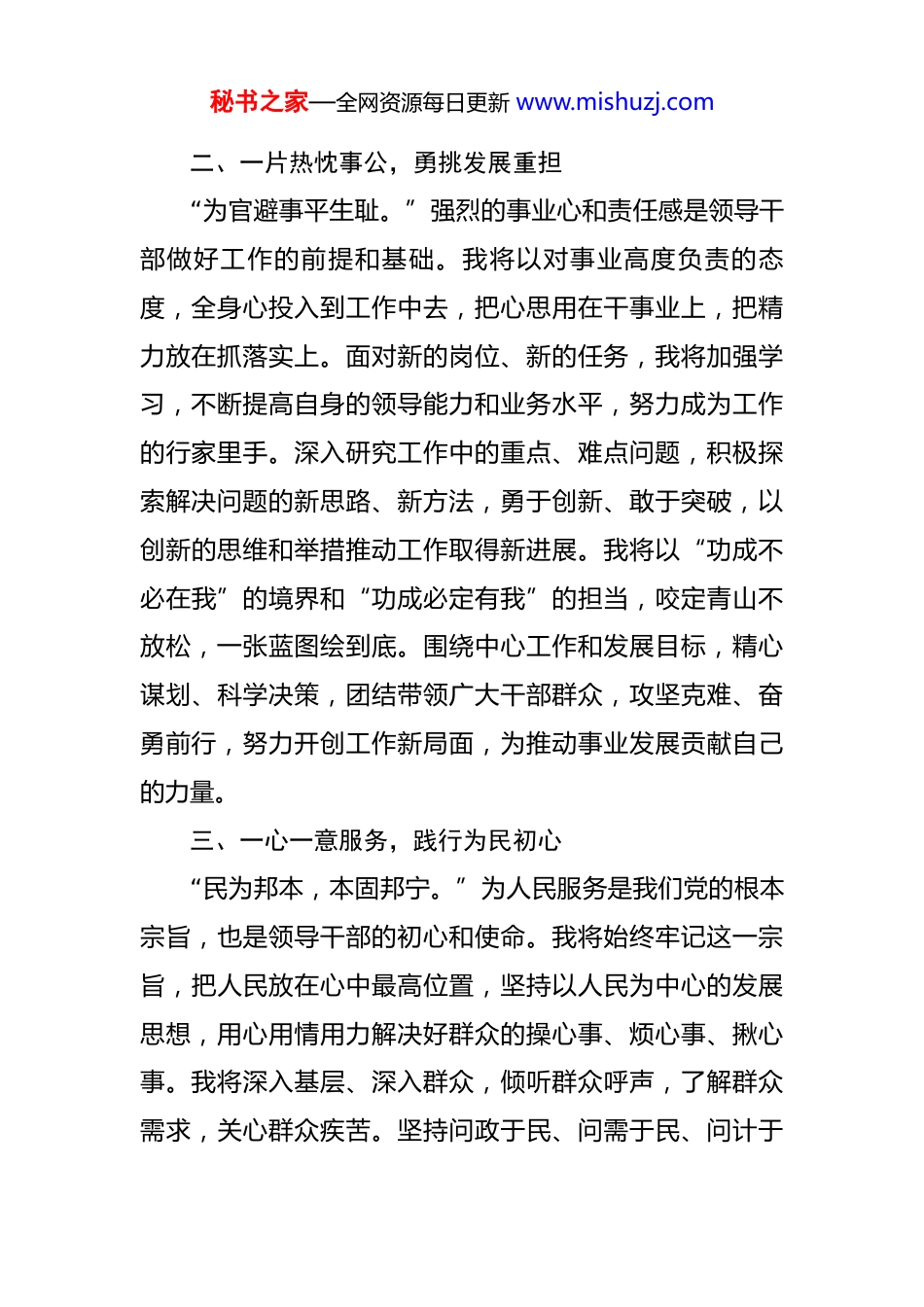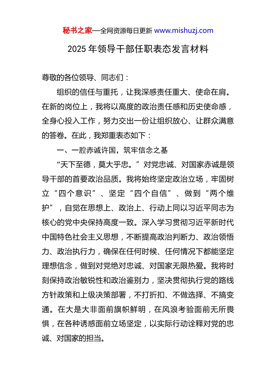 秘书之家—全网资源每日更新 www.mishuzj.com2025 年领导干部任职表态发言材料 尊敬的各位领导、同志们:组织的信任与重托,让我深感责任重大、使命在肩。在新的岗位上,我将以高度的政治责任感和历史使命感,全身心投入工作,努力交出一份让组织放心、让群众满意的答卷。在此,我郑重表态如下:一、一腔赤诚许国,筑牢信念之基“天下至德,莫大乎忠。”对党忠诚、对国家赤诚是领导干部的首要政治品质。我将始终坚定政治立场,牢固树立“四个意识”、坚定“四个自信”、做到“两个维护”,自觉在思想上、政治上、行动上同以习近平同志为核心的党中央保持高度一致。深入学习贯彻习近平新时代中国特色社会主义思想,不断提高政治判断力、政治领悟力、政治执行力,确保在任何时候、任何情况下都能坚定理想信念,做到对党绝对忠诚、对国家无限热爱。我将时刻保持政治敏锐性和政治鉴别力,坚决贯彻执行党的路线方针政策和上级决策部署,不打折扣、不做选择、不搞变通。在大是大非面前旗帜鲜明,在风浪考验面前无所畏惧,在各种诱惑面前立场坚定,以实际行动诠释对党的忠诚、对国家的担当。秘书之家—全网资源每日更新 www.mishuzj.com二、一片热忱事公,勇挑发展重担“为官避事平生耻。”强烈的事业心和责任感是领导干部做好工作的前提和基础。我将以对事业高度负责的态度,全身心投入到工作中去,把心思用在干事业上,把精力放在抓落实上。面对新的岗位、新的任务,我将加强学习,不断提高自身的领导能力和业务水平,努力成为工作的行家里手。深入研究工作中的重点、难点问题,积极探索解决问题的新思路、新方法,勇于创新、敢于突破,以创新的思维和举措推动工作取得新进展。我将以“功成不必在我”的境界和“功成必定有我”的担当,咬定青山不放松,一张蓝图绘到底。围绕中心工作和发展目标,精心谋划、科学决策,团结带领广大干部群众,攻坚克难、奋勇前行,努力开创工作新局面,为推动事业发展贡献自己的力量。三、一心一意服务,践行为民初心“民为邦本,本固邦宁。”为人民服务是我们党的根本宗旨,也是领导干部的初心和使命。我将始终牢记这一宗旨,把人民放在心中最高位置,坚持以人民为中心的发展思想,用心用情用力解决好群众的操心事、烦心事、揪心事。我将深入基层、深入群众,倾听群众呼声,了解群众需求,关心群众疾苦。坚持问政于民、问需于民、问计于秘书之家—全网资源每日更新 www.mishuzj.com民,从群众中来、到群众中去,使各项决策和工作更加符合群众的意愿和利益。我将不断提高服务群众的能力和水平,优化服务流程、提升服务质量,让群众办事更方便、更快捷、更舒心。以实际行动赢得群众的信任和支持,不断增强群众的获得感、幸福感、安全感。四、一以贯之实干,确保工作落地“空谈误国,实干兴邦。”执行力是领导干部的重要能力,抓落实是领导干部的重要职责。我将大力弘扬求真务实、真抓实干的工作作风,以钉钉子精神抓工作落实,确保各项工作任务按时、高质量完成。我将建立健全工作责任制,明确目标任务、责任分工和工作时限,加强对工作的跟踪督促和检查考核,确保工作有人抓、有人管、有人落实。对重点工作和重大项目,我将亲自研究、亲自部署、亲自推动,做到事事有回音、件件有着落。我将勇于担当、敢于负责,面对困难和挑战不退缩、不推诿,主动承担起应尽的责任。以踏石留印、抓铁有痕的劲头,一抓到底、善始善终,确保各项工作取得实实在在的成效。五、一身正气履职,严守纪律红线“公生明,廉生威。”廉洁自律是领导干部的为政之本、立身之基。我将严格遵守党的纪律和规矩,自觉遵守廉洁自律的各项规定,做到心有所畏、言有所戒、行有所秘书之家—全网资源每日更新 www.mishuzj.com止。我将加强自身修养,树立正确的权力观、地位观、利益观,自觉抵制各种腐朽思想的侵蚀。坚持依法用权、秉公用权、廉洁用权,不搞特权、不以权谋私,做到清清白白做人、干干净净做事。我将自觉接受组织和群众的监督,主动把权力关进制度的笼子里,让权力在阳光下运行。加强对亲属和身边工作人员的教育管理,严格要求他们遵守法律法规和廉洁自律的各项规定,共同...