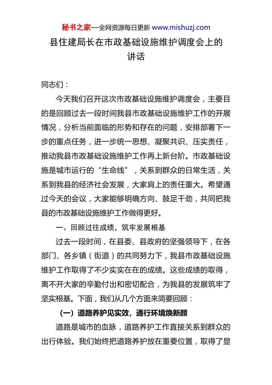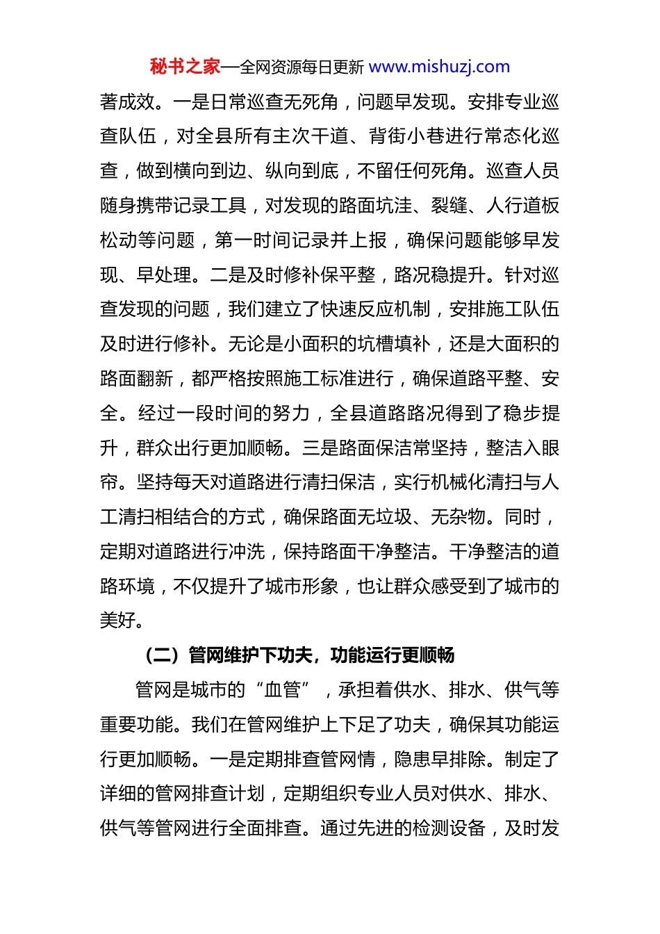 秘书之家—全网资源每日更新 www.mishuzj.com县住建局长在市政基础设施维护调度会上的讲话 同志们:今天我们召开这次市政基础设施维护调度会,主要目的是回顾过去一段时间我县市政基础设施维护工作的开展情况,分析当前面临的形势和存在的问题,安排部署下一步的重点任务,进一步统一思想、凝聚共识、压实责任,推动我县市政基础设施维护工作再上新台阶。市政基础设施是城市运行的“生命线”,关系到群众的日常生活,关系到我县的经济社会发展,大家肩上的责任重大。希望通过今天的会议,大家能够明确方向、鼓足干劲,共同把我县的市政基础设施维护工作做得更好。一、回顾过往成绩,筑牢发展根基过去一段时间,在县委、县政府的坚强领导下,在各部门、各乡镇(街道)的共同努力下,我县市政基础设施维护工作取得了不少实实在在的成绩。这些成绩的取得,离不开大家的辛勤付出和密切配合,为我县的发展筑牢了坚实根基。下面,我们从几个方面来简要回顾:(一)道路养护见实效,通行环境焕新颜道路是城市的血脉,道路养护工作直接关系到群众的出行体验。我们始终把道路养护放在重要位置,取得了显秘书之家—全网资源每日更新 www.mishuzj.com著成效。一是日常巡查无死角,问题早发现。安排专业巡查队伍,对全县所有主次干道、背街小巷进行常态化巡查,做到横向到边、纵向到底,不留任何死角。巡查人员随身携带记录工具,对发现的路面坑洼、裂缝、人行道板松动等问题,第一时间记录并上报,确保问题能够早发现、早处理。二是及时修补保平整,路况稳提升。针对巡查发现的问题,我们建立了快速反应机制,安排施工队伍及时进行修补。无论是小面积的坑槽填补,还是大面积的路面翻新,都严格按照施工标准进行,确保道路平整、安全。经过一段时间的努力,全县道路路况得到了稳步提升,群众出行更加顺畅。三是路面保洁常坚持,整洁入眼帘。坚持每天对道路进行清扫保洁,实行机械化清扫与人工清扫相结合的方式,确保路面无垃圾、无杂物。同时,定期对道路进行冲洗,保持路面干净整洁。干净整洁的道路环境,不仅提升了城市形象,也让群众感受到了城市的美好。(二)管网维护下功夫,功能运行更顺畅管网是城市的“血管”,承担着供水、排水、供气等重要功能。我们在管网维护上下足了功夫,确保其功能运行更加顺畅。一是定期排查管网情,隐患早排除。制定了详细的管网排查计划,定期组织专业人员对供水、排水、供气等管网进行全面排查。通过先进的检测设备,及时发秘书之家—全网资源每日更新 www.mishuzj.com现管网存在的泄漏、堵塞等隐患,并采取有效措施进行排除,避免了因管网问题引发的安全事故和居民生活不便。二是快速抢修降影响,保障不停歇。建立了管网抢修应急队伍,24 小时待命。一旦接到管网故障报告,抢修队伍能够在最短时间内赶到现场,迅速开展抢修工作。在抢修过程中,尽量减少对居民正常生活的影响,确保供水、供气等基本生活保障不停歇。三是管网疏通常态化,排水更畅通。针对雨季排水不畅的问题,我们将管网疏通工作常态化。定期对排水管网进行疏通清理,清除管内的淤泥、杂物,确保雨水能够顺利排出。在雨季来临前,还会对重点路段、易积水区域的管网进行重点疏通,有效缓解了城市内涝问题。一是水质监测严把关,饮水保安全。加强对供水水质的监测,建立了完善的水质监测体系。定期对水源水、出厂水、管网末梢水进行抽样检测,确保水质符合国家饮用水标准。同时,加强对供水设施的维护保养,防止水质受到污染,保障居民饮水安全。(三)绿化管护求精细,城市颜值再提升城市绿化是城市的“肺叶”,对改善城市生态环境、提升城市颜值具有重要作用。我们在绿化管护上追求精细,让城市颜值再提升。一是苗木修剪讲造型,景观更美观。安排专业的绿化工人对城市道路两侧、公园、广场等区域的苗木进行定期修剪。根据不同苗木的生长特点和景秘书之家—全网资源每日更新 www.mishuzj.com观需求,采用科学合理的修剪方式,塑造出美观的造型,提升了城市绿化的景观效果。二是浇水施肥按规律,苗木长势旺。根据季节变化和苗木生长情况,制定了合理的浇水、施肥计划。在干旱季节,增加...