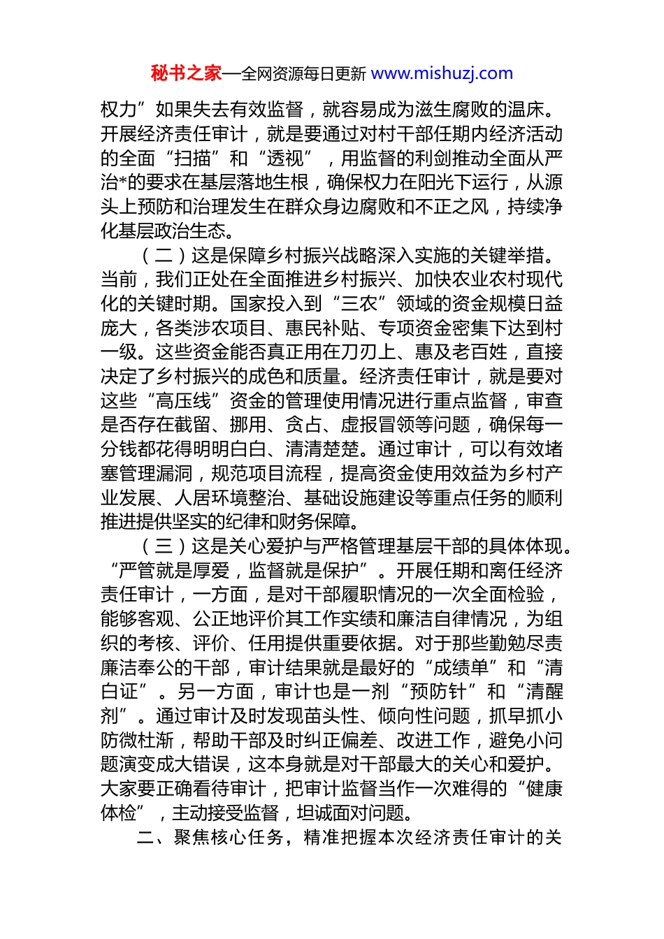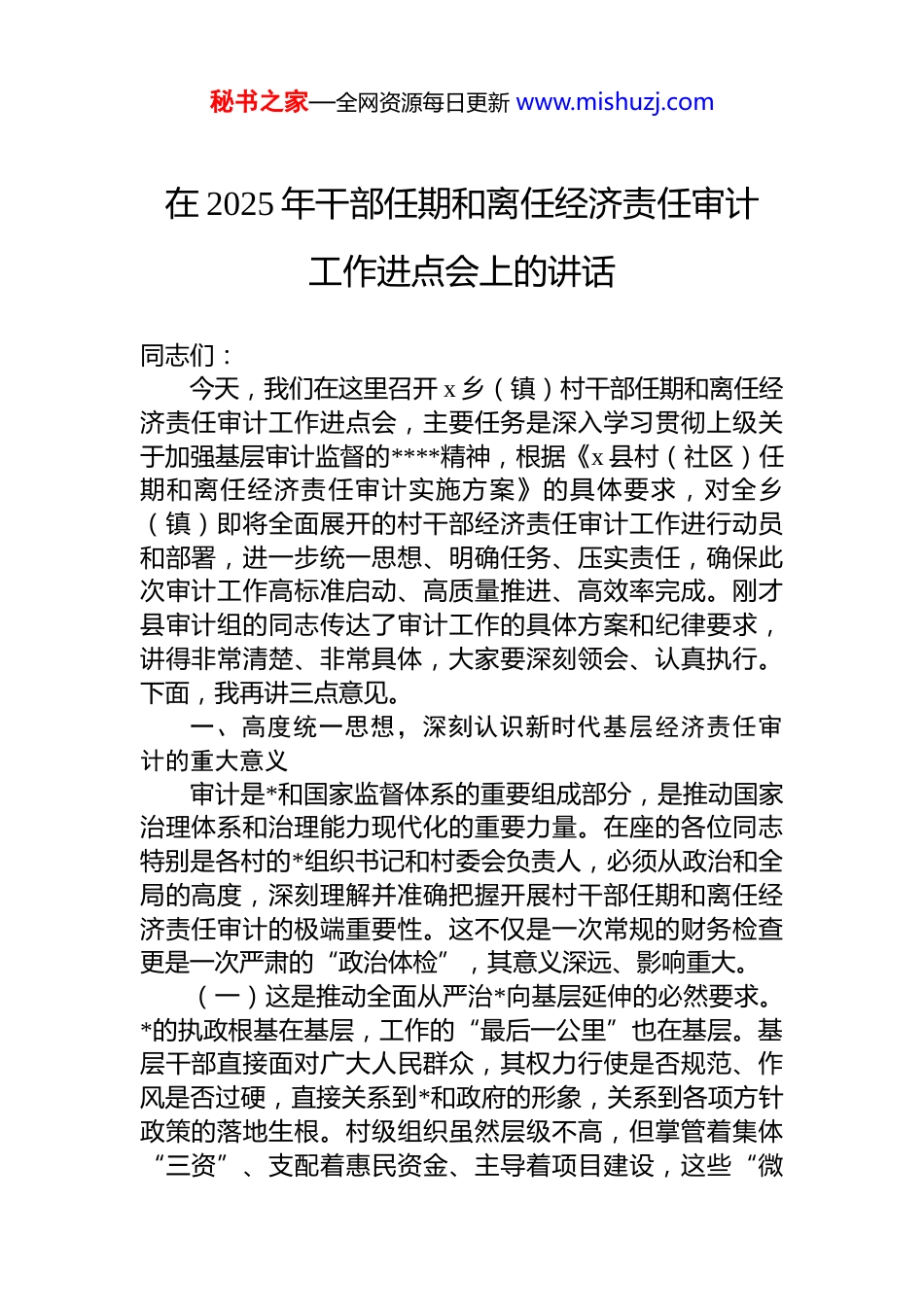 秘书之家—全网资源每日更新 www.mishuzj.com在 2025 年干部任期和离任经济责任审计工作进点会上的讲话同志们:今天,我们在这里召开 x 乡(镇)村干部任期和离任经济责任审计工作进点会,主要任务是深入学习贯彻上级关于加强基层审计监督的****精神,根据《x 县村(社区)任期和离任经济责任审计实施方案》的具体要求,对全乡(镇)即将全面展开的村干部经济责任审计工作进行动员和部署,进一步统一思想、明确任务、压实责任,确保此次审计工作高标准启动、高质量推进、高效率完成。刚才县审计组的同志传达了审计工作的具体方案和纪律要求,讲得非常清楚、非常具体,大家要深刻领会、认真执行。下面,我再讲三点意见。一、高度统一思想,深刻认识新时代基层经济责任审计的重大意义审计是*和国家监督体系的重要组成部分,是推动国家治理体系和治理能力现代化的重要力量。在座的各位同志特别是各村的*组织书记和村委会负责人,必须从政治和全局的高度,深刻理解并准确把握开展村干部任期和离任经济责任审计的极端重要性。这不仅是一次常规的财务检查更是一次严肃的“政治体检”,其意义深远、影响重大。(一)这是推动全面从严治*向基层延伸的必然要求。*的执政根基在基层,工作的“最后一公里”也在基层。基层干部直接面对广大人民群众,其权力行使是否规范、作风是否过硬,直接关系到*和政府的形象,关系到各项方针政策的落地生根。村级组织虽然层级不高,但掌管着集体“三资”、支配着惠民资金、主导着项目建设,这些“微秘书之家—全网资源每日更新 www.mishuzj.com权力”如果失去有效监督,就容易成为滋生腐败的温床。开展经济责任审计,就是要通过对村干部任期内经济活动的全面“扫描”和“透视”,用监督的利剑推动全面从严治*的要求在基层落地生根,确保权力在阳光下运行,从源头上预防和治理发生在群众身边腐败和不正之风,持续净化基层政治生态。(二)这是保障乡村振兴战略深入实施的关键举措。当前,我们正处在全面推进乡村振兴、加快农业农村现代化的关键时期。国家投入到“三农”领域的资金规模日益庞大,各类涉农项目、惠民补贴、专项资金密集下达到村一级。这些资金能否真正用在刀刃上、惠及老百姓,直接决定了乡村振兴的成色和质量。经济责任审计,就是要对这些“高压线”资金的管理使用情况进行重点监督,审查是否存在截留、挪用、贪占、虚报冒领等问题,确保每一分钱都花得明明白白、清清楚楚。通过审计,可以有效堵塞管理漏洞,规范项目流程,提高资金使用效益为乡村产业发展、人居环境整治、基础设施建设等重点任务的顺利推进提供坚实的纪律和财务保障。(三)这是关心爱护与严格管理基层干部的具体体现。“严管就是厚爱,监督就是保护”。开展任期和离任经济责任审计,一方面,是对干部履职情况的一次全面检验,能够客观、公正地评价其工作实绩和廉洁自律情况,为组织的考核、评价、任用提供重要依据。对于那些勤勉尽责廉洁奉公的干部,审计结果就是最好的“成绩单”和“清白证”。另一方面,审计也是一剂“预防针”和“清醒剂”。通过审计及时发现苗头性、倾向性问题,抓早抓小防微杜渐,帮助干部及时纠正偏差、改进工作,避免小问题演变成大错误,这本身就是对干部最大的关心和爱护。大家要正确看待审计,把审计监督当作一次难得的“健康体检”,主动接受监督,坦诚面对问题。二、聚焦核心任务,精准把握本次经济责任审计的关秘书之家—全网资源每日更新 www.mishuzj.com键环节本次审计工作时间紧、任务重、要求高、涉及面广。审计组要严格按照《x 县村(社区)任期和离任经济责任审计实施方案》的要求,各村要全力配合,确保审计工作不跑偏、不走样,真正审深、审透、审出实效。根据方案精神和工作实际,此次审计要重点把握好以下三个方面。(一)紧盯“责任”二字,审查履职尽责的实际成效。经济责任审计,核心是“责任”。不能简单地将审计等同于查账,而是要透过账本看责任、看担当、看作为。要重点关注各村在任期内经济社会发展目标的完成情况。比如村级集体经济是否发展壮大,资产保值增值目标是否实现村民的人均可支配收入是否有稳定增长;...