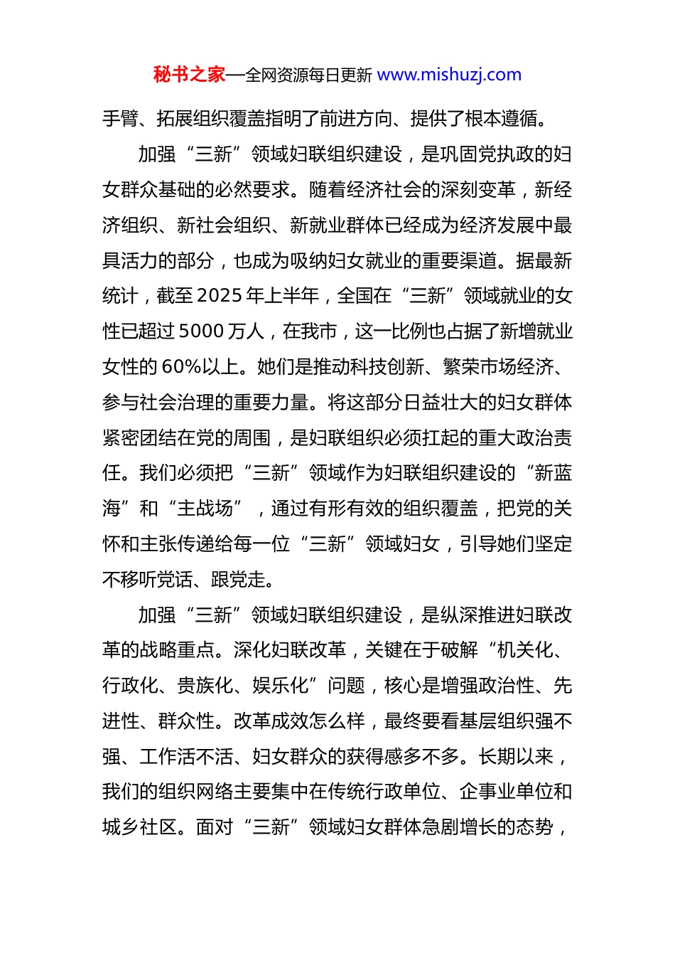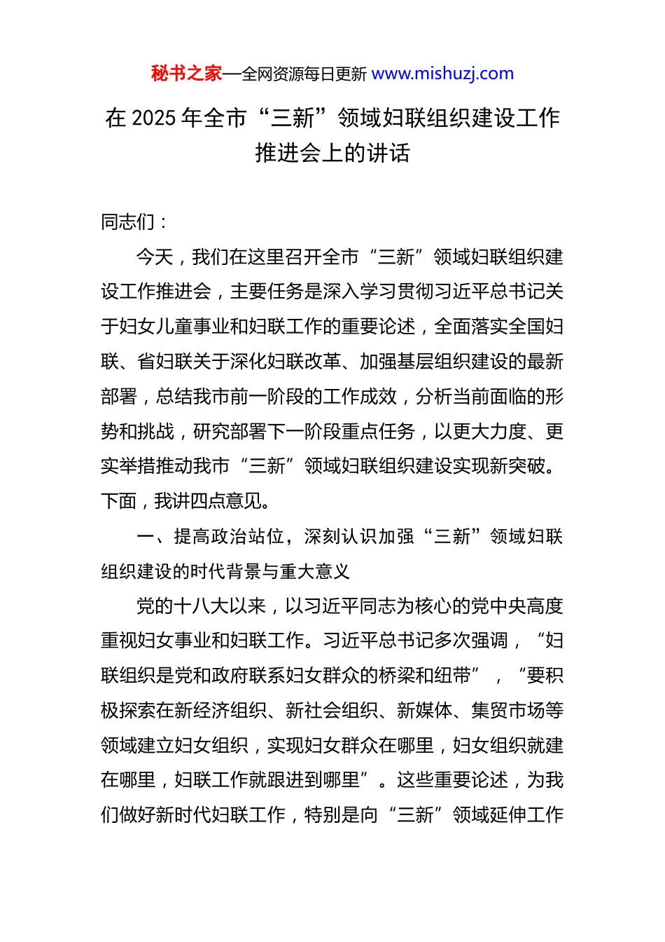 秘书之家—全网资源每日更新 www.mishuzj.com在 2025 年全市“三新”领域妇联组织建设工作推进会上的讲话 同志们:今天,我们在这里召开全市“三新”领域妇联组织建设工作推进会,主要任务是深入学习贯彻习近平总书记关于妇女儿童事业和妇联工作的重要论述,全面落实全国妇联、省妇联关于深化妇联改革、加强基层组织建设的最新部署,总结我市前一阶段的工作成效,分析当前面临的形势和挑战,研究部署下一阶段重点任务,以更大力度、更实举措推动我市“三新”领域妇联组织建设实现新突破。下面,我讲四点意见。一、提高政治站位,深刻认识加强“三新”领域妇联组织建设的时代背景与重大意义党的十八大以来,以习近平同志为核心的党中央高度重视妇女事业和妇联工作。习近平总书记多次强调,“妇联组织是党和政府联系妇女群众的桥梁和纽带”,“要积极探索在新经济组织、新社会组织、新媒体、集贸市场等领域建立妇女组织,实现妇女群众在哪里,妇女组织就建在哪里,妇联工作就跟进到哪里”。这些重要论述,为我们做好新时代妇联工作,特别是向“三新”领域延伸工作秘书之家—全网资源每日更新 www.mishuzj.com手臂、拓展组织覆盖指明了前进方向、提供了根本遵循。加强“三新”领域妇联组织建设,是巩固党执政的妇女群众基础的必然要求。随着经济社会的深刻变革,新经济组织、新社会组织、新就业群体已经成为经济发展中最具活力的部分,也成为吸纳妇女就业的重要渠道。据最新统计,截至 2025 年上半年,全国在“三新”领域就业的女性已超过 5000 万人,在我市,这一比例也占据了新增就业女性的 60%以上。她们是推动科技创新、繁荣市场经济、参与社会治理的重要力量。将这部分日益壮大的妇女群体紧密团结在党的周围,是妇联组织必须扛起的重大政治责任。我们必须把“三新”领域作为妇联组织建设的“新蓝海”和“主战场”,通过有形有效的组织覆盖,把党的关怀和主张传递给每一位“三新”领域妇女,引导她们坚定不移听党话、跟党走。加强“三新”领域妇联组织建设,是纵深推进妇联改革的战略重点。深化妇联改革,关键在于破解“机关化、行政化、贵族化、娱乐化”问题,核心是增强政治性、先进性、群众性。改革成效怎么样,最终要看基层组织强不强、工作活不活、妇女群众的获得感多不多。长期以来,我们的组织网络主要集中在传统行政单位、企事业单位和城乡社区。面对“三新”领域妇女群体急剧增长的态势,秘书之家—全网资源每日更新 www.mishuzj.com如果我们不能及时跟进、有效覆盖,妇联组织的群众基础就可能被削弱,桥梁纽带作用就可能打折扣。因此,向“三新”领域进军,是妇联组织自我革新、强基固本的破题之举,也是衡量我们改革是否“落地见效”的关键标尺。加强“三新”领域妇联组织建设,是精准服务妇女群众的现实需要。“三新”领域的妇女群体呈现出年轻化、高知化、职业多元化、需求个性化等新特点。她们在职业发展、权益维护、婚恋交友、家庭教育、身心健康等方面,面临着许多新情况、新问题。比如,平台女骑手、女主播等灵活就业女性的劳动保障问题,女性科创人才的成长发展瓶颈问题,社会组织女性负责人的能力提升问题等,都需要我们提供更加精准、专业、高效的服务。建立妇联组织,就是要打造一个离她们最近、最懂她们、最能帮助她们的“娘家”,及时了解她们的所思所想所盼,有效回应她们的急难愁盼,把服务送到她们最需要的地方,切实增强她们的获得感、幸福感、安全感。二、聚焦重点任务,精准施策破解“三新”领域妇联组织建设的难点堵点推进“三新”领域妇联组织建设是一项系统工程,既要扩大覆盖面,更要提升组织力。截至 2025 年上半年,全市已在“三新”领域建立妇联组织近 1800 个,取得了一定秘书之家—全网资源每日更新 www.mishuzj.com成效,但依然存在覆盖不均衡、作用发挥不充分、队伍活力不足等问题。我们必须坚持问题导向,精准施策,务求实效。(一)坚持党建引领,实现“两个覆盖”同频共振。党建是做好一切工作的根本保证,“三新”领域妇联组织建设必须紧紧跟上党建的步伐。要主动融入党建工作大局,建立健全与组织、市监、民政、商务...