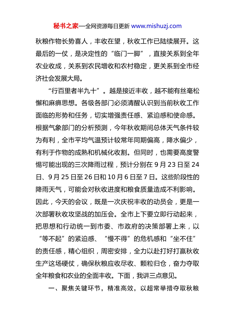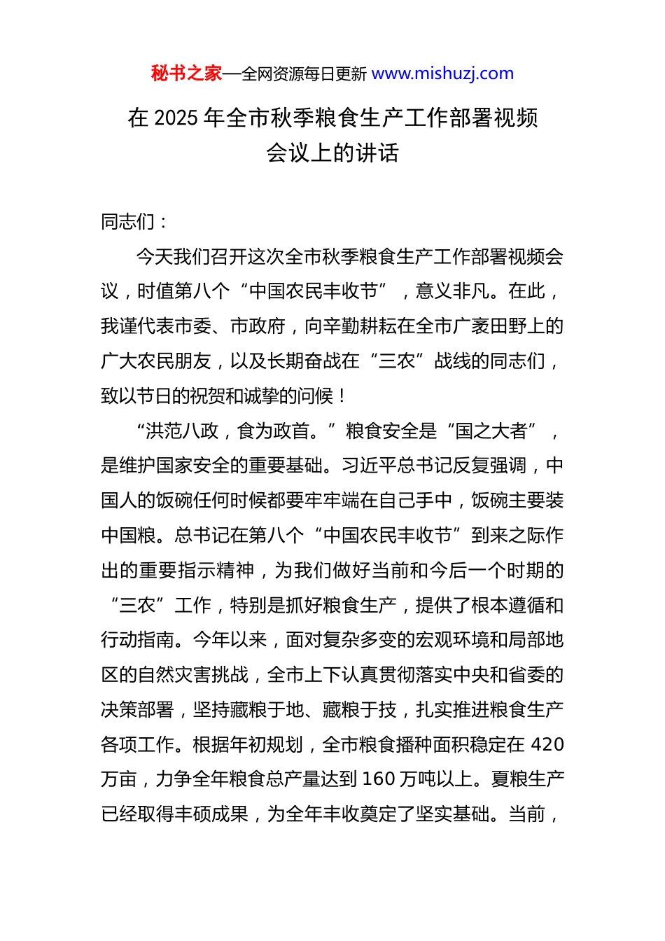 秘书之家—全网资源每日更新 www.mishuzj.com在 2025 年全市秋季粮食生产工作部署视频会议上的讲话 同志们:今天我们召开这次全市秋季粮食生产工作部署视频会议,时值第八个“中国农民丰收节”,意义非凡。在此,我谨代表市委、市政府,向辛勤耕耘在全市广袤田野上的广大农民朋友,以及长期奋战在“三农”战线的同志们,致以节日的祝贺和诚挚的问候!“洪范八政,食为政首。”粮食安全是“国之大者”,是维护国家安全的重要基础。习近平总书记反复强调,中国人的饭碗任何时候都要牢牢端在自己手中,饭碗主要装中国粮。总书记在第八个“中国农民丰收节”到来之际作出的重要指示精神,为我们做好当前和今后一个时期的“三农”工作,特别是抓好粮食生产,提供了根本遵循和行动指南。今年以来,面对复杂多变的宏观环境和局部地区的自然灾害挑战,全市上下认真贯彻落实中央和省委的决策部署,坚持藏粮于地、藏粮于技,扎实推进粮食生产各项工作。根据年初规划,全市粮食播种面积稳定在 420万亩,力争全年粮食总产量达到 160 万吨以上。夏粮生产已经取得丰硕成果,为全年丰收奠定了坚实基础。当前,秘书之家—全网资源每日更新 www.mishuzj.com秋粮作物长势喜人,丰收在望,秋收工作已陆续展开。这最后的一仗,是决定性的“临门一脚”,直接关系到全年农业收成,关系到农民增收和农村稳定,更关系到全市经济社会发展大局。“行百里者半九十”。越是接近丰收,越不能有丝毫松懈和麻痹思想。各级各部门必须清醒认识到当前秋收工作面临的形势和任务,切实增强责任感、紧迫感和使命感。根据气象部门的分析预测,今年秋收期间总体天气条件较为有利,全市平均气温预计较常年同期偏高,降水偏少,有利于作物的成熟和机械化收割。但同时,也需要高度警惕可能出现的三次降雨过程,预计分别在 9 月 23 日至 24日、9 月 25 日至 26 日和 10 月 6 日至 7 日。这些阶段性的降雨天气,可能会对秋收进度和粮食质量造成不利影响。因此,今天的会议,既是一次庆祝丰收的动员会,更是一次部署秋收攻坚战的加压会。全市上下要立即行动起来,把思想和行动统一到市委、市政府的决策部署上来,以“等不起”的紧迫感、“慢不得”的危机感和“坐不住”的责任感,精心组织,周密安排,全力以赴打好打赢秋收生产这场硬仗,确保秋粮应收尽收、颗粒归仓,奋力夺取全年粮食和农业的全面丰收。下面,我讲三点意见。一、聚焦关键环节,精准高效,以超常举措夺取秋粮秘书之家—全网资源每日更新 www.mishuzj.com丰收秋收工作是一项系统工程,环环相扣,一个环节出问题就可能影响全局。必须坚持问题导向和目标导向,抓住关键,精准施策,确保各项工作落到实处、取得实效。第一,突出一个“抢”字,全力以赴加快收获进度。时间就是产量,速度就是效益。面对有限的晴好天气窗口期,必须与时间赛跑,与天气竞速。首先,要科学研判收获时机。农业农村部门要组织技术专家深入田间地头,准确掌握不同区域、不同品种作物的成熟度,科学制定收获计划,明确最佳收获期,指导农民群众按照“成熟一块、抢收一块”的原则,梯次推进,避免因等待或盲目抢收造成不必要的损失。其次,要高效组织机械力量。充分发挥农业机械在秋收中的主力军作用。要提前对全市范围内的收割机、拖拉机、秸秆处理机等农机具进行全面摸排和检修,确保机具状态良好、随时可用。要积极搭建供需对接平台,促进农机在市内跨区域作业,有效解决部分地区机具不足的问题。要成立农机应急服务队,随时应对可能出现的机械故障。对于一些地块零散、机械难以进入的区域,要充分发挥基层党组织的战斗堡垒作用和党员的先锋模范作用,组织发动群众互助组、志愿服务队,通过人机结合的方式,确保不漏一户、不落一田。秘书之家—全网资源每日更新 www.mishuzj.com第二,贯穿一个“优”字,统筹推进提升生产质量。秋收不仅要追求数量,更要注重质量和效益,实现农业生产的可持续发展。要将秋收与秋整地、高标准农田建设等工作一体谋划、协同推进。一是抓好减损增效。在收获环节,要大力推广应用低损耗收获技术和机具,加强对农机手的操作培训,严格规...