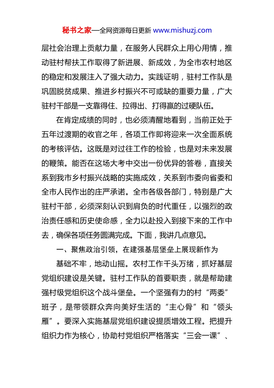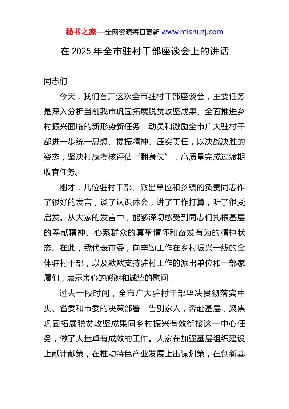 秘书之家—全网资源每日更新 www.mishuzj.com在 2025 年全市驻村干部座谈会上的讲话 同志们:今天,我们召开这次全市驻村干部座谈会,主要任务是深入分析当前我市巩固拓展脱贫攻坚成果、全面推进乡村振兴面临的新形势新任务,动员和激励全市广大驻村干部进一步统一思想、提振精神、压实责任,以决战决胜的姿态,坚决打赢考核评估“翻身仗”,高质量完成过渡期收官任务。刚才,几位驻村干部、派出单位和乡镇的负责同志作了很好的发言,谈了认识体会,讲了工作打算,听了很受启发。从大家的发言中,能够深切感受到同志们扎根基层的奉献精神、心系群众的真挚情怀和奋发有为的精神状态。在此,我代表市委,向辛勤工作在乡村振兴一线的全体驻村干部,以及默默支持驻村工作的派出单位和干部家属们,表示衷心的感谢和诚挚的慰问!过去一段时间,全市广大驻村干部坚决贯彻落实中央、省委和市委的决策部署,告别家人,奔赴基层,聚焦巩固拓展脱贫攻坚成果同乡村振兴有效衔接这一中心任务,做了大量卓有成效的工作。大家在加强基层组织建设上献计献策,在推动特色产业发展上出谋划策,在创新基秘书之家—全网资源每日更新 www.mishuzj.com层社会治理上贡献力量,在服务人民群众上用心用情,推动驻村帮扶工作取得了新进展、新成效,为全市农村地区的稳定和发展注入了强大动力。实践证明,驻村工作队是巩固脱贫成果、推进乡村振兴不可或缺的重要力量,广大驻村干部是一支靠得住、拉得出、打得赢的过硬队伍。在肯定成绩的同时,也必须清醒地看到,当前正处于五年过渡期的收官之年,各项工作即将迎来一次全面系统的考核评估。这既是对过往工作的检验,也是对未来发展的鞭策。能否在这场大考中交出一份优异的答卷,直接关系到我市乡村振兴战略的实施成效,关系到市委向省委和全市人民作出的庄严承诺。全市各级各部门,特别是广大驻村干部,必须深刻认识到肩负的时代重任,以强烈的政治责任感和历史使命感,全力以赴投入到接下来的工作中去,确保各项任务圆满完成。下面,我讲几点意见。一、聚焦政治引领,在建强基层堡垒上展现新作为基础不牢,地动山摇。农村工作千头万绪,抓好基层党组织建设是关键。驻村工作队的首要职责,就是帮助建强村级党组织这个战斗堡垒。一个坚强有力的村“两委”班子,是带领群众奔向美好生活的“主心骨”和“领头雁”。要深入实施基层党组织建设提质增效工程。把提升组织力作为核心,协助村党组织严格落实“三会一课”、秘书之家—全网资源每日更新 www.mishuzj.com主题党日、组织生活会等基本制度,推动党内政治生活规范化、常态化、制度化。要帮助村党组织理清发展思路,把党的政治优势、组织优势转化为推动发展的强大动能。要善于发现和培养农村优秀人才,特别是年轻党员和致富带头人,下大力气抓好村级后备力量的培育和储备工作,为农村事业发展蓄足“源头活水”。当前,要特别注重协助乡镇党委,统筹做好村“两委”换届的前期准备工作,确保选出群众信赖、能力过硬的优秀带头人。驻村干部自身要不断加强理论学习,提高政治站位,自觉成为党的创新理论的坚定信仰者和忠实践行者,用自身的模范行动影响和带动村“两委”班子和广大党员干部。二、聚焦产业兴旺,在推进强村富民上实现新突破产业振兴是乡村振兴的重中之重,也是巩固拓展脱贫攻坚成果的治本之策。没有产业的支撑,村集体经济就是无源之水,群众增收就是无本之木。驻村干部身处一线,最了解村情民意,最熟悉资源禀赋,要在推动产业发展上当好“参谋员”“联络员”和“战斗员”。要立足各村实际,协助乡村两级干部科学谋划产业发展。要紧紧围绕市委提出的“大规划、大基地、大融合、大发展”工作思路,聚焦做大做强我市的*、*、*、*等特色优势产业,帮助所驻村找准定位,明确发展方向。要积极发挥桥梁纽带秘书之家—全网资源每日更新 www.mishuzj.com作用,主动对接派出单位和外部资源,在争取项目、引进技术、开拓市场等方面多想办法、多出实招。要着眼于长远发展,不能搞短期行为,更不能搞华而不实的面子工程,要确保每一个产业项目都能经得起时间和实践的检验。同时,要致力于完善联农带农机制...