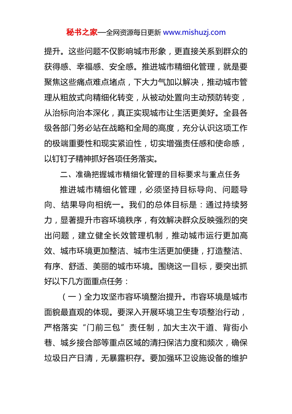 秘书之家—全网资源每日更新 www.mishuzj.com在 2025 年全县城市精细化管理动员部署会上的讲话 同志们:今天我们召开全县城市精细化管理动员部署会议,主要任务是深入分析当前城市管理面临的新形势新要求,全面部署推进城市精细化管理的各项重点任务,动员全县上下进一步统一思想、凝聚共识,以更高标准、更实举措、更严作风,奋力开创我县城市管理工作新局面。下面,我讲几点意见。一、深刻认识推进城市精细化管理的重要意义城市是经济社会发展的重要载体,是人民群众安居乐业的美好家园。推动城市管理向精细化转变,是提升城市治理现代化水平的必然要求,是改善人居环境、增进民生福祉的重要举措,更是推动我县高质量发展、创造高品质生活的内在需要。近年来,我县城市建设取得显著成效,城市框架不断拉大,功能日趋完善,面貌持续改观。但对照高质量发展要求和人民日益增长的美好生活需要,城市管理工作中仍然存在一些突出问题和短板。占道经营、车辆乱停、垃圾乱扔等现象仍时有发生,部分区域环境卫生存在死角盲区,公共服务响应效率和处置能力有待进一步秘书之家—全网资源每日更新 www.mishuzj.com提升。这些问题不仅影响城市形象,更直接关系到群众的获得感、幸福感、安全感。推进城市精细化管理,就是要聚焦这些痛点难点堵点,下大力气加以解决,推动城市管理从粗放式向精细化转变,从被动处置向主动预防转变,从治标向治本深化,真正实现城市让生活更美好。全县各级各部门务必站在战略和全局的高度,充分认识这项工作的极端重要性和现实紧迫性,切实增强责任感和使命感,以钉钉子精神抓好各项任务落实。二、准确把握城市精细化管理的目标要求与重点任务推进城市精细化管理,必须坚持目标导向、问题导向、结果导向相统一。我们的总体目标是:通过持续努力,显著提升市容环境秩序,有效解决群众反映强烈的突出问题,建立健全长效管理机制,推动城市运行更加高效、城市环境更加整洁、城市生活更加便捷,打造整洁、有序、舒适、美丽的城市环境。围绕这一目标,要突出抓好以下几方面重点任务:(一)全力攻坚市容环境整治提升。市容环境是城市面貌最直观的体现。要深入开展环境卫生专项整治行动,严格落实“门前三包”责任制,加大主次干道、背街小巷、城乡接合部等重点区域的清扫保洁力度和频次,确保垃圾日产日清,无暴露积存。要加强环卫设施设备的维护秘书之家—全网资源每日更新 www.mishuzj.com更新,提升作业机械化、智能化水平。要聚焦乱张贴、乱涂写、乱悬挂等“城市牛皮癣”问题,加强清理整治和源头管控。要大力推进垃圾分类工作,加强宣传引导,完善分类投放、收集、运输、处理体系,培养居民良好习惯。(二)大力规范交通秩序与停车管理。交通秩序是城市运行效率的关键。要持续开展机动车、非机动车乱停乱放专项整治,科学施划、增补停车泊位,探索利用闲置地块建设临时停车场,最大限度满足停车需求。要加强重点路段、重点时段交通疏导,严查违法停车行为。要优化共享单车投放和管理,规范停放秩序。要完善交通标志标线等设施,保障行人、车辆通行安全顺畅。(三)严格治理市场经营秩序。占道经营、流动摊贩等问题既影响市容,也阻碍交通。要坚持疏堵结合、标本兼治,合理划定、规范管理便民经营区域,引导流动商贩入场入市经营。要加强对临街商铺出店经营行为的监管,坚决取缔主次干道、学校周边、广场公园等重点区域的违规占道经营现象。要规范早市、夜市管理,明确经营时间、区域和卫生要求,做到活而不乱、便民不扰民。(四)提质增效公共服务与热线办理。城市管理的温度体现在对群众诉求的响应速度和解决效果上。要进一步优化完善 12345 政务服务便民热线与网格化管理工作机制秘书之家—全网资源每日更新 www.mishuzj.com的协同联动,强化部门间沟通协作与信息共享,打通数据壁垒。要着力提升疑难复杂工单的研判和处置能力,明确责任主体和办理时限,强化全过程跟踪督办和回访评估,确保群众反映的合理诉求有人办、办得快、能办好,真正做到“事事有回音、件件有着落”。(五)持续推进基础设施微更新微改造。精细化管理体现在细节上。要结合城市...