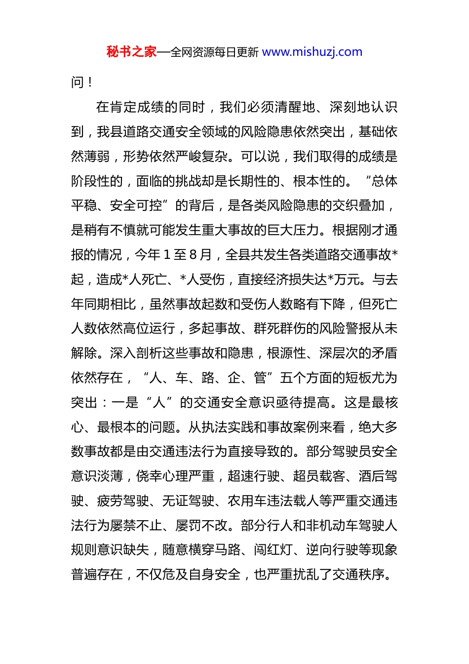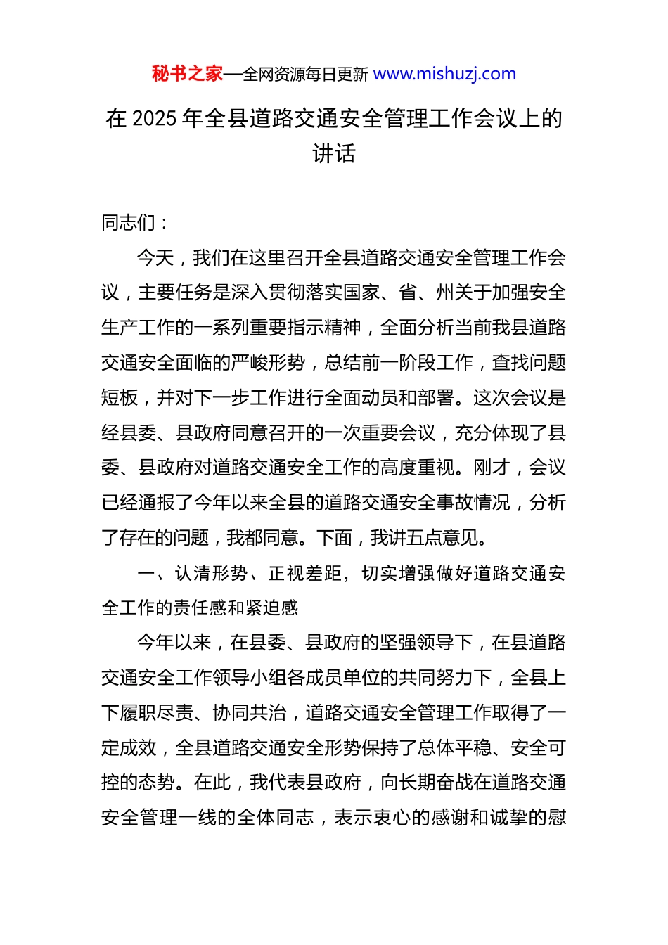 秘书之家—全网资源每日更新 www.mishuzj.com在 2025 年全县道路交通安全管理工作会议上的讲话 同志们:今天,我们在这里召开全县道路交通安全管理工作会议,主要任务是深入贯彻落实国家、省、州关于加强安全生产工作的一系列重要指示精神,全面分析当前我县道路交通安全面临的严峻形势,总结前一阶段工作,查找问题短板,并对下一步工作进行全面动员和部署。这次会议是经县委、县政府同意召开的一次重要会议,充分体现了县委、县政府对道路交通安全工作的高度重视。刚才,会议已经通报了今年以来全县的道路交通安全事故情况,分析了存在的问题,我都同意。下面,我讲五点意见。一、认清形势、正视差距,切实增强做好道路交通安全工作的责任感和紧迫感今年以来,在县委、县政府的坚强领导下,在县道路交通安全工作领导小组各成员单位的共同努力下,全县上下履职尽责、协同共治,道路交通安全管理工作取得了一定成效,全县道路交通安全形势保持了总体平稳、安全可控的态势。在此,我代表县政府,向长期奋战在道路交通安全管理一线的全体同志,表示衷心的感谢和诚挚的慰秘书之家—全网资源每日更新 www.mishuzj.com问!在肯定成绩的同时,我们必须清醒地、深刻地认识到,我县道路交通安全领域的风险隐患依然突出,基础依然薄弱,形势依然严峻复杂。可以说,我们取得的成绩是阶段性的,面临的挑战却是长期性的、根本性的。“总体平稳、安全可控”的背后,是各类风险隐患的交织叠加,是稍有不慎就可能发生重大事故的巨大压力。根据刚才通报的情况,今年 1 至 8 月,全县共发生各类道路交通事故*起,造成*人死亡、*人受伤,直接经济损失达*万元。与去年同期相比,虽然事故起数和受伤人数略有下降,但死亡人数依然高位运行,多起事故、群死群伤的风险警报从未解除。深入剖析这些事故和隐患,根源性、深层次的矛盾依然存在,“人、车、路、企、管”五个方面的短板尤为突出:一是“人”的交通安全意识亟待提高。这是最核心、最根本的问题。从执法实践和事故案例来看,绝大多数事故都是由交通违法行为直接导致的。部分驾驶员安全意识淡薄,侥幸心理严重,超速行驶、超员载客、酒后驾驶、疲劳驾驶、无证驾驶、农用车违法载人等严重交通违法行为屡禁不止、屡罚不改。部分行人和非机动车驾驶人规则意识缺失,随意横穿马路、闯红灯、逆向行驶等现象普遍存在,不仅危及自身安全,也严重扰乱了交通秩序。秘书之家—全网资源每日更新 www.mishuzj.com二是“车”的源头监管存在薄弱环节。近年来,我县机动车保有量持续攀升,目前已突破*万辆,给道路承载能力和交通管理工作带来了巨大压力。特别是“两客一危一货一面”,即公路客运、旅游客运、危险品运输车、重型货车和面包车,这五类重点车辆,体积大、风险高,一旦发生事故,极易造成严重后果。我们的一些运输企业安全生产主体责任悬空,车辆日常维护保养不到位,GPS 动态监控制度形同虚设,对驾驶员的教育培训流于形式,车辆和驾驶员“带病上路”的风险未能从源头上得到有效遏制。三是“路”的基础设施短板尤为明显。我县地处山区,地形地貌复杂,道路等级普遍偏低,临水临崖、急弯陡坡路段多,安全防护设施历史欠账较多。特别是随着经济社会发展,一些新的道路安全隐患点不断出现。例如,国道**线*辖区部分路段,地质结构脆弱,滚石、塌方、泥石流等地质 灾 害 频 发 , 严 重 威 胁 行 车 安 全 。 * 乡 境 内 的 * 线K6954+800 米至 K6956+700 米处,近两公里的长下坡、坡陡、弯急,是公认的“死亡弯道”,事故隐患十分突出。还有*乡的*公路,作为在建路段,部分路段仍是缺少安防设施的便道,通行风险极大。这些事故多发和危险路段,就像悬在我们头顶的“达摩克利斯之剑”,必须下大力气整治。四是“企”的安全生产主体责任落实不到秘书之家—全网资源每日更新 www.mishuzj.com位。一些运输企业片面追求经济效益,忽视安全生产投入。安全管理制度不健全,安全管理人员配备不足或能力不强,对所属车辆和驾驶人的动态监控和日常教育管理严重缺位。部分重点工程的施工单位,在道路施工过程中,安全警示标志...