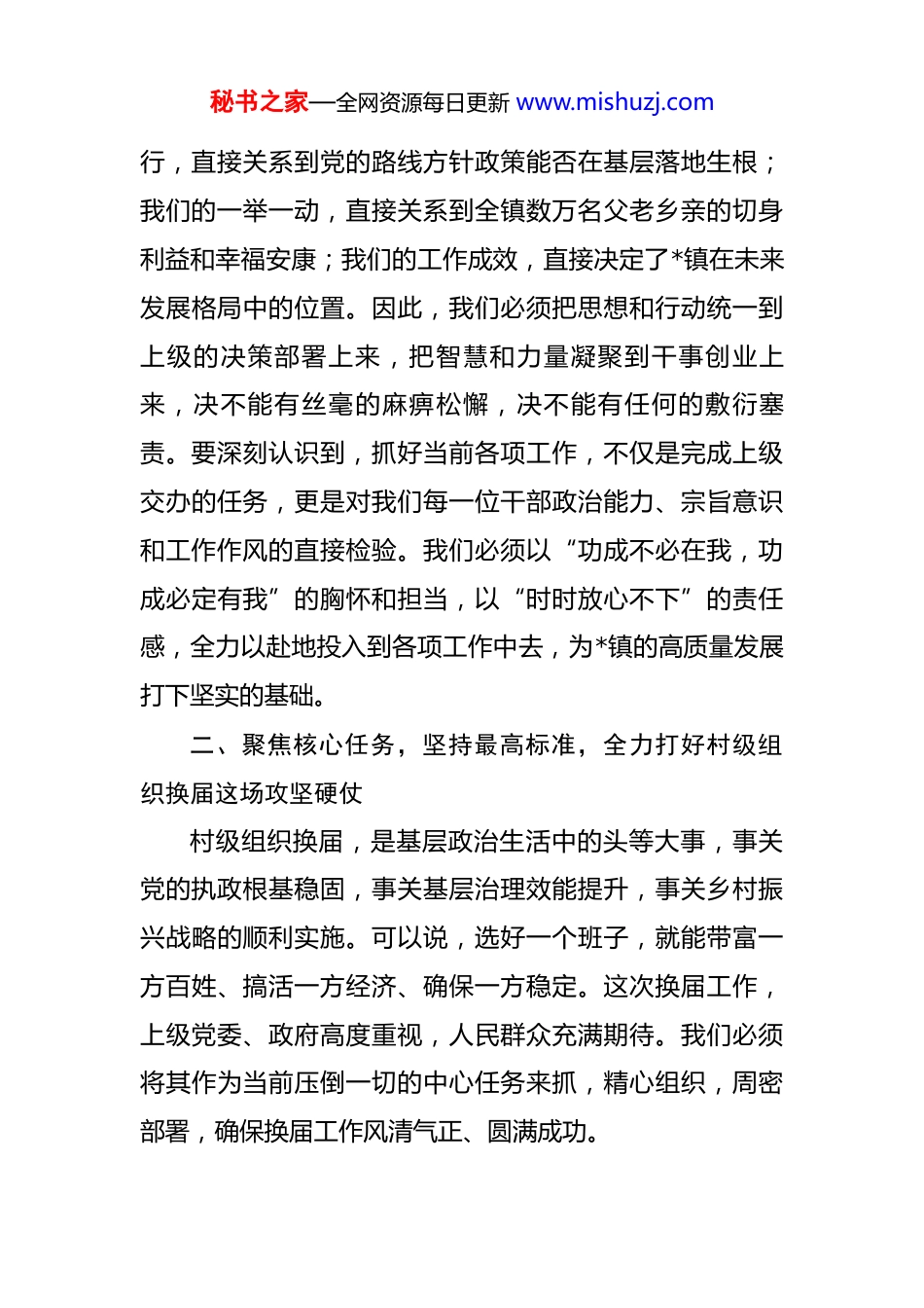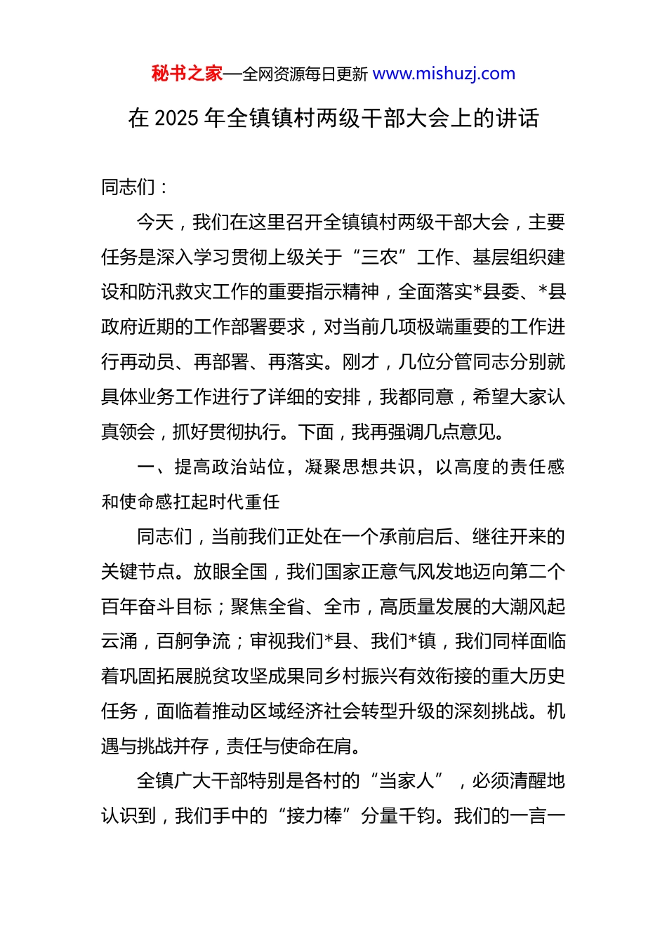 秘书之家—全网资源每日更新 www.mishuzj.com在 2025 年全镇镇村两级干部大会上的讲话 同志们:今天,我们在这里召开全镇镇村两级干部大会,主要任务是深入学习贯彻上级关于“三农”工作、基层组织建设和防汛救灾工作的重要指示精神,全面落实*县委、*县政府近期的工作部署要求,对当前几项极端重要的工作进行再动员、再部署、再落实。刚才,几位分管同志分别就具体业务工作进行了详细的安排,我都同意,希望大家认真领会,抓好贯彻执行。下面,我再强调几点意见。一、提高政治站位,凝聚思想共识,以高度的责任感和使命感扛起时代重任同志们,当前我们正处在一个承前启后、继往开来的关键节点。放眼全国,我们国家正意气风发地迈向第二个百年奋斗目标;聚焦全省、全市,高质量发展的大潮风起云涌,百舸争流;审视我们*县、我们*镇,我们同样面临着巩固拓展脱贫攻坚成果同乡村振兴有效衔接的重大历史任务,面临着推动区域经济社会转型升级的深刻挑战。机遇与挑战并存,责任与使命在肩。全镇广大干部特别是各村的“当家人”,必须清醒地认识到,我们手中的“接力棒”分量千钧。我们的一言一秘书之家—全网资源每日更新 www.mishuzj.com行,直接关系到党的路线方针政策能否在基层落地生根;我们的一举一动,直接关系到全镇数万名父老乡亲的切身利益和幸福安康;我们的工作成效,直接决定了*镇在未来发展格局中的位置。因此,我们必须把思想和行动统一到上级的决策部署上来,把智慧和力量凝聚到干事创业上来,决不能有丝毫的麻痹松懈,决不能有任何的敷衍塞责。要深刻认识到,抓好当前各项工作,不仅是完成上级交办的任务,更是对我们每一位干部政治能力、宗旨意识和工作作风的直接检验。我们必须以“功成不必在我,功成必定有我”的胸怀和担当,以“时时放心不下”的责任感,全力以赴地投入到各项工作中去,为*镇的高质量发展打下坚实的基础。二、聚焦核心任务,坚持最高标准,全力打好村级组织换届这场攻坚硬仗村级组织换届,是基层政治生活中的头等大事,事关党的执政根基稳固,事关基层治理效能提升,事关乡村振兴战略的顺利实施。可以说,选好一个班子,就能带富一方百姓、搞活一方经济、确保一方稳定。这次换届工作,上级党委、政府高度重视,人民群众充满期待。我们必须将其作为当前压倒一切的中心任务来抓,精心组织,周密部署,确保换届工作风清气正、圆满成功。秘书之家—全网资源每日更新 www.mishuzj.com第一,要严格对标,把牢人选的“资格关”。衡量一名干部,德才是首要标准。这次换届,我们必须旗帜鲜明地把政治标准放在首位,坚持高线选人、底线设防。什么是“高线”?就是要优先选拔那些思想政治素质好、道德品行好、带富能力强、协调能力强的优秀人才。要重点关注那些在重大任务中表现突出、敢于担当的先进分子,那些群众公认、真心实意为民服务的贴心人,特别是要把农村致富能手、外出务工经商返乡的优秀人员、本乡本土的大学毕业生、退役军人等群体中的佼佼者,吸纳到我们的班子队伍中来。什么是“底线”?就是坚决执行候选人资格的“负面清单”。根据上级要求和相关法规,凡是对党不忠诚不老实、受过刑事处罚、存在“村霸”和涉黑涉恶问题、参与邪教组织、被列为失信被执行人,以及受到撤销党内职务以上处分未满规定时限的人员,一律不得作为候选人。我们必须严格执行任职资格县级部门联合审查制度,由镇党委对所有初步人选进行全面审查,再报请*县委组织部、纪委监委、政法、公安、民政等十几个部门进行资格联审,确保进入候选人视野的,都是政治上靠得住、工作上有本事、作风上过得硬的清白人、明白人、带头人。第二,要严谨程序,守住选举的“法律关”。民主选秘书之家—全网资源每日更新 www.mishuzj.com举的生命力在于程序的公正与严谨。从成立选举工作机构、制定选举方案,到推选村民选举委员会;从选民登记、资格审核,到候选人提名、确定与公示;从组织候选人竞职演讲,到召开选举大会进行投票,每一个环节都必须严格依法依规操作,决不能“图省事、走捷径”。镇换届工作领导小组办公室要加强业务指导,确保每一个步骤都有法可依、有章可循。各...