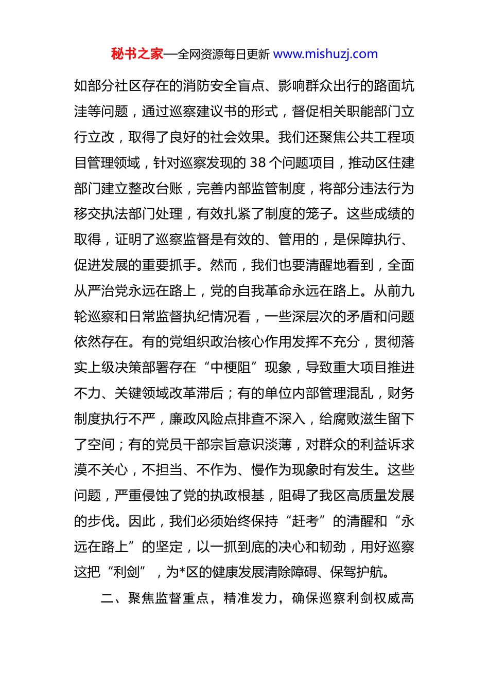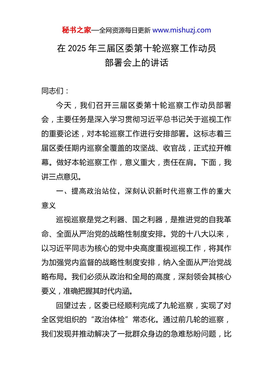 秘书之家—全网资源每日更新 www.mishuzj.com在 2025 年三届区委第十轮巡察工作动员部署会上的讲话 同志们:今天,我们召开三届区委第十轮巡察工作动员部署会,主要任务是深入学习贯彻习近平总书记关于巡视工作的重要论述,对本轮巡察工作进行安排部署。这标志着三届区委任期内巡察全覆盖的攻坚战、收官战,正式拉开帷幕。做好本轮巡察工作,意义重大,责任在肩。下面,我讲三点意见。一、提高政治站位,深刻认识新时代巡察工作的重大意义巡视巡察是党之利器、国之利器,是推进党的自我革命、全面从严治党的战略性制度安排。党的十八大以来,以习近平同志为核心的党中央高度重视巡视工作,将其作为加强党内监督的战略性制度安排,纳入全面从严治党战略布局。我们必须从政治和全局的高度,深刻领会其核心要义,准确把握其时代内涵。回望过去,区委已经顺利完成了九轮巡察,实现了对全区党组织的“政治体检”常态化。通过前几轮的巡察,我们发现并推动解决了一批群众身边的急难愁盼问题,比秘书之家—全网资源每日更新 www.mishuzj.com如部分社区存在的消防安全盲点、影响群众出行的路面坑洼等问题,通过巡察建议书的形式,督促相关职能部门立行立改,取得了良好的社会效果。我们还聚焦公共工程项目管理领域,针对巡察发现的 38 个问题项目,推动区住建部门建立整改台账,完善内部监管制度,将部分违法行为移交执法部门处理,有效扎紧了制度的笼子。这些成绩的取得,证明了巡察监督是有效的、管用的,是保障执行、促进发展的重要抓手。然而,我们也要清醒地看到,全面从严治党永远在路上,党的自我革命永远在路上。从前九轮巡察和日常监督执纪情况看,一些深层次的矛盾和问题依然存在。有的党组织政治核心作用发挥不充分,贯彻落实上级决策部署存在“中梗阻”现象,导致重大项目推进不力、关键领域改革滞后;有的单位内部管理混乱,财务制度执行不严,廉政风险点排查不深入,给腐败滋生留下了空间;有的党员干部宗旨意识淡薄,对群众的利益诉求漠不关心,不担当、不作为、慢作为现象时有发生。这些问题,严重侵蚀了党的执政根基,阻碍了我区高质量发展的步伐。因此,我们必须始终保持“赶考”的清醒和“永远在路上”的坚定,以一抓到底的决心和韧劲,用好巡察这把“利剑”,为*区的健康发展清除障碍、保驾护航。二、聚焦监督重点,精准发力,确保巡察利剑权威高秘书之家—全网资源每日更新 www.mishuzj.com效本轮巡察是三届区委的收官之巡,时间紧、任务重、关注度高。我们安排了 3 个巡察组,对区委办公室等 7 个党组织开展常规巡察,同时进行乡村振兴资金使用专项巡察,并对区农业农村局开展巡察“回头看”。这既是落实全覆盖要求的既定安排,也是针对当前我区突出问题和薄弱环节作出的精准部署。各巡察组要准确把握不同巡察类型的特点,精准定位、精准发力,确保巡出真问题、察出真效果。(一)常规巡察要做到“政治体检”全面深入。本轮常规巡察涉及的 7 家单位,既有区委区政府的“前哨后院”,也有服务经济社会发展的关键部门,地位重要,责任特殊。巡察组必须牢牢把握“政治体检”的定位,用政治的眼光审视业务,用政治的标准衡量工作。一要紧盯政治忠诚。要深入检查被巡察党组织学习贯彻习近平新时代中国特色社会主义思想和党的二十大精神的情况,看是否真正做到学思用贯通、知信行统一。特别是区委办公室、区政府办公室党组,作为服务区委区政府决策运转的中枢机构,必须在政治上站得更高、看得更远、做得更实。要检查其“三重一大”决策制度执行是否严格,风险防控措施是否到位。据我们了解,部分单位的重大决策风险防控秘书之家—全网资源每日更新 www.mishuzj.com措施执行率仍有待提高,个别单位甚至未建立完善的风险防控台账,这些都是巡察需要关注的重点。二要紧盯职能履行。要聚焦被巡察党组织的核心职能,看其是否完整、准确、全面贯彻新发展理念,是否不折不扣地落实了党中央和省委、市委、区委的各项工作要求。比如,区审计局党组,是否真正发挥了审计监督“经济卫士”的作用?在重大政策落实跟踪审计、财政资金绩效审计等方面是否存在短板?区委社...