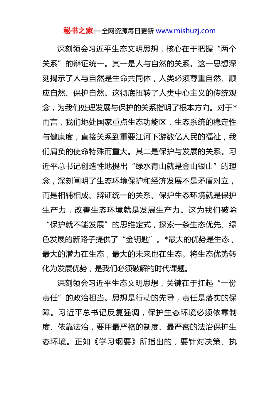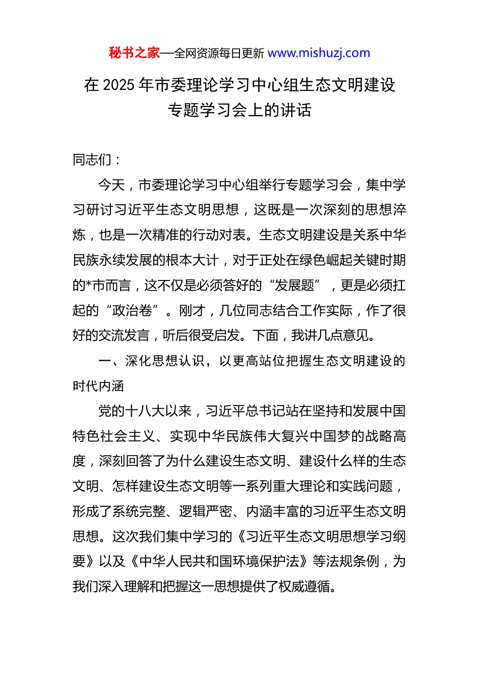 秘书之家—全网资源每日更新 www.mishuzj.com在 2025 年市委理论学习中心组生态文明建设专题学习会上的讲话 同志们:今天,市委理论学习中心组举行专题学习会,集中学习研讨习近平生态文明思想,这既是一次深刻的思想淬炼,也是一次精准的行动对表。生态文明建设是关系中华民族永续发展的根本大计,对于正处在绿色崛起关键时期的*市而言,这不仅是必须答好的“发展题”,更是必须扛起的“政治卷”。刚才,几位同志结合工作实际,作了很好的交流发言,听后很受启发。下面,我讲几点意见。一、深化思想认识,以更高站位把握生态文明建设的时代内涵党的十八大以来,习近平总书记站在坚持和发展中国特色社会主义、实现中华民族伟大复兴中国梦的战略高度,深刻回答了为什么建设生态文明、建设什么样的生态文明、怎样建设生态文明等一系列重大理论和实践问题,形成了系统完整、逻辑严密、内涵丰富的习近平生态文明思想。这次我们集中学习的《习近平生态文明思想学习纲要》以及《中华人民共和国环境保护法》等法规条例,为我们深入理解和把握这一思想提供了权威遵循。秘书之家—全网资源每日更新 www.mishuzj.com深刻领会习近平生态文明思想,核心在于把握“两个关系”的辩证统一。其一是人与自然的关系。这一思想深刻揭示了人与自然是生命共同体,人类必须尊重自然、顺应自然、保护自然。这彻底扭转了人类中心主义的传统观念,为我们处理发展与保护的关系指明了根本方向。对于*而言,我们地处国家重点生态功能区,生态系统的稳定性与健康度,直接关系到重要江河下游数亿人民的福祉,我们肩负的使命特殊而重大。其二是保护与发展的关系。习近平总书记创造性地提出“绿水青山就是金山银山”的理念,深刻阐明了生态环境保护和经济发展不是矛盾对立,而是相辅相成、辩证统一的关系。保护生态环境就是保护生产力,改善生态环境就是发展生产力。这为我们破除“保护就不能发展”的思维定式,探索一条生态优先、绿色发展的新路子提供了“金钥匙”。*最大的优势是生态,最大的潜力在生态,最大的未来也在生态。将生态优势转化为发展优势,是我们必须破解的时代课题。深刻领会习近平生态文明思想,关键在于扛起“一份责任”的政治担当。思想是行动的先导,责任是落实的保障。习近平总书记反复强调,保护生态环境必须依靠制度、依靠法治,要用最严格的制度、最严密的法治保护生态环境。正如《学习纲要》所指出的,要针对决策、执秘书之家—全网资源每日更新 www.mishuzj.com行、监管中的责任,明确各级领导干部责任追究情形,对造成生态环境损害负有责任的领导干部,不论是否已调离、提拔或者退休,都必须严肃追责。这警示我们,生态环境保护不是可松可紧的“软任务”,而是不可逾越的“硬杠杠”。各级领导干部必须把生态文明建设摆在全局工作的突出位置,以“功成不必在我”的精神境界和“功成必定有我”的历史担当,坚决扛起守护一方绿水青山的政治责任。深刻领会习近平生态文明思想,重点在于践行“一种理念”的行动自觉。这一理念就是将生态文明建设融入经济建设、政治建设、文化建设、社会建设各方面和全过程,推动形成绿色发展方式和生活方式。对于我们而言,不能仅仅将生态文明建设停留在口号上,而要切实落实到每一个决策、每一项工作、每一个项目中。在产业规划上,要优先选择绿色低碳产业,淘汰落后产能,推动传统产业绿色化改造;在城市建设中,要注重生态空间的保护和利用,打造宜居宜业的生态环境;在民生领域,要积极推广绿色消费、绿色出行等理念,引导公众形成绿色生活习惯。只有将生态文明理念贯穿于发展的全过程,才能真正实现经济发展与生态保护的良性互动,走出一条具有地方特色的生态文明建设之路。秘书之家—全网资源每日更新 www.mishuzj.com二、正视发展现状,以更清醒头脑审视生态环境保护的成绩与挑战近年来,全市上下深入践行“两山”理念,坚定不移走生态优先、绿色发展之路,生态文明建设取得了显著成效,*的“绿色名片”越擦越亮。我们的成绩是实实在在的。生态环境质量持续领跑。截至今年 8 月底,我市中心城区空气质量优良天数比例达到 98.8%,PM2.5 平均...