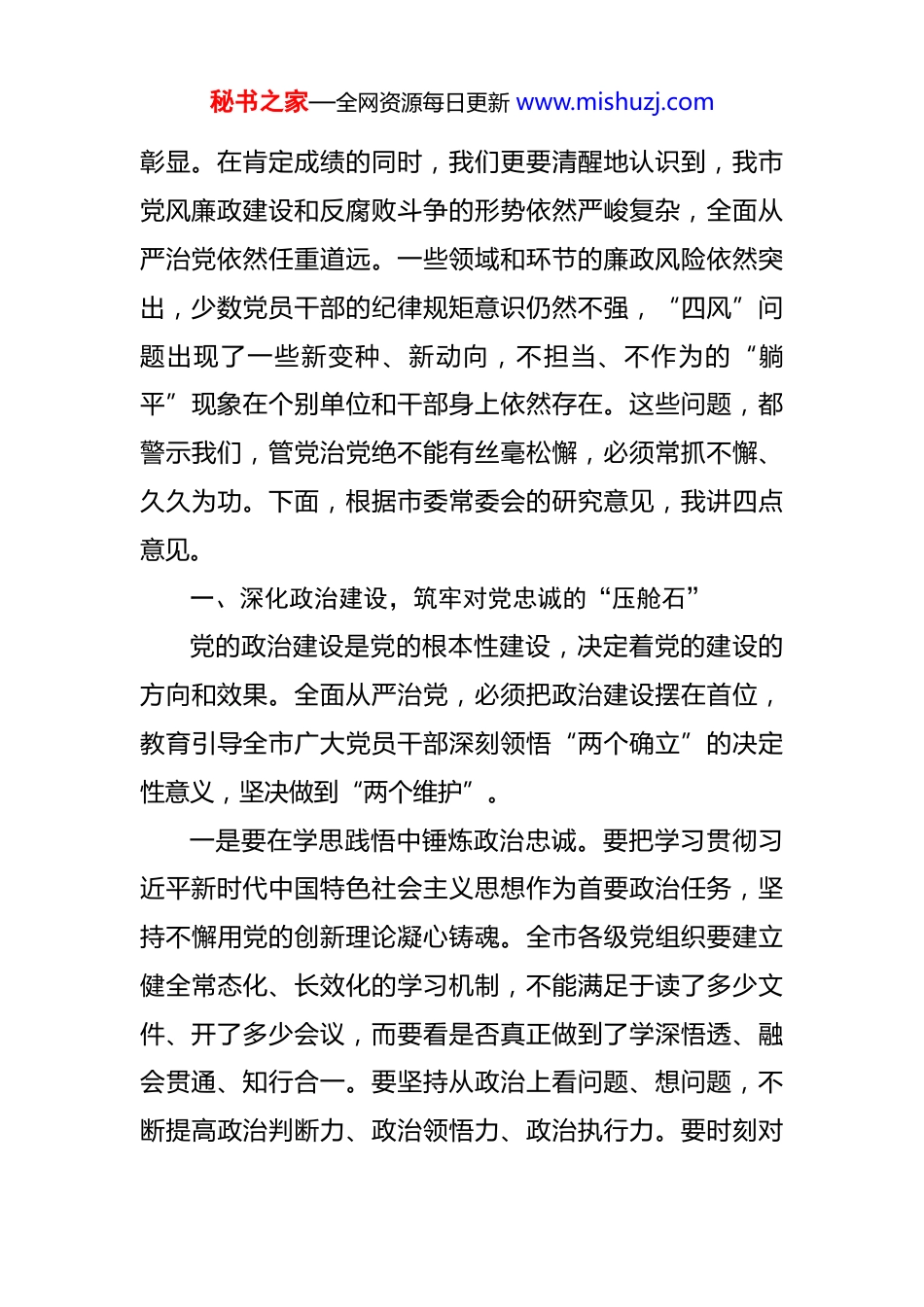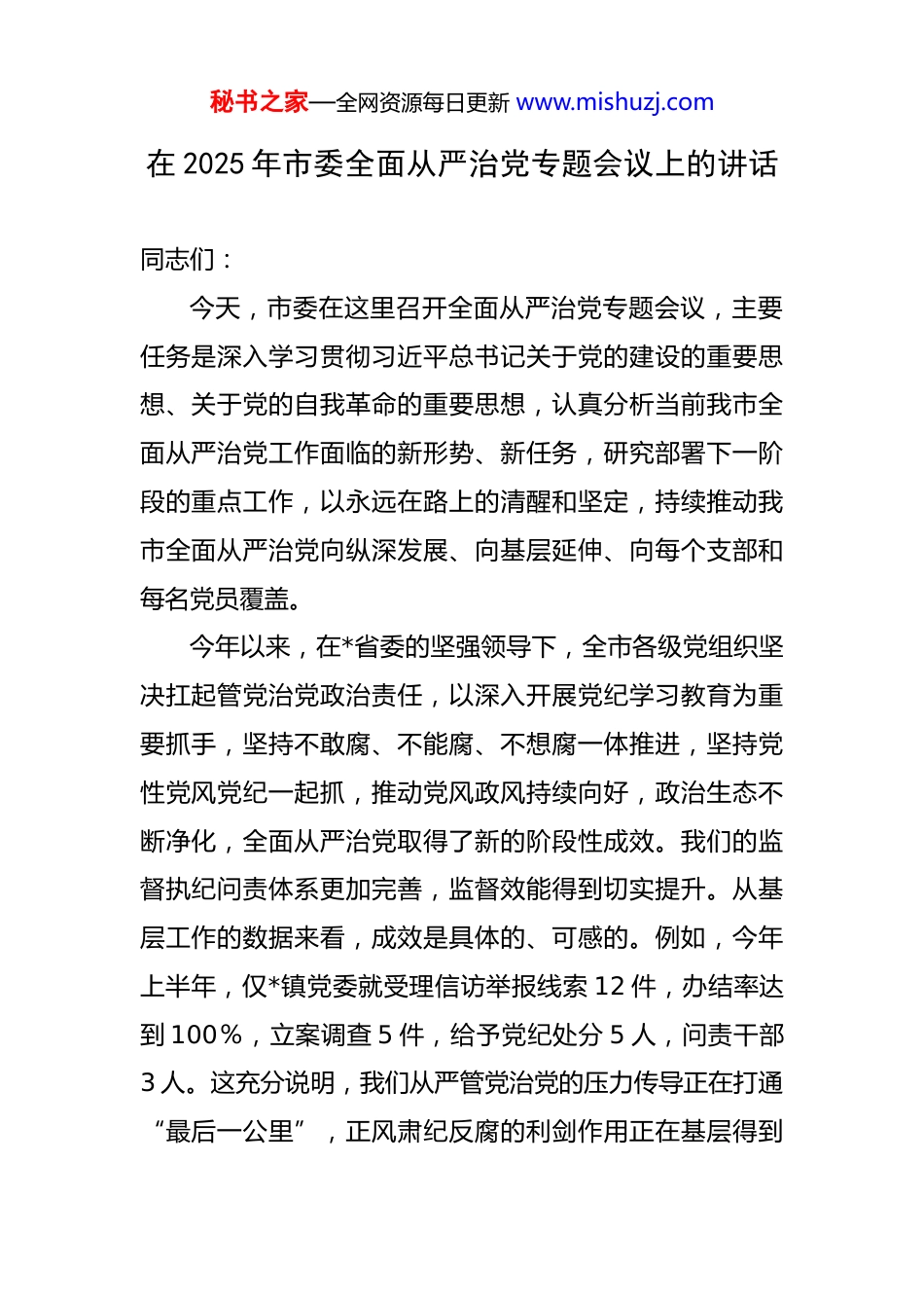 秘书之家—全网资源每日更新 www.mishuzj.com在 2025 年市委全面从严治党专题会议上的讲话 同志们:今天,市委在这里召开全面从严治党专题会议,主要任务是深入学习贯彻习近平总书记关于党的建设的重要思想、关于党的自我革命的重要思想,认真分析当前我市全面从严治党工作面临的新形势、新任务,研究部署下一阶段的重点工作,以永远在路上的清醒和坚定,持续推动我市全面从严治党向纵深发展、向基层延伸、向每个支部和每名党员覆盖。今年以来,在*省委的坚强领导下,全市各级党组织坚决扛起管党治党政治责任,以深入开展党纪学习教育为重要抓手,坚持不敢腐、不能腐、不想腐一体推进,坚持党性党风党纪一起抓,推动党风政风持续向好,政治生态不断净化,全面从严治党取得了新的阶段性成效。我们的监督执纪问责体系更加完善,监督效能得到切实提升。从基层工作的数据来看,成效是具体的、可感的。例如,今年上半年,仅*镇党委就受理信访举报线索 12 件,办结率达到 100%,立案调查 5 件,给予党纪处分 5 人,问责干部3 人。这充分说明,我们从严管党治党的压力传导正在打通“最后一公里”,正风肃纪反腐的利剑作用正在基层得到秘书之家—全网资源每日更新 www.mishuzj.com彰显。在肯定成绩的同时,我们更要清醒地认识到,我市党风廉政建设和反腐败斗争的形势依然严峻复杂,全面从严治党依然任重道远。一些领域和环节的廉政风险依然突出,少数党员干部的纪律规矩意识仍然不强,“四风”问题出现了一些新变种、新动向,不担当、不作为的“躺平”现象在个别单位和干部身上依然存在。这些问题,都警示我们,管党治党绝不能有丝毫松懈,必须常抓不懈、久久为功。下面,根据市委常委会的研究意见,我讲四点意见。一、深化政治建设,筑牢对党忠诚的“压舱石”党的政治建设是党的根本性建设,决定着党的建设的方向和效果。全面从严治党,必须把政治建设摆在首位,教育引导全市广大党员干部深刻领悟“两个确立”的决定性意义,坚决做到“两个维护”。一是要在学思践悟中锤炼政治忠诚。要把学习贯彻习近平新时代中国特色社会主义思想作为首要政治任务,坚持不懈用党的创新理论凝心铸魂。全市各级党组织要建立健全常态化、长效化的学习机制,不能满足于读了多少文件、开了多少会议,而要看是否真正做到了学深悟透、融会贯通、知行合一。要坚持从政治上看问题、想问题,不断提高政治判断力、政治领悟力、政治执行力。要时刻对秘书之家—全网资源每日更新 www.mishuzj.com标对表习近平总书记对我市的重要指示批示精神,对标党中央和*省委、市委的各项决策部署,确保在思想上政治上行动上始终同以习近平同志为核心的党中央保持高度一致,确保中央和省委的政令在我市不折不扣地得到贯彻执行。二是要在履职尽责中体现政治担当。对党忠诚不是抽象的口号,而是具体的行动。检验我们是否忠诚,最直接的标尺就是看我们能否把“两个维护”体现到履行职责、推动发展的全过程和各方面。当前,*市正处在转型发展的关键时期、爬坡过坎的攻坚阶段。全市各级领导干部要自觉增强大局意识和全局观念,坚持从政治上考量工作,在大局下行动,把分管领域、分管部门的工作,放到全市乃至全省的发展大局中去谋划和推进。要坚决破除本位主义、分散主义,杜绝上有政策、下有对策,有令不行、有禁不止的现象,确保市委的决策部署能够一贯到底、落地生根。三是要在严明纪律中守好政治规矩。政治纪律是最重要、最根本、最关键的纪律。要把严明政治纪律和政治规矩贯穿于管党治党全过程,带动组织纪律、廉洁纪律、群众纪律、工作纪律、生活纪律全面从严。要教育引导党员干部心怀“国之大者”,始终牢记自己的第一身份是共产秘书之家—全网资源每日更新 www.mishuzj.com党员,第一职责是为党工作,任何时候任何情况下都要做到在党言党、在党忧党、在党为党,自觉做政治上的明白人、老实人。二、服务发展大局,当好高质量发展的“护航员”全面从严治党,其根本目的是为了营造风清气正的政治生态,从而更好地保障和促进经济社会高质量发展。我们抓党建、抓从严治党,决不能搞成“两张皮”,必须与中心工作深度融...