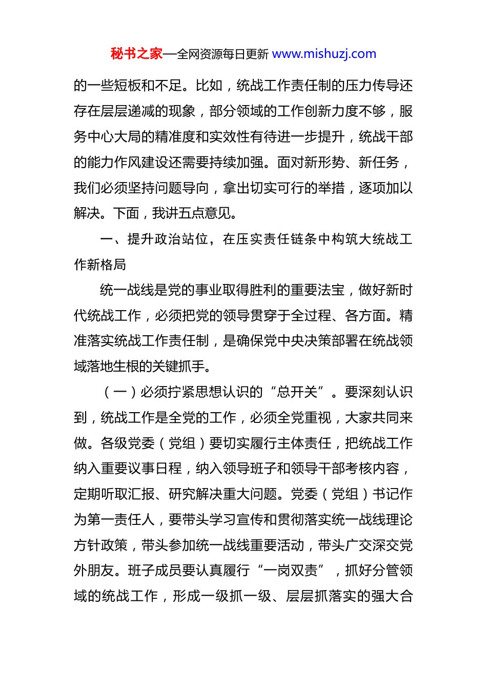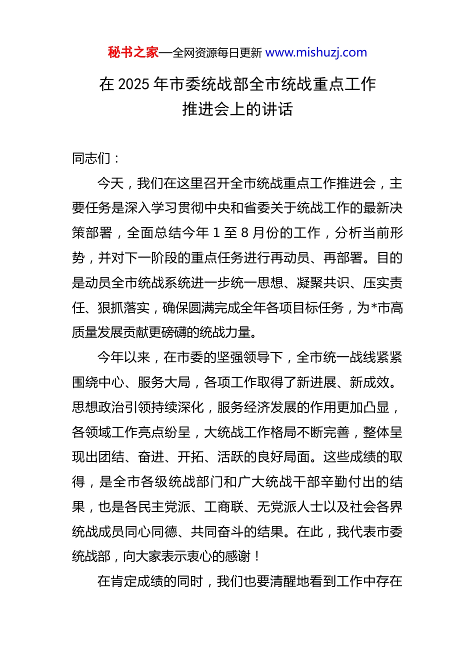 秘书之家—全网资源每日更新 www.mishuzj.com在 2025 年市委统战部全市统战重点工作推进会上的讲话 同志们:今天,我们在这里召开全市统战重点工作推进会,主要任务是深入学习贯彻中央和省委关于统战工作的最新决策部署,全面总结今年 1 至 8 月份的工作,分析当前形势,并对下一阶段的重点任务进行再动员、再部署。目的是动员全市统战系统进一步统一思想、凝聚共识、压实责任、狠抓落实,确保圆满完成全年各项目标任务,为*市高质量发展贡献更磅礴的统战力量。今年以来,在市委的坚强领导下,全市统一战线紧紧围绕中心、服务大局,各项工作取得了新进展、新成效。思想政治引领持续深化,服务经济发展的作用更加凸显,各领域工作亮点纷呈,大统战工作格局不断完善,整体呈现出团结、奋进、开拓、活跃的良好局面。这些成绩的取得,是全市各级统战部门和广大统战干部辛勤付出的结果,也是各民主党派、工商联、无党派人士以及社会各界统战成员同心同德、共同奋斗的结果。在此,我代表市委统战部,向大家表示衷心的感谢!在肯定成绩的同时,我们也要清醒地看到工作中存在秘书之家—全网资源每日更新 www.mishuzj.com的一些短板和不足。比如,统战工作责任制的压力传导还存在层层递减的现象,部分领域的工作创新力度不够,服务中心大局的精准度和实效性有待进一步提升,统战干部的能力作风建设还需要持续加强。面对新形势、新任务,我们必须坚持问题导向,拿出切实可行的举措,逐项加以解决。下面,我讲五点意见。一、提升政治站位,在压实责任链条中构筑大统战工作新格局统一战线是党的事业取得胜利的重要法宝,做好新时代统战工作,必须把党的领导贯穿于全过程、各方面。精准落实统战工作责任制,是确保党中央决策部署在统战领域落地生根的关键抓手。(一)必须拧紧思想认识的“总开关”。要深刻认识到,统战工作是全党的工作,必须全党重视,大家共同来做。各级党委(党组)要切实履行主体责任,把统战工作纳入重要议事日程,纳入领导班子和领导干部考核内容,定期听取汇报、研究解决重大问题。党委(党组)书记作为第一责任人,要带头学习宣传和贯彻落实统一战线理论方针政策,带头参加统一战线重要活动,带头广交深交党外朋友。班子成员要认真履行“一岗双责”,抓好分管领域的统战工作,形成一级抓一级、层层抓落实的强大合秘书之家—全网资源每日更新 www.mishuzj.com力。(二)必须健全协同高效的“工作链”。大统战工作格局的构建,核心在于机制的健全与运转的流畅。要持续完善市委统一战线工作领导小组运行机制,强化其牵头抓总、统筹协调的职能。各成员单位要牢固树立“一盘棋”思想,既各司其职、各负其责,又密切配合、协同作战。要推动统战工作向基层有效覆盖,巩固市、县、乡、村四级统战工作网络,确保我们超过 2285 个基层统战组织真正发挥作用。要加强对统战委员和联络员的业务培训和工作指导,让他们愿意干、懂得干、能够干好,打通统战工作在基层的“最后一公里”。(三)必须用好督查考核的“指挥棒”。责任不检查就等于没有责任。要建立常态化的督促检查机制,综合运用专项督查、随机抽查、年度考核等方式,对各地各单位落实统战工作责任制的情况进行全方位“体检”。要坚持结果导向,将考核结果与评优评先、干部使用等挂钩,对工作成效显著的要予以表彰奖励,对履职不力、问题突出的要严肃约谈问责,切实树立起“抓好统战是本职、不抓是失职、抓不好是渎职”的鲜明导向,推动责任制从“纸上”落到“地上”。二、聚焦中心大局,在服务高质量发展中展现统战新秘书之家—全网资源每日更新 www.mishuzj.com作为围绕中心、服务大局是统战工作的价值所在。当前,全市上下正全力以赴推进“支点建设”,这是我们肩负的重大历史使命。全市统一战线必须找准切入点、结合点、着力点,引导广大统战成员把智慧和力量向“支点建设”聚焦聚力。(一)要以高水平建言献策赋能科学决策。这是发挥新型政党制度优势的重要体现。要持续深化政党协商,完善协商内容、规范协商程序,为各民主党派、无党派人士搭建更多知情明政的平台。要启动并深入实施“民主党派建言献策...