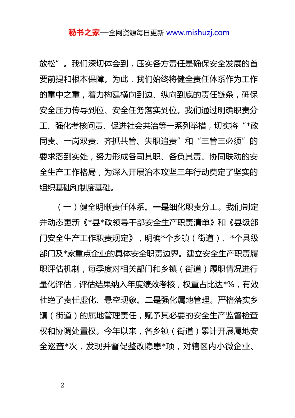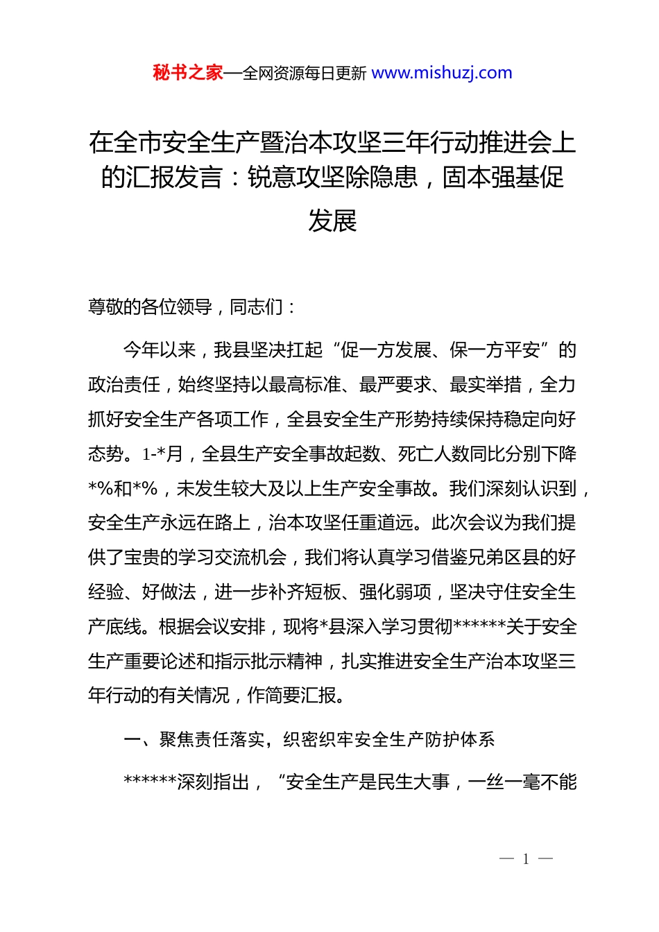 秘书之家—全网资源每日更新 www.mishuzj.com在全市安全生产暨治本攻坚三年行动推进会上的汇报发言:锐意攻坚除隐患,固本强基促发展尊敬的各位领导,同志们:今年以来,我县坚决扛起“促一方发展、保一方平安”的政治责任,始终坚持以最高标准、最严要求、最实举措,全力抓好安全生产各项工作,全县安全生产形势持续保持稳定向好态势。1-*月,全县生产安全事故起数、死亡人数同比分别下降*%和*%,未发生较大及以上生产安全事故。我们深刻认识到,安全生产永远在路上,治本攻坚任重道远。此次会议为我们提供了宝贵的学习交流机会,我们将认真学习借鉴兄弟区县的好经验、好做法,进一步补齐短板、强化弱项,坚决守住安全生产底线。根据会议安排,现将*县深入学习贯彻******关于安全生产重要论述和指示批示精神,扎实推进安全生产治本攻坚三年行动的有关情况,作简要汇报。一、聚焦责任落实,织密织牢安全生产防护体系******深刻指出,“安全生产是民生大事,一丝一毫不能— 1 —秘书之家—全网资源每日更新 www.mishuzj.com放松”。我们深切体会到,压实各方责任是确保安全发展的首要前提和根本保障。为此,我们始终将健全责任体系作为工作的重中之重,着力构建横向到边、纵向到底的责任链条,确保安全压力传导到位、安全任务落实到位。我们通过明确职责分工、强化考核问责、促进社会共治等一系列举措,切实将“*政同责、一岗双责、齐抓共管、失职追责”和“三管三必须”的要求落到实处,努力形成各司其职、各负其责、协同联动的安全生产工作格局,为深入开展治本攻坚三年行动奠定了坚实的组织基础和制度基础。(一)健全明晰责任体系。一是细化职责分工。我们制定并动态更新《*县*政领导干部安全生产职责清单》和《县级部门安全生产工作职责规定》,明确*个乡镇(街道)、*个县级部门及*家重点企业的具体安全职责边界。建立安全生产职责履职评估机制,每季度对相关部门和乡镇(街道)履职情况进行量化评估,评估结果纳入年度绩效考核,权重占比达*%,有效杜绝了责任虚化、悬空现象。二是强化属地管理。严格落实乡镇(街道)的属地管理责任,赋予其必要的安全生产监督检查权和协调处置权。今年以来,各乡镇(街道)累计开展属地安全巡查*次,发现并督促整改隐患*项,对辖区内小微企业、— 2 —秘书之家—全网资源每日更新 www.mishuzj.com“九小场所”等实现了监管全覆盖,基层安全“前哨”作用得到充分发挥。三是压实企业主责。强力推行企业安全生产主体责任承诺制,全县*家规上企业及*家高危行业企业法定代表人均已签订承诺书。实施企业安全风险分级管控和隐患排查治理双重预防机制建设,目前已完成*家重点企业的风险等级评定,并实施差异化监管。对主体责任落实不到位的企业,依法依规严厉查处,今年以来共处罚企业*家,罚款*万元。(二)强化督导考核问责。一是完善督查机制。成立由县委、县政府督查室牵头,县安委办参与的安全生产专项督查组,采取“四不两直”方式,定期对各乡镇(街道)、各部门三年行动任务推进情况进行督导检查。1-7 月,已开展专项督查*轮,下发督办函*份,推动解决重点难点问题*项。二是严格考核评价。将安全生产治本攻坚三年行动主要指标纳入全县高质量发展综合考核体系,提高考核权重,实行安全生产“一票否决”制。每半年召开一次安全生产工作会议,通报考核情况,对工作成效显著的*个单位予以通报表扬,对工作滞后的*个单位主要负责人进行约谈。三是严肃追责问责。严格执行《地方*政领导干部安全生产责任制规定》,对因责任不落实、措施不到位、监管不得力而导致发生事故的,依法依规严肃追究相关单位和— 3 —秘书之家—全网资源每日更新 www.mishuzj.com人员的责任。今年以来,共对*起事故进行了深入调查,问责处理*员干部*人,起到了强烈的震慑警示作用。(三)推动社会协同共治。一是加强宣传教育。深入开展安全生产“五进”活动,利用县融媒体中心、政务新媒体等平台,常态化宣传安全生产法律法规和知识技能。举办各类安全培训班*期,培训企业负责人、安全管理人员和特种作业人员*人次。组织开展“安全生产月”、“119 消防宣传日...
