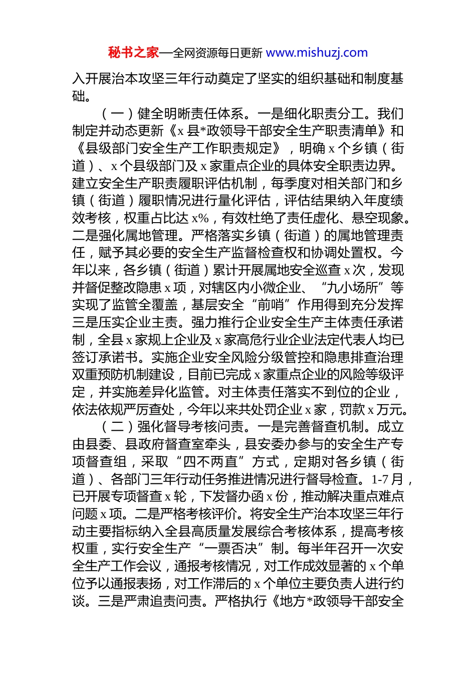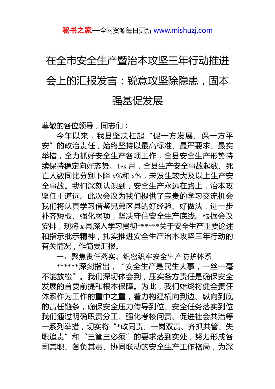 秘书之家—全网资源每日更新 www.mishuzj.com在全市安全生产暨治本攻坚三年行动推进会上的汇报发言:锐意攻坚除隐患,固本强基促发展尊敬的各位领导,同志们:今年以来,我县坚决扛起“促一方发展、保一方平安”的政治责任,始终坚持以最高标准、最严要求、最实举措,全力抓好安全生产各项工作,全县安全生产形势持续保持稳定向好态势。1-x 月,全县生产安全事故起数、死亡人数同比分别下降 x%和 x%,未发生较大及以上生产安全事故。我们深刻认识到,安全生产永远在路上,治本攻坚任重道远。此次会议为我们提供了宝贵的学习交流机会我们将认真学习借鉴兄弟区县的好经验、好做法,进一步补齐短板、强化弱项,坚决守住安全生产底线。根据会议安排,现将 x 县深入学习贯彻******关于安全生产重要论述和指示批示精神,扎实推进安全生产治本攻坚三年行动的有关情况,作简要汇报。一、聚焦责任落实,织密织牢安全生产防护体系******深刻指出,“安全生产是民生大事,一丝一毫不能放松”。我们深切体会到,压实各方责任是确保安全发展的首要前提和根本保障。为此,我们始终将健全责任体系作为工作的重中之重,着力构建横向到边、纵向到底的责任链条,确保安全压力传导到位、安全任务落实到位我们通过明确职责分工、强化考核问责、促进社会共治等一系列举措,切实将“*政同责、一岗双责、齐抓共管、失职追责”和“三管三必须”的要求落到实处,努力形成各司其职、各负其责、协同联动的安全生产工作格局,为深秘书之家—全网资源每日更新 www.mishuzj.com入开展治本攻坚三年行动奠定了坚实的组织基础和制度基础。(一)健全明晰责任体系。一是细化职责分工。我们制定并动态更新《x 县*政领导干部安全生产职责清单》和《县级部门安全生产工作职责规定》,明确 x 个乡镇(街道)、x 个县级部门及 x 家重点企业的具体安全职责边界。建立安全生产职责履职评估机制,每季度对相关部门和乡镇(街道)履职情况进行量化评估,评估结果纳入年度绩效考核,权重占比达 x%,有效杜绝了责任虚化、悬空现象。二是强化属地管理。严格落实乡镇(街道)的属地管理责任,赋予其必要的安全生产监督检查权和协调处置权。今年以来,各乡镇(街道)累计开展属地安全巡查 x 次,发现并督促整改隐患 x 项,对辖区内小微企业、“九小场所”等实现了监管全覆盖,基层安全“前哨”作用得到充分发挥三是压实企业主责。强力推行企业安全生产主体责任承诺制,全县 x 家规上企业及 x 家高危行业企业法定代表人均已签订承诺书。实施企业安全风险分级管控和隐患排查治理双重预防机制建设,目前已完成 x 家重点企业的风险等级评定,并实施差异化监管。对主体责任落实不到位的企业,依法依规严厉查处,今年以来共处罚企业 x 家,罚款 x 万元。(二)强化督导考核问责。一是完善督查机制。成立由县委、县政府督查室牵头,县安委办参与的安全生产专项督查组,采取“四不两直”方式,定期对各乡镇(街道)、各部门三年行动任务推进情况进行督导检查。1-7 月,已开展专项督查 x 轮,下发督办函 x 份,推动解决重点难点问题 x 项。二是严格考核评价。将安全生产治本攻坚三年行动主要指标纳入全县高质量发展综合考核体系,提高考核权重,实行安全生产“一票否决”制。每半年召开一次安全生产工作会议,通报考核情况,对工作成效显著的 x 个单位予以通报表扬,对工作滞后的 x 个单位主要负责人进行约谈。三是严肃追责问责。严格执行《地方*政领导干部安全秘书之家—全网资源每日更新 www.mishuzj.com生产责任制规定》,对因责任不落实、措施不到位、监管不得力而导致发生事故的,依法依规严肃追究相关单位和人员的责任。今年以来,共对 x 起事故进行了深入调查,问责处理*员干部 x 人,起到了强烈的震慑警示作用。(三)推动社会协同共治。一是加强宣传教育。深入开展安全生产“五进”活动,利用县融媒体中心、政务新媒体等平台,常态化宣传安全生产法律法规和知识技能。举办各类安全培训班 x 期,培训企业负责人、安全管理人员和特种作业人员 x 人次。组织开展“安全生产月”、“119...