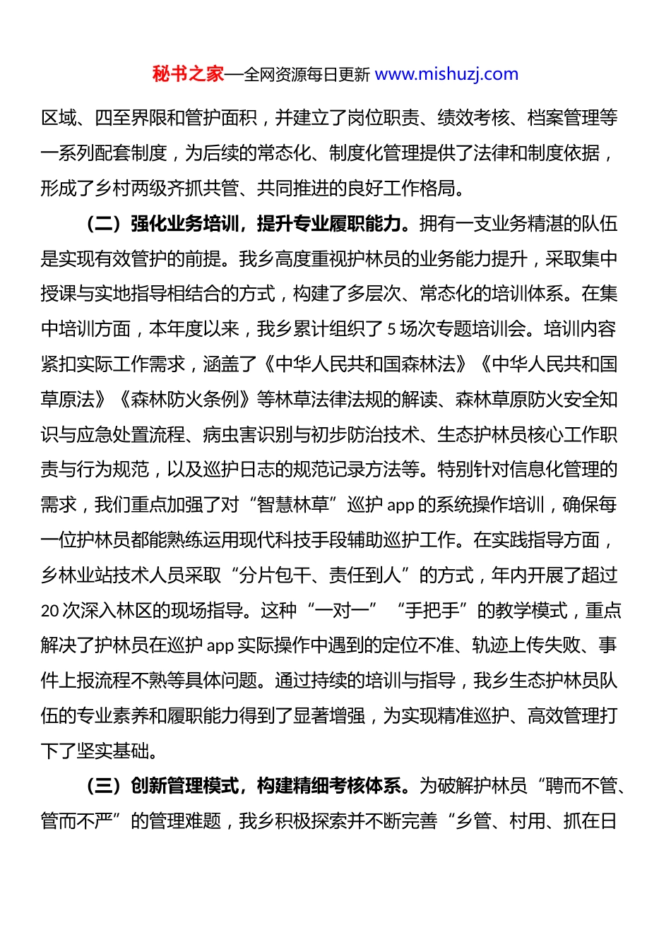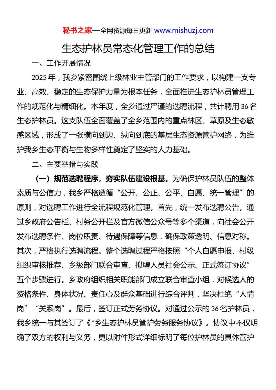 秘书之家—全网资源每日更新 www.mishuzj.com生态护林员常态化管理工作的总结一、工作开展情况2025 年,我乡紧密围绕上级林业主管部门的工作要求,以构建一支专业、高效、稳定的生态保护力量为根本任务,全面推进生态护林员管理工作的规范化与精细化。本年度,全乡通过严谨的选聘流程,共计聘用 36 名生态护林员。这支队伍全面覆盖了全乡范围内的重点林区、草原及生态敏感区域,形成了一张横向到边、纵向到底的基层生态资源管护网络,为维护我乡生态平衡与生物多样性奠定了坚实的人力基础。二、主要举措与实践(一)规范选聘程序,夯实队伍建设根基。为确保护林员队伍的整体素质与公信力,我乡严格遵循“公开、公正、公平、自愿、统一管理”的原则,对选聘工作进行全流程规范化管理。首先,统一发布选聘公告。通过乡政府公告栏、村务公开栏及官方微信公众号等多个渠道,向社会公开发布选聘条件、岗位职责、待遇保障等信息,确保政策透明、信息对称。其次,严格执行选聘流程。整个选聘过程严格按照“个人自愿申报、村级组织审核推荐、乡级部门联合审查、拟聘人员社会公示、正式签订协议”五个步骤进行。乡政府组织相关职能部门成立联合审查小组,对候选人的资格条件、身体状况、责任心及群众基础进行综合评判,坚决杜绝“人情岗”“关系岗”。最后,签订正式劳务协议。对通过公示的 36 名护林员,我乡统一与其签订了《*乡生态护林员管护劳务服务协议》。协议中不仅明确了双方的权利与义务,更以附件形式详细标明了每位护林员的具体管护秘书之家—全网资源每日更新 www.mishuzj.com区域、四至界限和管护面积,并建立了岗位职责、绩效考核、档案管理等一系列配套制度,为后续的常态化、制度化管理提供了法律和制度依据,形成了乡村两级齐抓共管、共同推进的良好工作格局。(二)强化业务培训,提升专业履职能力。拥有一支业务精湛的队伍是实现有效管护的前提。我乡高度重视护林员的业务能力提升,采取集中授课与实地指导相结合的方式,构建了多层次、常态化的培训体系。在集中培训方面,本年度以来,我乡累计组织了 5 场次专题培训会。培训内容紧扣实际工作需求,涵盖了《中华人民共和国森林法》《中华人民共和国草原法》《森林防火条例》等林草法律法规的解读、森林草原防火安全知识与应急处置流程、病虫害识别与初步防治技术、生态护林员核心工作职责与行为规范,以及巡护日志的规范记录方法等。特别针对信息化管理的需求,我们重点加强了对“智慧林草”巡护 app 的系统操作培训,确保每一位护林员都能熟练运用现代科技手段辅助巡护工作。在实践指导方面,乡林业站技术人员采取“分片包干、责任到人”的方式,年内开展了超过20 次深入林区的现场指导。这种“一对一”“手把手”的教学模式,重点解决了护林员在巡护 app 实际操作中遇到的定位不准、轨迹上传失败、事件上报流程不熟等具体问题。通过持续的培训与指导,我乡生态护林员队伍的专业素养和履职能力得到了显著增强,为实现精准巡护、高效管理打下了坚实基础。(三)创新管理模式,构建精细考核体系。为破解护林员“聘而不管、管而不严”的管理难题,我乡积极探索并不断完善“乡管、村用、抓在日秘书之家—全网资源每日更新 www.mishuzj.com常、严在考核”的管理机制。我们坚持“乡管村用”的管理原则。乡政府作为管理主体,负责护林员的选聘、培训、考核和薪酬发放;行政村作为用人单位,负责护林员的日常调度、工作安排和初步监督。这种模式既保证了管理的统一性和权威性,又充分发挥了村级组织就近管理的优势。我们建立了与绩效紧密挂钩的考核体系。对在聘的生态护林员实行一年一聘的动态管理,并制定了详尽的月度及年度考核办法。考核内容不仅包括出勤率等基本要求,更将巡护 app 的后台数据作为核心依据,重点考核巡护里程、巡护时长、巡护轨迹覆盖率以及信息上报的及时性与准确性。例如,我们明确规定每位护林员每月有效巡护天数不得少于 22 天。每月由村委会对护林员的巡护日志和日常表现进行初核,乡林业站结合 app 后台数据进行复核,形成最终考核结果。考核结果直接与护林员的绩效报酬和次年...