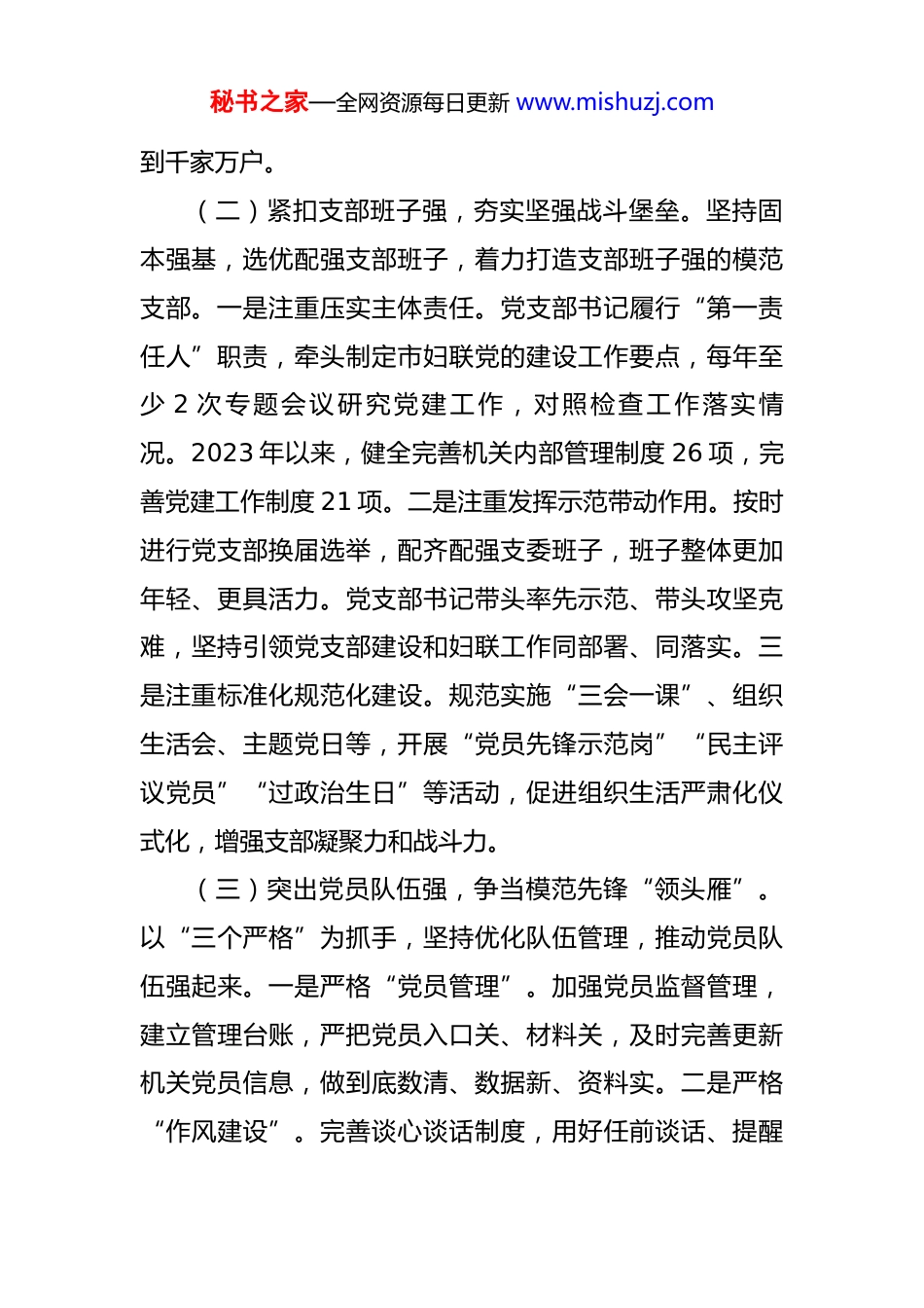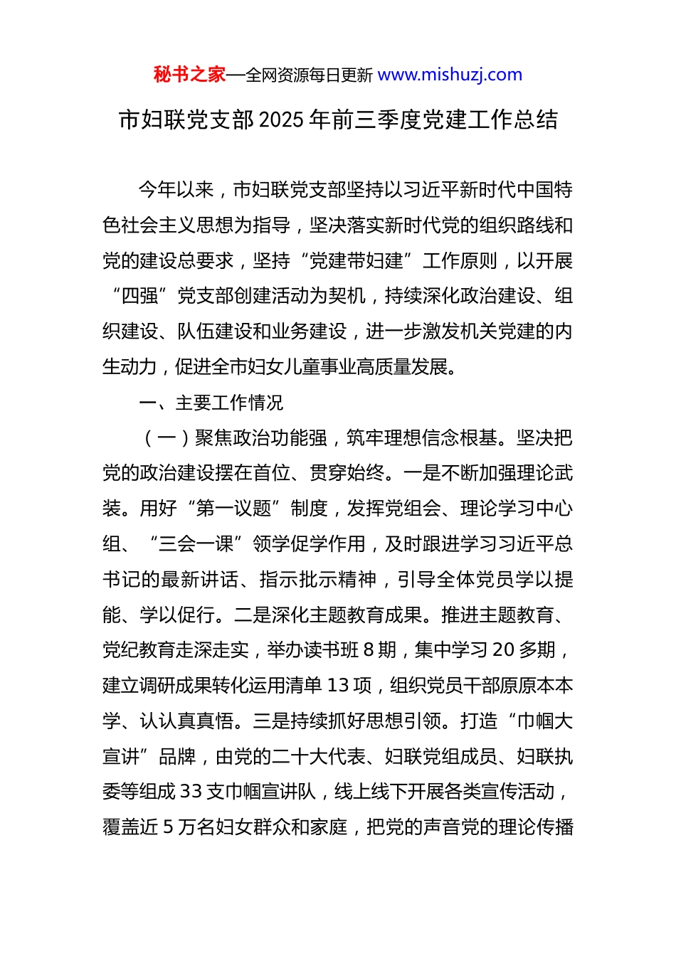 秘书之家—全网资源每日更新 www.mishuzj.com市妇联党支部 2025 年前三季度党建工作总结 今年以来,市妇联党支部坚持以习近平新时代中国特色社会主义思想为指导,坚决落实新时代党的组织路线和党的建设总要求,坚持“党建带妇建”工作原则,以开展“四强”党支部创建活动为契机,持续深化政治建设、组织建设、队伍建设和业务建设,进一步激发机关党建的内生动力,促进全市妇女儿童事业高质量发展。一、主要工作情况(一)聚焦政治功能强,筑牢理想信念根基。坚决把党的政治建设摆在首位、贯穿始终。一是不断加强理论武装。用好“第一议题”制度,发挥党组会、理论学习中心组、“三会一课”领学促学作用,及时跟进学习习近平总书记的最新讲话、指示批示精神,引导全体党员学以提能、学以促行。二是深化主题教育成果。推进主题教育、党纪教育走深走实,举办读书班 8 期,集中学习 20 多期,建立调研成果转化运用清单 13 项,组织党员干部原原本本学、认认真真悟。三是持续抓好思想引领。打造“巾帼大宣讲”品牌,由党的二十大代表、妇联党组成员、妇联执委等组成 33 支巾帼宣讲队,线上线下开展各类宣传活动,覆盖近 5 万名妇女群众和家庭,把党的声音党的理论传播秘书之家—全网资源每日更新 www.mishuzj.com到千家万户。(二)紧扣支部班子强,夯实坚强战斗堡垒。坚持固本强基,选优配强支部班子,着力打造支部班子强的模范支部。一是注重压实主体责任。党支部书记履行“第一责任人”职责,牵头制定市妇联党的建设工作要点,每年至少 2 次专题会议研究党建工作,对照检查工作落实情况。2023 年以来,健全完善机关内部管理制度 26 项,完善党建工作制度 21 项。二是注重发挥示范带动作用。按时进行党支部换届选举,配齐配强支委班子,班子整体更加年轻、更具活力。党支部书记带头率先示范、带头攻坚克难,坚持引领党支部建设和妇联工作同部署、同落实。三是注重标准化规范化建设。规范实施“三会一课”、组织生活会、主题党日等,开展“党员先锋示范岗”“民主评议党员”“过政治生日”等活动,促进组织生活严肃化仪式化,增强支部凝聚力和战斗力。(三)突出党员队伍强,争当模范先锋“领头雁”。以“三个严格”为抓手,坚持优化队伍管理,推动党员队伍强起来。一是严格“党员管理”。加强党员监督管理,建立管理台账,严把党员入口关、材料关,及时完善更新机关党员信息,做到底数清、数据新、资料实。二是严格“作风建设”。完善谈心谈话制度,用好任前谈话、提醒秘书之家—全网资源每日更新 www.mishuzj.com谈话等方式,开展批评和自我批评,经常敲响思想警钟,筑牢拒腐防变的思想道德防线。三是严格“队伍建设”。大力推广“1+10”妇女代表联系群众、万名妇联执委亮身份强服务、巾帼志愿服务微治理等工作方法,将党员先锋岗设置在服务妇女儿童最前沿,着力打造一支忠诚干净担当的妇联党员干部队伍。(四)围绕作用发挥强,凝聚干事创业合力。充分发挥桥梁纽带作用,激励党员亮身份、走在前、做表率,助力经济社会高质量发展。一是推动女性建功立业助力经济发展。打造富有特色的“巾帼优坊”品牌,开发“妈妈岗”灵活就业岗位,打造 54 个巾帼创业就业基地,帮助 4万余名女性创业就业。开展巾帼植树活动 1690 场次,建设各级“美丽庭院”1 万多户,为“百千万工程”和绿美生态建设作出贡献。二是聚焦困难妇女儿童做好关心关爱。坚持“我为群众办实事”,依托“姐妹情深 10 元捐”“温暖同心情满鼍城”等品牌项目,共筹集资金、物资 700 万元,服务妇女儿童 1.5 万人次。举办全省首场湾区“爱心妈妈”结对关爱活动,率先推动“爱心妈妈”向粤港澳大湾区延伸覆盖。目前,共招募 3544 名“爱心妈妈”结对帮扶 3656 名儿童。三是做实维权服务为基层社会治理添彩。大力发展巾帼志愿服务活动,建立“巾帼网格”工作机秘书之家—全网资源每日更新 www.mishuzj.com制,“建设法治巾帼在行动”吸引了 260 万人次参与。建好用好妇女维权阵地,采取“妇联党员干部+法律志愿者”服务模式,帮助妇女化解婚姻家庭矛盾纠纷,助力法治平安建设。二、...