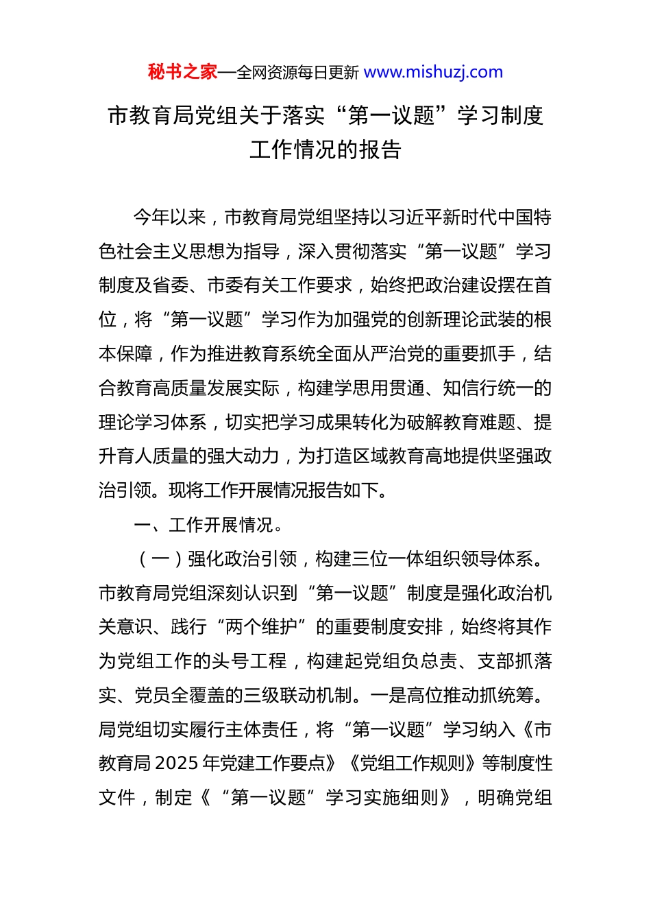 秘书之家—全网资源每日更新 www.mishuzj.com市教育局党组关于落实“第一议题”学习制度工作情况的报告 今年以来,市教育局党组坚持以习近平新时代中国特色社会主义思想为指导,深入贯彻落实“第一议题”学习制度及省委、市委有关工作要求,始终把政治建设摆在首位,将“第一议题”学习作为加强党的创新理论武装的根本保障,作为推进教育系统全面从严治党的重要抓手,结合教育高质量发展实际,构建学思用贯通、知信行统一的理论学习体系,切实把学习成果转化为破解教育难题、提升育人质量的强大动力,为打造区域教育高地提供坚强政治引领。现将工作开展情况报告如下。一、工作开展情况。(一)强化政治引领,构建三位一体组织领导体系。市教育局党组深刻认识到“第一议题”制度是强化政治机关意识、践行“两个维护”的重要制度安排,始终将其作为党组工作的头号工程,构建起党组负总责、支部抓落实、党员全覆盖的三级联动机制。一是高位推动抓统筹。局党组切实履行主体责任,将“第一议题”学习纳入《市教育局 2025 年党建工作要点》《党组工作规则》等制度性文件,制定《“第一议题”学习实施细则》,明确党组秘书之家—全网资源每日更新 www.mishuzj.com会、理论学习中心组学习、专题民主生活会等 6 类会议必须严格落实“第一议题”要求。党组书记认真履行第一责任人职责,全年主持召开党组会“第一议题”学习 28 次,带头领学《习近平谈治国理政》(第五卷)等重要文献,带头撰写《以教育数字化赋能基础教育高质量发展》等理论文章 5 篇,形成一把手抓学习、班子成员带学习的示范效应。二是专班推进强落实。成立由党组书记任组长的“第一议题”学习领导小组,下设办公室(设在机关党委),统筹协调局机关及直属单位学习安排。建立双随机一通报督导机制,通过列席支部学习、调阅学习记录、开展专项检查等方式,全年对 42 个直属党组织开展全覆盖督查,针对学习碎片化记录不规范等问题发出整改通知书 7份,确保学习制度刚性执行。三是分层覆盖抓延伸。构建党组中心组领学+机关支部研学+基层党支部践学三级学习体系。党组中心组重点围绕习近平总书记关于教育的重要论述开展专题研讨;机关党支部结合“三会一课”开展每周一学;直属学校党组织通过书记讲堂党员示范课等载体推动学习向一线教师延伸。全年组织开展市级教育系统“第一议题”示范学习会 3 场,覆盖党员干部 1.2 万人次,形成上下贯通的学习格局。(二)创新学习载体,打造四维融合学习矩阵。立足秘书之家—全网资源每日更新 www.mishuzj.com作为区域核心引擎的区位优势,聚焦教育领域改革发展实际,创新推出理论+实践+数字+文化四维学习模式,推动理论学习走深走实。一是理论铸魂,深化专题化学习。紧扣学习贯彻党的二十大精神推进教育强国建设等主题,邀请中山大学、华南师范大学等高校专家学者开展专题讲座12 场,组织《习近平新时代中国特色社会主义思想专题摘编》等重要文献专题研读会 8 次。围绕“双减”拔尖创新人才培养教育数字化等教育热点,开展局长领题调研活动,形成《市基础教育集团化办学提质增效路径研究》等调研报告 9 份,其中 3 项成果被纳入市委决策参考。二是实践赋能,开展场景化研学。打造行走的思政课实践品牌,组织党员干部赴中共三大会址纪念馆、黄埔军校旧址等红色教育基地开展现场教学 6 次;结合百校千企协同育人行动,赴广汽集团、实验室等单位开展产学研用对接活动,推动党员干部在服务产业发展中深化理论认知。创新开展我为教育献一策金点子征集活动,收到优化课后服务推进家校社协同育人等建议 236 条,其中 18 条转化为具体政策举措。数字提效。拓展智能化平台。依托学习强国教育平台、智慧教育公共服务平台,开发“第一议题”学习专栏,上线理论微课政策解读等数字化资源 56 个,实现学习资源一键直达。建立穗教先锋微信学习群,每日推送秘书之家—全网资源每日更新 www.mishuzj.com总书记教育金句,定期开展云端学习分享会,全年累计发布学习内容 320 期,参与线上互动党员达 8.7 万人次,获评省党员教育信息化示范单位。三是文化浸润,构建...