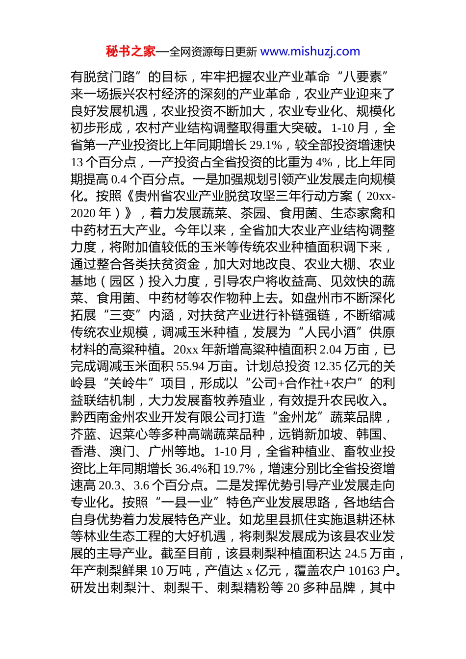 秘书之家—全网资源每日更新 www.mishuzj.com投资结构变化推动贵州高质量发展情况调研报告*的 xx 大报告指出,我国经济已由高速增长阶段转向高质量发展阶段,正处在转变发展方式、优化经济结构、转换增长动力的攻关期,推动高质量发展是当前和今后一个时期确定发展思路、制定经济政策、实施宏观调控的根本要求。20xx 年是推动高质量发展的起始年,为深入了解今年以来全省投资结构变化推动高质量发展情况,摸清投资结构、投资效益、转型升级方面突出的亮点、存在的不足发展的短板,分析当前投资发展“质”的情况,研判投资结构在经济结构调整中的先导作用发挥情况,为下一步优化全省投资结构促进经济高质量发展提供有益参考,省统计局从 9 月份开始组织开展投资结构变化推动贵州高质量发展情况调研,现将有关情况报告如下。一、扩大有效投资取得新突破,有力助推高质量发展调研表明,今年以来,贵州省坚持把提高供给质量作为供给侧结构性改革的主攻方向,围绕稳投资、稳增长、优结构、促脱贫,全力推动扩大有效投资取得新突破,强动能、补短板、促效率,充分发挥投资在促进经济增长中的关键作用,总体呈现投资结构优化、投资效益提升、转型升级加快的特点,固定资产投资实现持续较快增长,为推动高质量发展发挥了正向的促进作用。(一)三次产业投资结构持续调整,引导经济结构不断优化1、一产投资带动农业结构调整步伐加快。全省深入推进乡村振兴战略,加快推动产业扶贫,把产业扶贫作为脱贫攻坚的“第一场硬仗”,围绕“户户有增收项目、人人秘书之家—全网资源每日更新 www.mishuzj.com有脱贫门路”的目标,牢牢把握农业产业革命“八要素”来一场振兴农村经济的深刻的产业革命,农业产业迎来了良好发展机遇,农业投资不断加大,农业专业化、规模化初步形成,农村产业结构调整取得重大突破。1-10 月,全省第一产业投资比上年同期增长 29.1%,较全部投资增速快13 个百分点,一产投资占全省投资的比重为 4%,比上年同期提高 0.4 个百分点。一是加强规划引领产业发展走向规模化。按照《贵州省农业产业脱贫攻坚三年行动方案(20xx-2020 年)》,着力发展蔬菜、茶园、食用菌、生态家禽和中药材五大产业。今年以来,全省加大农业产业结构调整力度,将附加值较低的玉米等传统农业种植面积调下来,通过整合各类扶贫资金,加大对地改良、农业大棚、农业基地(园区)投入力度,引导农户将收益高、见效快的蔬菜、食用菌、中药材等农作物种上去。如盘州市不断深化拓展“三变”内涵,对扶贫产业进行补链强链,不断缩减传统农业规模,调减玉米种植,发展为“人民小酒”供原材料的高粱种植。20xx 年新增高粱种植面积 2.04 万亩,已完成调减玉米面积 55.94 万亩。计划总投资 12.35 亿元的关岭县“关岭牛”项目,形成以“公司+合作社+农户”的利益联结机制,大力发展畜牧养殖业,有效提升农民收入。黔西南金州农业开发有限公司打造“金州龙”蔬菜品牌,芥蓝、迟菜心等多种高端蔬菜品种,远销新加坡、韩国、香港、澳门、广州等地。1-10 月,全省种植业、畜牧业投资比上年同期增长 36.4%和 19.7%,增速分别比全省投资增速高 20.3、3.6 个百分点。二是发挥优势引导产业发展走向专业化。按照“一县一业”特色产业发展思路,各地结合自身优势着力发展特色产业。如龙里县抓住实施退耕还林等林业生态工程的大好机遇,将刺梨发展成为该县农业发展的主导产业。截至目前,该县刺梨种植面积达 24.5 万亩,年产刺梨鲜果 10 万吨,产值达 x 亿元,覆盖农户 10163 户。研发出刺梨汁、刺梨干、刺梨精粉等 20 多种品牌,其中秘书之家—全网资源每日更新 www.mishuzj.com“龙里刺梨”“龙里刺梨干”相继荣获国家地理标志保护三是三产融合助推农业产业发展再升级。以园区为依托,完善园区基础设施建设,多元化引进产业,促进一、二、三产业融合发展。如水城县猕猴桃产业示范园区整合财政资金 12.3 亿元用于完善园区水电讯路等基础设施,种植猕猴桃 10.05 万亩,引进 2 家科研机构,建成产学研基地 2 个,建成库容 13400 立方米保鲜库 4 座。按照“农旅一体化、产加...