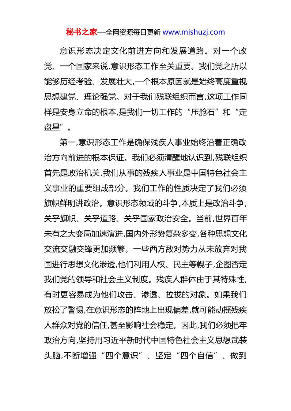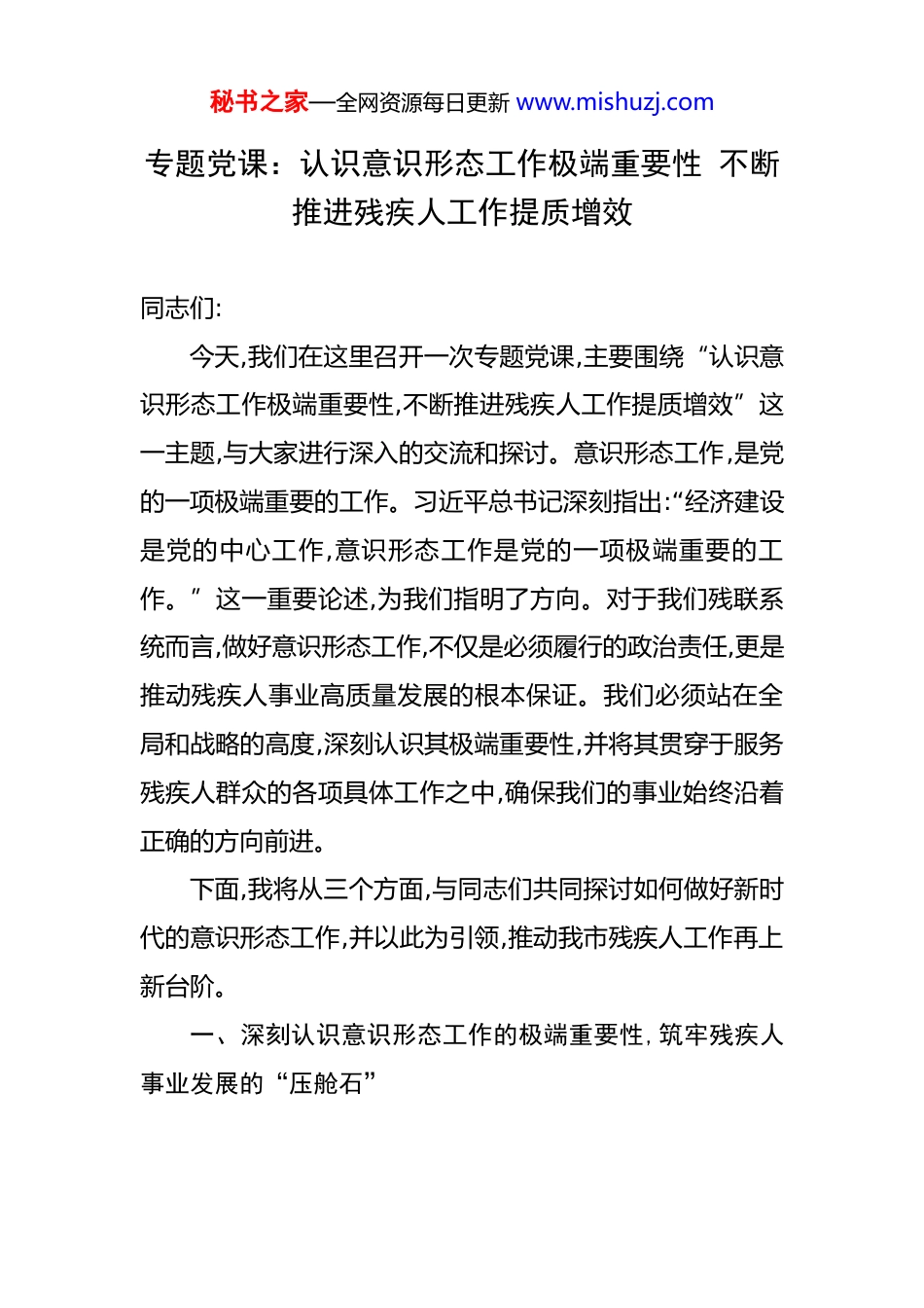 秘书之家—全网资源每日更新 www.mishuzj.com专题党课:认识意识形态工作极端重要性 不断推进残疾人工作提质增效 同志们:今天,我们在这里召开一次专题党课,主要围绕“认识意识形态工作极端重要性,不断推进残疾人工作提质增效”这一主题,与大家进行深入的交流和探讨。意识形态工作,是党的一项极端重要的工作。习近平总书记深刻指出:“经济建设是党的中心工作,意识形态工作是党的一项极端重要的工作。”这一重要论述,为我们指明了方向。对于我们残联系统而言,做好意识形态工作,不仅是必须履行的政治责任,更是推动残疾人事业高质量发展的根本保证。我们必须站在全局和战略的高度,深刻认识其极端重要性,并将其贯穿于服务残疾人群众的各项具体工作之中,确保我们的事业始终沿着正确的方向前进。下面,我将从三个方面,与同志们共同探讨如何做好新时代的意识形态工作,并以此为引领,推动我市残疾人工作再上新台阶。一、深刻认识意识形态工作的极端重要性,筑牢残疾人事业发展的“压舱石”秘书之家—全网资源每日更新 www.mishuzj.com意识形态决定文化前进方向和发展道路。对一个政党、一个国家来说,意识形态工作至关重要。我们党之所以能够历经考验、发展壮大,一个根本原因就是始终高度重视思想建党、理论强党。对于我们残联组织而言,这项工作同样是安身立命的根本,是我们一切工作的“压舱石”和“定盘星”。第一,意识形态工作是确保残疾人事业始终沿着正确政治方向前进的根本保证。我们必须清醒地认识到,残联组织首先是政治机关,我们从事的残疾人事业是中国特色社会主义事业的重要组成部分。我们工作的性质决定了我们必须旗帜鲜明讲政治。意识形态领域的斗争,本质上是政治斗争,关乎旗帜、关乎道路、关乎国家政治安全。当前,世界百年未有之大变局加速演进,国内外形势复杂多变,各种思想文化交流交融交锋更加频繁。一些西方敌对势力从未放弃对我国进行思想文化渗透,他们利用人权、民主等幌子,企图否定我们党的领导和社会主义制度。残疾人群体由于其特殊性,有时更容易成为他们攻击、渗透、拉拢的对象。如果我们放松了警惕,在意识形态的阵地上出现偏差,就可能动摇残疾人群众对党的信任,甚至影响社会稳定。因此,我们必须把牢政治方向,坚持用习近平新时代中国特色社会主义思想武装头脑,不断增强“四个意识”、坚定“四个自信”、做到秘书之家—全网资源每日更新 www.mishuzj.com“两个维护”,确保党的路线方针政策在残联系统得到不折不扣的贯彻执行,团结带领广大残疾人群众坚定不移听党话、感党恩、跟党走。第二,意识形态工作是凝聚广大残疾人群众、汇聚磅礴力量的强大武器。人心是最大的政治。意识形态工作的本质,是做人的工作,是争取人心的工作。我市现有持证残疾人约 35 万,他们是一个数量庞大、特性突出、需要特别关心关爱的群体。做好他们的工作,赢得他们的信赖和支持,是我们事业成功的关键。强大的意识形态,能够产生巨大的凝聚力和向心力。通过卓有成效的意识形态工作,我们可以将党的关怀和温暖,将社会主义大家庭的优越性,春风化雨般地传递给每一位残疾人及其家庭。我们可以通过宣传残疾人自强不息的奋斗故事,宣传社会各界扶残助残的感人事迹,在全社会营造理解、尊重、关心、帮助残疾人的浓厚氛围。这种正向的、积极的舆论环境,不仅能激励残疾人朋友们自尊、自信、自强、自立,更能汇聚起全社会的力量,共同推动残疾人事业的发展。反之,如果意识形态阵地失守,负面情绪、错误思想就会乘虚而入,不仅会消解残疾人朋友的奋斗意志,还可能引发社会矛盾,破坏我们来之不易的和谐稳定局面。秘书之家—全网资源每日更新 www.mishuzj.com第三,意识形态工作是防范化解重大风险、维护社会和谐稳定的必然要求。当前,我们正处在社会转型期和矛盾凸显期,涉及残疾人权益保障的各类问题,如康复、教育、就业、社会保障等,依然是社会关注的焦点。随着互联网和新媒体的迅猛发展,人人都有麦克风,思想观念和价值取向日趋多元。一条不实信息、一个极端个案,经过网络发酵,就可能被放大成对我们整个工作的质疑和否定,甚至演变为影响社会稳定的舆情事件。这些都是我们意识形态领域面临的现实风险和挑战。我们必须增...