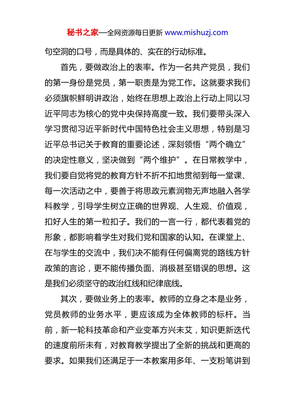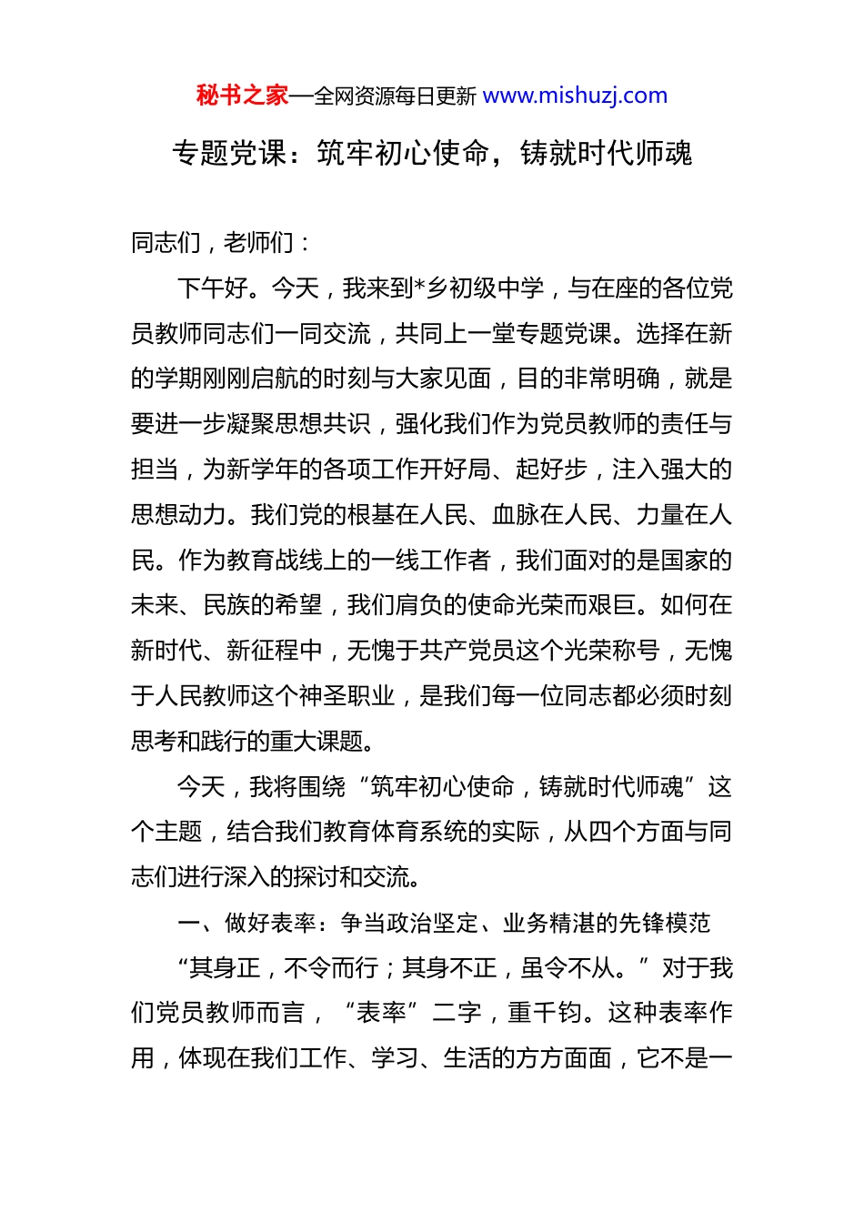 秘书之家—全网资源每日更新 www.mishuzj.com专题党课:筑牢初心使命,铸就时代师魂 同志们,老师们:下午好。今天,我来到*乡初级中学,与在座的各位党员教师同志们一同交流,共同上一堂专题党课。选择在新的学期刚刚启航的时刻与大家见面,目的非常明确,就是要进一步凝聚思想共识,强化我们作为党员教师的责任与担当,为新学年的各项工作开好局、起好步,注入强大的思想动力。我们党的根基在人民、血脉在人民、力量在人民。作为教育战线上的一线工作者,我们面对的是国家的未来、民族的希望,我们肩负的使命光荣而艰巨。如何在新时代、新征程中,无愧于共产党员这个光荣称号,无愧于人民教师这个神圣职业,是我们每一位同志都必须时刻思考和践行的重大课题。今天,我将围绕“筑牢初心使命,铸就时代师魂”这个主题,结合我们教育体育系统的实际,从四个方面与同志们进行深入的探讨和交流。一、做好表率:争当政治坚定、业务精湛的先锋模范“其身正,不令而行;其身不正,虽令不从。”对于我们党员教师而言,“表率”二字,重千钧。这种表率作用,体现在我们工作、学习、生活的方方面面,它不是一秘书之家—全网资源每日更新 www.mishuzj.com句空洞的口号,而是具体的、实在的行动标准。首先,要做政治上的表率。作为一名共产党员,我们的第一身份是党员,第一职责是为党工作。这就要求我们必须旗帜鲜明讲政治,始终在思想上政治上行动上同以习近平同志为核心的党中央保持高度一致。我们要带头深入学习贯彻习近平新时代中国特色社会主义思想,特别是习近平总书记关于教育的重要论述,深刻领悟“两个确立”的决定性意义,坚决做到“两个维护”。在日常教学中,我们要自觉将党的教育方针不折不扣地贯彻到每一堂课、每一次活动之中,要善于将思政元素润物无声地融入各学科教学,引导学生树立正确的世界观、人生观、价值观,扣好人生的第一粒扣子。我们的一言一行,都代表着党的形象,都影响着学生对我们党和国家的认知。在课堂上、在与学生的交流中,我们决不能有任何偏离党的路线方针政策的言论,更不能传播负面、消极甚至错误的思想。这是我们必须坚守的政治红线和纪律底线。其次,要做业务上的表率。教师的立身之本是业务,党员教师的业务水平,更应该成为全体教师的标杆。当前,新一轮科技革命和产业变革方兴未艾,知识更新迭代的速度前所未有,对教育教学提出了全新的挑战和更高的要求。如果我们还满足于一本教案用多年、一支粉笔讲到秘书之家—全网资源每日更新 www.mishuzj.com底的传统模式,那么我们不仅会落后于时代,更会耽误学生的发展。我们县教育体育局近年来大力推进教育数字化转型,实施了“智慧校园赋能计划”,截至今年 8 月底,全县中小学智慧教室覆盖率已达到 85%,多媒体教学终端的普及率更是超过了 95%。这些现代化的教学设施不是摆设,而是我们提升教学质量、促进教育公平的利器。我希望在座的党员教师们,要带头学习新知识、掌握新技能、运用新方法。要在深化课堂教学改革中当先锋,积极探索项目式学习、探究式学习等新的教学模式,打破“满堂灌”的沉闷局面,真正把课堂还给学生,激发学生的学习兴趣和创新精神。要带头参与课题研究,将教学中遇到的问题转化为研究的课题,用科研的思维和方法破解教学难题,不断提升自身的专业素养和教研能力。只有我们自己成为学习型、研究型的教师,才能培养出创新型、发展型的人才。最后,要做生活中的表率。党员教师的形象,不仅树立在三尺讲台,更树立在日常生活的点点滴滴。我们要带头遵守社会公德、职业道德、家庭美德,在言谈举止、待人接物中展现出共产党人的高尚情操和人格魅力。在学校里,我们要团结同事,关心爱护每一位学生,特别是对那些家庭困难、学习有困难的后进生,要给予更多的温暖和秘书之家—全网资源每日更新 www.mishuzj.com帮助,让他们感受到党的关怀和学校大家庭的温暖。在社会上,我们要遵纪守法,举止文明,积极参与社会公益活动,以实际行动赢得社会的尊重。在家庭中,我们要孝敬长辈,教育子女,建设文明和谐的家风,为全社会树立榜样。一个优秀的党员教师,必然是一个在任何场合都...