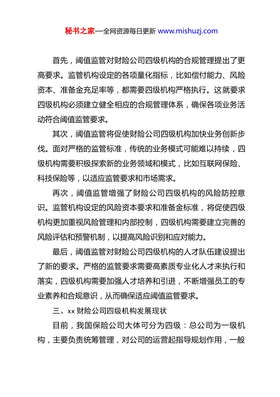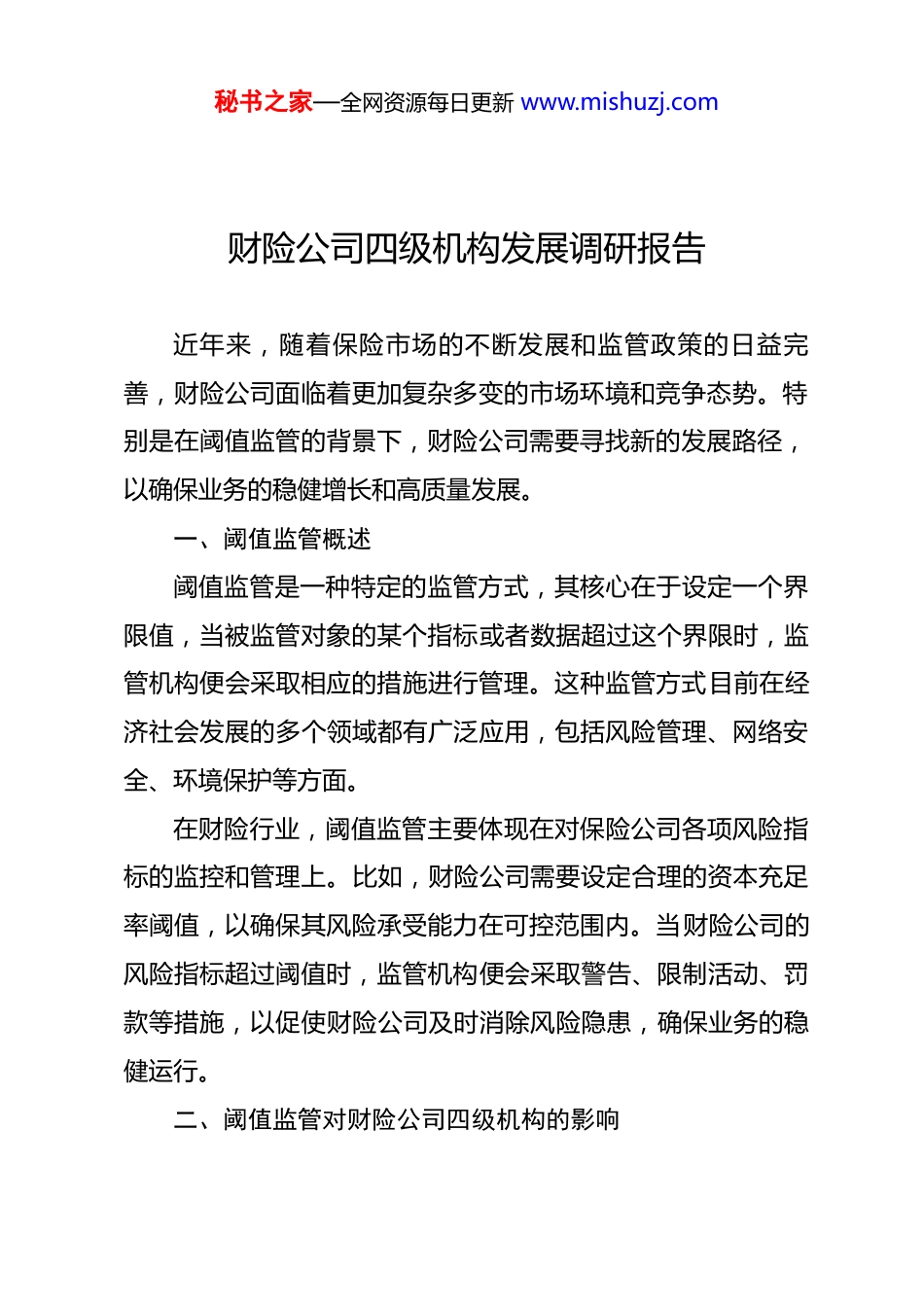 秘书之家—全网资源每日更新 www.mishuzj.com财险公司四级机构发展调研报告近年来,随着保险市场的不断发展和监管政策的日益完善,财险公司面临着更加复杂多变的市场环境和竞争态势。特别是在阈值监管的背景下,财险公司需要寻找新的发展路径,以确保业务的稳健增长和高质量发展。一、阈值监管概述阈值监管是一种特定的监管方式,其核心在于设定一个界限值,当被监管对象的某个指标或者数据超过这个界限时,监管机构便会采取相应的措施进行管理。这种监管方式目前在经济社会发展的多个领域都有广泛应用,包括风险管理、网络安全、环境保护等方面。在财险行业,阈值监管主要体现在对保险公司各项风险指标的监控和管理上。比如,财险公司需要设定合理的资本充足率阈值,以确保其风险承受能力在可控范围内。当财险公司的风险指标超过阈值时,监管机构便会采取警告、限制活动、罚款等措施,以促使财险公司及时消除风险隐患,确保业务的稳健运行。二、阈值监管对财险公司四级机构的影响秘书之家—全网资源每日更新 www.mishuzj.com首先,阈值监管对财险公司四级机构的合规管理提出了更高要求。监管机构设定的各项量化指标,比如偿付能力、风险资本、准备金充足率等,都需要四级机构严格执行。这就要求四级机构必须建立健全相应的合规管理体系,确保各项业务活动符合阈值监管要求。其次,阈值监管将促使财险公司四级机构加快业务创新步伐。面对严格的监管标准,传统的业务模式可能难以持续,四级机构需要积极探索新的业务领域和模式,比如互联网保险、科技保险等,以适应监管要求和市场需求。再次,阈值监管增强了财险公司四级机构的风险防控意识。监管机构设定的风险资本要求和准备金标准,将促使四级机构更加重视风险管理和内部控制,四级机构需要建立完善的风险评估和预警机制,以提高风险识别和应对能力。最后,阈值监管对财险公司四级机构的人才队伍建设提出了新的要求。严格的监管要求需要高素质专业化人才来执行和落实,四级机构需要加强人才培养和引进,不断增强员工的专业素养和合规意识,从而确保适应阈值监管要求。三、xx 财险公司四级机构发展现状目前,我国保险公司大体可分为四级:总公司为一级机构,主要负责统筹管理,对公司的运营起指导规划作用,一般秘书之家—全网资源每日更新 www.mishuzj.com不直接参与销售活动;分公司为二级机构,一般一个省份仅设立一个分公司,对于总公司的各项指示向下属机构进行有效传达,并将下属机构的问题有效汇总上报给总公司,在对三四级机构进行统筹管理的同时兼任部分营销业务;三级机构一般称为中心支公司,多数存在于经济实力较强的市区,相较于二级机构,中心支公司的统筹管理职能有所下降,营销业务职能大幅上升;四级机构为支公司,类似于银行网点,直接面对客户,向客户进行营销活动或业务服务。截至 2024 年底,xx 财险公司共有支公司 xx 家,营销服务部 xx 家,营业部 xx 家。财险公司的四级机构通常指的是基层的分支机构或营业部,它们承担着直接与客户接触、销售保险产品、处理理赔等业务的重要职责。然而,在当前的市场环境下,xx 财险公司四级机构面临着诸多困难与挑战:一是市场竞争加剧。随着保险市场的不断开放和竞争加剧,四级机构面临着来自同行和跨界竞争的双重压力。二是客户需求变化。随着消费者保险意识的提高和需求的多样化,四级机构需要更加灵活地制定保险产品来满足客户的个性化需求。三是监管政策收紧。在阈值监管的背景下,四级机构需要更加严格地遵守监管规定,从而确保业务的合规性和风险可控秘书之家—全网资源每日更新 www.mishuzj.com性。四是技术革新加速。随着大数据、人工智能等技术的不断发展,四级机构需要加快技术创新和应用,从而提升服务效率和客户体验。当前,xx 财险公司四级机构面临的发展困局客观上有行业激烈竞争带来的影响,但更深层次的原因还是四级机构对高质量发展的要求认识不到位,对国家政策方向和要求把握不够,对市场的应变能力滞后,发展惯性和路径依赖较重,具体来看有以下几个方面原因。一是思想认识有偏差,主动追求高质量发展的紧迫性不够。*的二十大报...