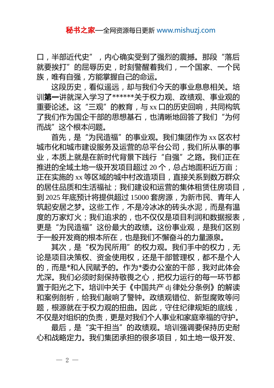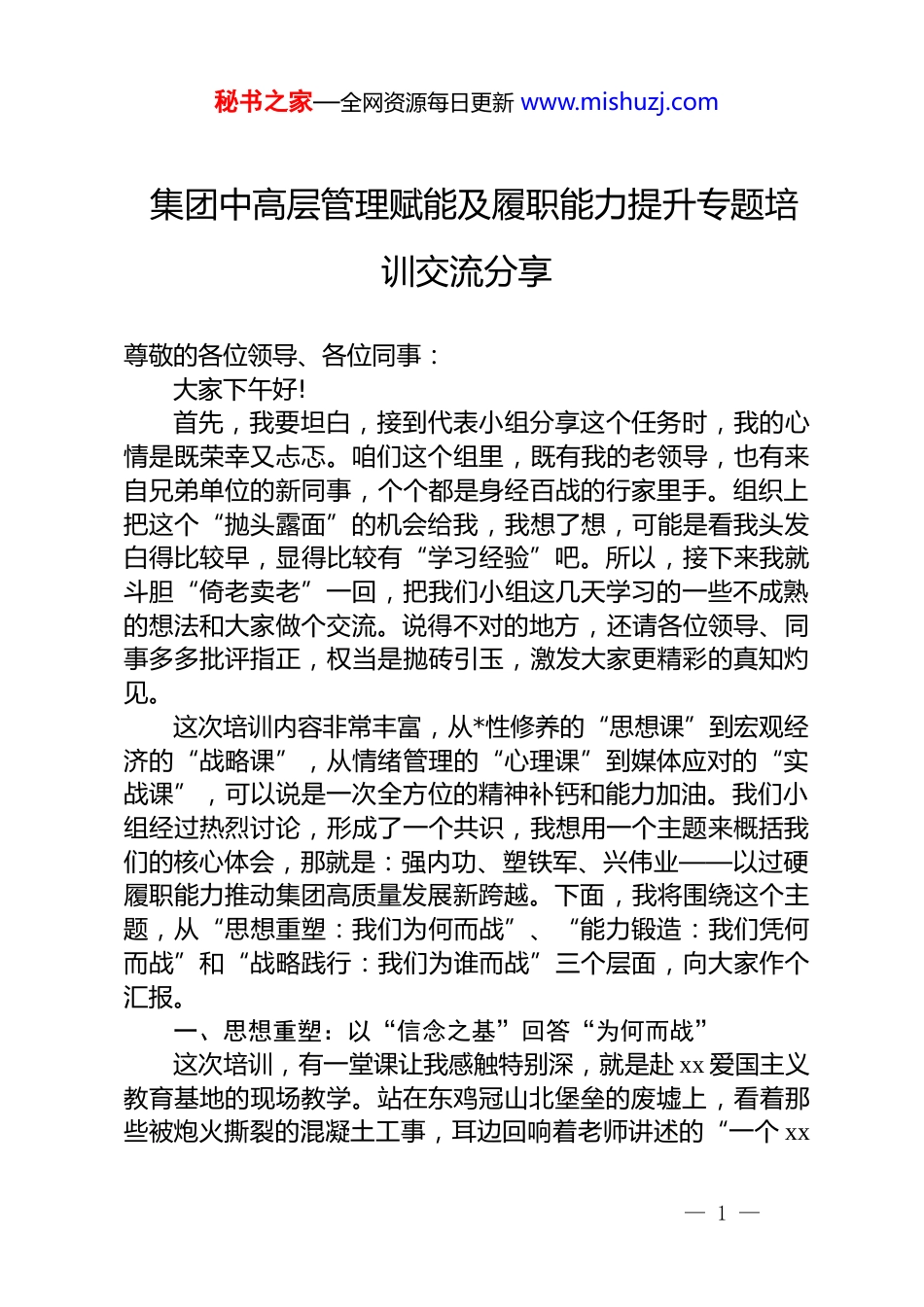 秘书之家—全网资源每日更新 www.mishuzj.com集团中高层管理赋能及履职能力提升专题培训交流分享尊敬的各位领导、各位同事:大家下午好!首先,我要坦白,接到代表小组分享这个任务时,我的心情是既荣幸又忐忑。咱们这个组里,既有我的老领导,也有来自兄弟单位的新同事,个个都是身经百战的行家里手。组织上把这个“抛头露面”的机会给我,我想了想,可能是看我头发白得比较早,显得比较有“学习经验”吧。所以,接下来我就斗胆“倚老卖老”一回,把我们小组这几天学习的一些不成熟的想法和大家做个交流。说得不对的地方,还请各位领导、同事多多批评指正,权当是抛砖引玉,激发大家更精彩的真知灼见。这次培训内容非常丰富,从*性修养的“思想课”到宏观经济的“战略课”,从情绪管理的“心理课”到媒体应对的“实战课”,可以说是一次全方位的精神补钙和能力加油。我们小组经过热烈讨论,形成了一个共识,我想用一个主题来概括我们的核心体会,那就是:强内功、塑铁军、兴伟业——以过硬履职能力推动集团高质量发展新跨越。下面,我将围绕这个主题,从“思想重塑:我们为何而战”、“能力锻造:我们凭何而战”和“战略践行:我们为谁而战”三个层面,向大家作个汇报。一、思想重塑:以“信念之基”回答“为何而战”这次培训,有一堂课让我感触特别深,就是赴 xx 爱国主义教育基地的现场教学。站在东鸡冠山北堡垒的废墟上,看着那些被炮火撕裂的混凝土工事,耳边回响着老师讲述的“一个 xx— 1 —秘书之家—全网资源每日更新 www.mishuzj.com口,半部近代史”,内心确实受到了强烈的震撼。那段“落后就要挨打”的屈辱历史,时刻警醒着我们,一个国家、一个民族,唯有自强,方能掌握自己的命运。这段历史,看似遥远,却与我们今天的事业息息相关。培训第一讲就深入学习了******关于权力观、政绩观、事业观的重要论述。这“三观”的教育,与 xx 口的历史回响,共同构筑了我们作为国企干部的思想基石,也清晰地回答了我们“为何而战”这个根本问题。首先,是“为民造福”的事业观。我们集团作为 xx 区农村城市化和城市建设服务及运营的总平台公司,我们所从事的事业,本质上就是在新时代背景下践行“自强”之路。我们正在推进的全域土地一级开发项目超过 20 个,总占地面积近万亩;正在实施的 xx 等区域的城中村改造项目,直接关系到数万群众的居住品质和生活福祉;我们建设和运营的集体租赁住房项目,到 2025 年底预计将提供超过 15000 套房源,为新市民、青年人筑起安居之梦。这些工作,不是冷冰冰的砖头水泥,而是有温度的万家灯火;我们追求的,也不仅仅是项目利润和数据报表,更是“为民造福”这份最大的政绩。这份事业观,是我们区别于一般开发商的根本所在,也是我们不懈奋斗的力量源泉。其次,是“权为民所用”的权力观。我们手中的权力,无论是项目决策权、资金使用权,还是干部管理权,都不是个人的,而是*和人民赋予的。作为*委办公室的干部,我对此体会尤深。我们必须时刻保持敬畏之心,把权力运行的每一环节都置于阳光之下。培训中关于《中国共产 dj 律处分条例》的解读和案例剖析,给我们敲响了警钟。政绩观错位、新型腐败等问题,根源就在于权力观的扭曲。因此,守住纪律规矩的底线,不仅是对组织的负责,更是对我们个人事业和家庭幸福的守护。最后,是“实干担当”的政绩观。培训强调要保持历史耐心和战略定力。我们集团承担的很多项目,如土地一级开发、— 2 —秘书之家—全网资源每日更新 www.mishuzj.com城市更新,周期长、任务重、协调难度大,不可能一蹴而就。这就要求我们必须摒弃急功近利的思想,发扬“功成不必在我,功成必定有我”的精神,一茬接着一茬干,一张蓝图绘到底。把正确的政绩观,体现在每一个项目的精雕细琢中,体现在每一次与百姓的坦诚沟通中。总而言之,通过思想的再学习、再重塑,我们更加坚定了自己的初心和使命。我们战斗,是为了这片土地的繁荣,为了区域人民的美好生活,这是我们作为 xx 区属国企人最根本的价值追求。二、能力锻造:以“成事之能”回答“凭何而战”明确了“为何而战”,接下来的问题就是“凭...
