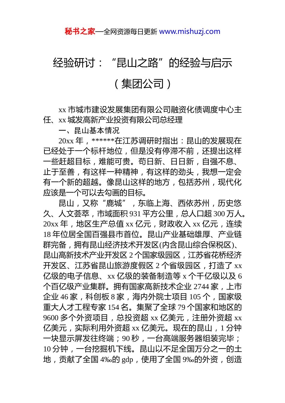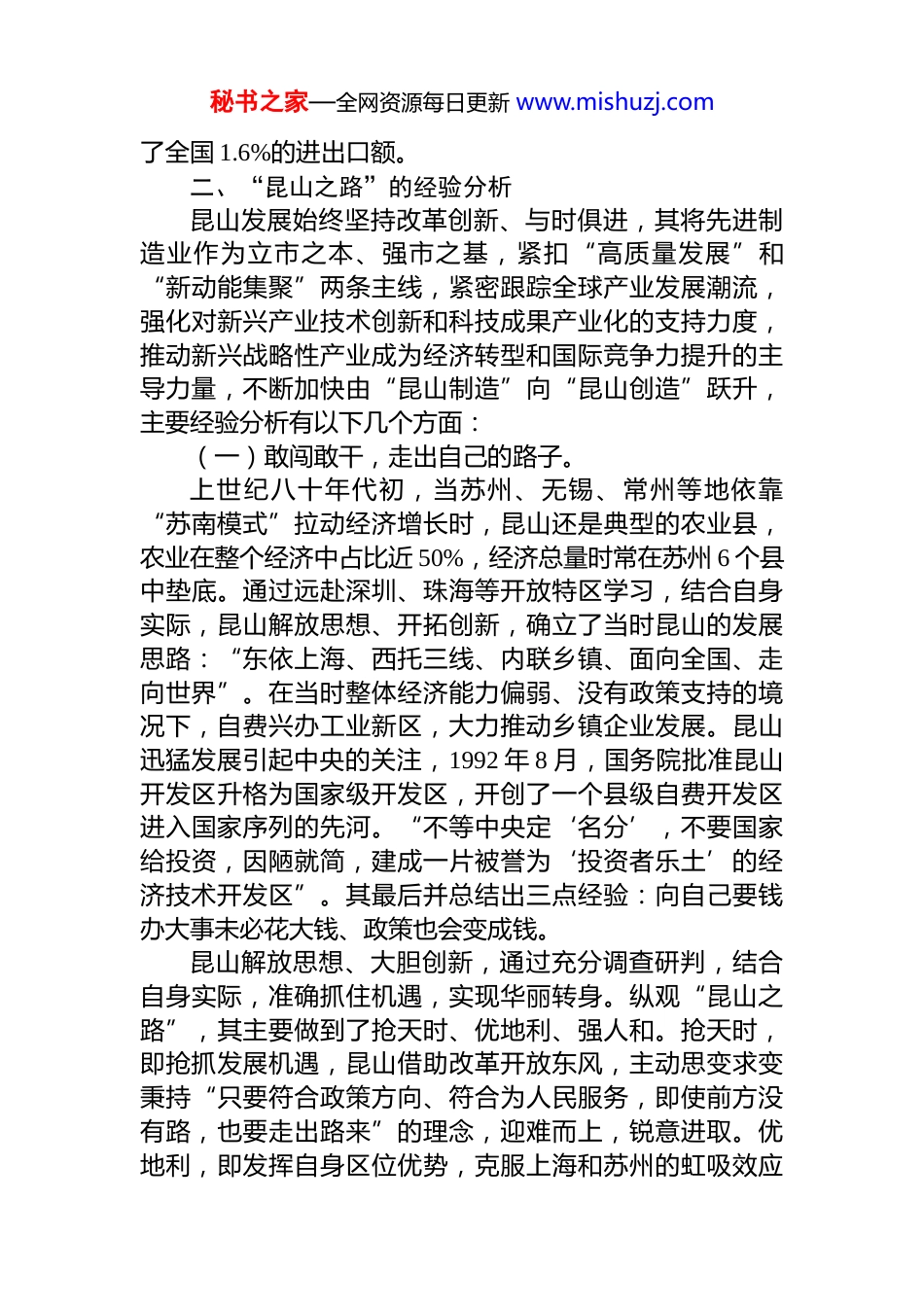 秘书之家—全网资源每日更新 www.mishuzj.com经验研讨:“昆山之路”的经验与启示(集团公司)xx 市城市建设发展集团有限公司融资化债调度中心主任、xx 城发高新产业投资有限公司总经理一、昆山基本情况20xx 年,******在江苏调研时指出:昆山的发展现在已经处于一个标杆地位,但是没有停滞不前,还提出这样一些赶超目标,难能可贵。苟日新、日日新,自强不息、止于至善,有这样一种精神,有这样的劲头,我想一定会有一个新的超越。像昆山这样的地方,包括苏州,现代化应该是一个可以去勾画的目标。昆山,又称“鹿城”,东临上海、西依苏州,历史悠久、人文荟萃,市域面积 931 平方公里,总人口超 300 万人。20xx 年,地区生产总值 xx 亿元,财政收入 xx 亿元,连续18 年位居全国百强县市首位。昆山产业基础雄厚、产业链群完备,拥有昆山经济技术开发区(内含昆山综合保税区)、昆山高新技术产业开发区 2 个国家级园区,江苏省花桥经济开发区、江苏省昆山旅游度假区 2 个省级园区,打造了 xx亿级的电子信息、xx 亿级的装备制造等 x 个千亿级以及 6个百亿级产业集群。拥有国家高新技术企业 2744 家,上市企业 46 家,科创板 8 家,海内外院士项目 105 个,国家级重大人才工程专家 154 名。集聚了全球 79 个国家和地区的9600 多个外资项目,总投资超 xx 亿美元,注册外资超 xx亿美元,实际利用外资超 xx 亿美元。现在的昆山,1 分钟一块显示屏发往终端;90 秒,一台高端服务器组装完毕;10 分钟,一台挖掘机下线。昆山以不足全国万分之一的土地,贡献了全国 4‰的 gdp,使用了全国 9‰的外资,创造秘书之家—全网资源每日更新 www.mishuzj.com了全国 1.6%的进出口额。二、“昆山之路”的经验分析昆山发展始终坚持改革创新、与时俱进,其将先进制造业作为立市之本、强市之基,紧扣“高质量发展”和“新动能集聚”两条主线,紧密跟踪全球产业发展潮流,强化对新兴产业技术创新和科技成果产业化的支持力度,推动新兴战略性产业成为经济转型和国际竞争力提升的主导力量,不断加快由“昆山制造”向“昆山创造”跃升,主要经验分析有以下几个方面:(一)敢闯敢干,走出自己的路子。上世纪八十年代初,当苏州、无锡、常州等地依靠“苏南模式”拉动经济增长时,昆山还是典型的农业县,农业在整个经济中占比近 50%,经济总量时常在苏州 6 个县中垫底。通过远赴深圳、珠海等开放特区学习,结合自身实际,昆山解放思想、开拓创新,确立了当时昆山的发展思路:“东依上海、西托三线、内联乡镇、面向全国、走向世界”。在当时整体经济能力偏弱、没有政策支持的境况下,自费兴办工业新区,大力推动乡镇企业发展。昆山迅猛发展引起中央的关注,1992 年 8 月,国务院批准昆山开发区升格为国家级开发区,开创了一个县级自费开发区进入国家序列的先河。“不等中央定‘名分’,不要国家给投资,因陋就简,建成一片被誉为‘投资者乐土’的经济技术开发区”。其最后并总结出三点经验:向自己要钱办大事未必花大钱、政策也会变成钱。昆山解放思想、大胆创新,通过充分调查研判,结合自身实际,准确抓住机遇,实现华丽转身。纵观“昆山之路”,其主要做到了抢天时、优地利、强人和。抢天时,即抢抓发展机遇,昆山借助改革开放东风,主动思变求变秉持“只要符合政策方向、符合为人民服务,即使前方没有路,也要走出路来”的理念,迎难而上,锐意进取。优地利,即发挥自身区位优势,克服上海和苏州的虹吸效应秘书之家—全网资源每日更新 www.mishuzj.com主动积极对接上海浦东改革发展需求,利用上海的辐射带动效应,培养出自身的产业结构和城市品牌。强人和,即靠昆山全体干部务实肯干,认准不放手、咬紧不松口的韧劲,围绕优化营商环境,不断创新体制机制,带动天时和地利更大更快发挥效应。(二)战略先行,务实进取绘蓝图。“昆山之路”经历了“农转工、内转外、散转聚、低转高、大转强”五个发展阶段。昆山从最初的“星期天工程师”、合办联营企业,到抓住浦东开发机遇、走出国门外向型发展,到现在长三角一体化,每次腾飞的背后都有“融入上海”...