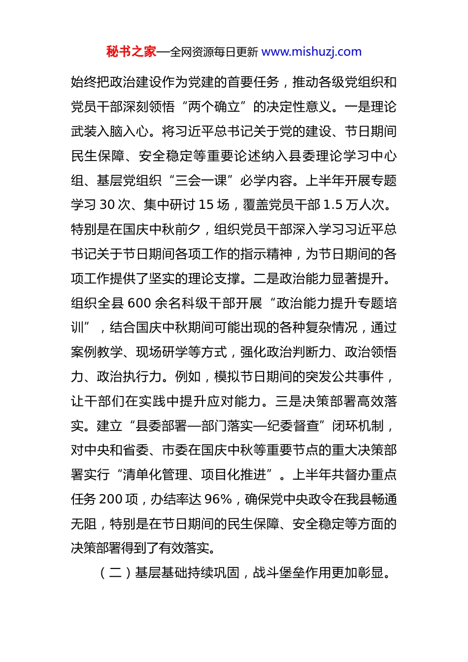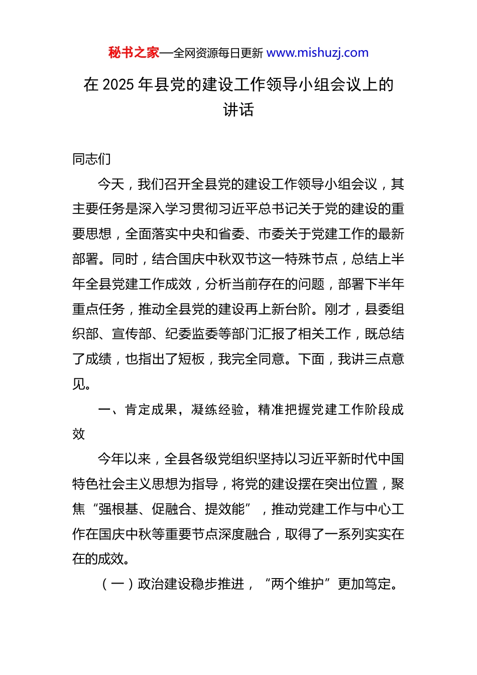 秘书之家—全网资源每日更新 www.mishuzj.com在 2025 年县党的建设工作领导小组会议上的讲话 同志们今天,我们召开全县党的建设工作领导小组会议,其主要任务是深入学习贯彻习近平总书记关于党的建设的重要思想,全面落实中央和省委、市委关于党建工作的最新部署。同时,结合国庆中秋双节这一特殊节点,总结上半年全县党建工作成效,分析当前存在的问题,部署下半年重点任务,推动全县党的建设再上新台阶。刚才,县委组织部、宣传部、纪委监委等部门汇报了相关工作,既总结了成绩,也指出了短板,我完全同意。下面,我讲三点意见。一、肯定成果,凝练经验,精准把握党建工作阶段成效今年以来,全县各级党组织坚持以习近平新时代中国特色社会主义思想为指导,将党的建设摆在突出位置,聚焦“强根基、促融合、提效能”,推动党建工作与中心工作在国庆中秋等重要节点深度融合,取得了一系列实实在在的成效。(一)政治建设稳步推进,“两个维护”更加笃定。秘书之家—全网资源每日更新 www.mishuzj.com始终把政治建设作为党建的首要任务,推动各级党组织和党员干部深刻领悟“两个确立”的决定性意义。一是理论武装入脑入心。将习近平总书记关于党的建设、节日期间民生保障、安全稳定等重要论述纳入县委理论学习中心组、基层党组织“三会一课”必学内容。上半年开展专题学习 30 次、集中研讨 15 场,覆盖党员干部 1.5 万人次。特别是在国庆中秋前夕,组织党员干部深入学习习近平总书记关于节日期间各项工作的指示精神,为节日期间的各项工作提供了坚实的理论支撑。二是政治能力显著提升。组织全县 600 余名科级干部开展“政治能力提升专题培训”,结合国庆中秋期间可能出现的各种复杂情况,通过案例教学、现场研学等方式,强化政治判断力、政治领悟力、政治执行力。例如,模拟节日期间的突发公共事件,让干部们在实践中提升应对能力。三是决策部署高效落实。建立“县委部署—部门落实—纪委督查”闭环机制,对中央和省委、市委在国庆中秋等重要节点的重大决策部署实行“清单化管理、项目化推进”。上半年共督办重点任务 200 项,办结率达 96%,确保党中央政令在我县畅通无阻,特别是在节日期间的民生保障、安全稳定等方面的决策部署得到了有效落实。(二)基层基础持续巩固,战斗堡垒作用更加彰显。秘书之家—全网资源每日更新 www.mishuzj.com坚持大抓基层的鲜明导向,推动基层党组织全面进步、全面过硬,为国庆中秋等节日期间的各项工作提供坚实的组织保障。一是组织体系更加严密。优化农村、社区、机关、国企、学校等领域党组织设置,结合节日期间人员流动大的特点,新建旅游景区党支部 10 个、返乡流动党员临时党支部 20 个,实现党的组织和工作“无死角覆盖”。在国庆中秋期间,这些党组织充分发挥作用,为游客和返乡群众提供了优质的服务。二是队伍建设成效斐然。实施“头雁工程”,选拔 230 名政治过硬、能力突出的党员担任村(社区)党组织书记,其中 35 岁以下年轻干部占比提升至 40%。开展“党员先锋岗”创建活动,全县 2.5 万名党员在国庆中秋期间认领服务岗位,累计为群众办实事10000 余件。例如,在节日期间,党员们积极参与交通疏导、景区秩序维护等工作,展现了党员的先锋模范作用。三是基层治理效能跃升。深化“党建+网格”治理模式,将全县划分为 1300 个基础网格,配备专兼职网格员 1600名。在国庆中秋期间,通过网格化解矛盾纠纷 3500 余起,化解率达 99%,群众满意度同比提升 7 个百分点。网格员们在节日期间加强对网格的巡查,及时发现和解决问题,确保了节日期间社会的和谐稳定。(三)党风廉政建设深入开展,清风正气更加充盈。秘书之家—全网资源每日更新 www.mishuzj.com始终保持惩治腐败的高压态势,加强党风廉政建设,为国庆中秋等节日营造风清气正的政治生态。一是廉政教育常抓不懈。开展廉政教育活动,通过廉政讲座、观看警示教育片等方式,引导党员干部增强廉洁自律意识。特别是在国庆中秋前夕,组织党员干部学习中央和省委、市委关于节日期间廉洁自律的要求,敲响廉洁警钟。二是监督检查全面覆盖。建立健全监督...