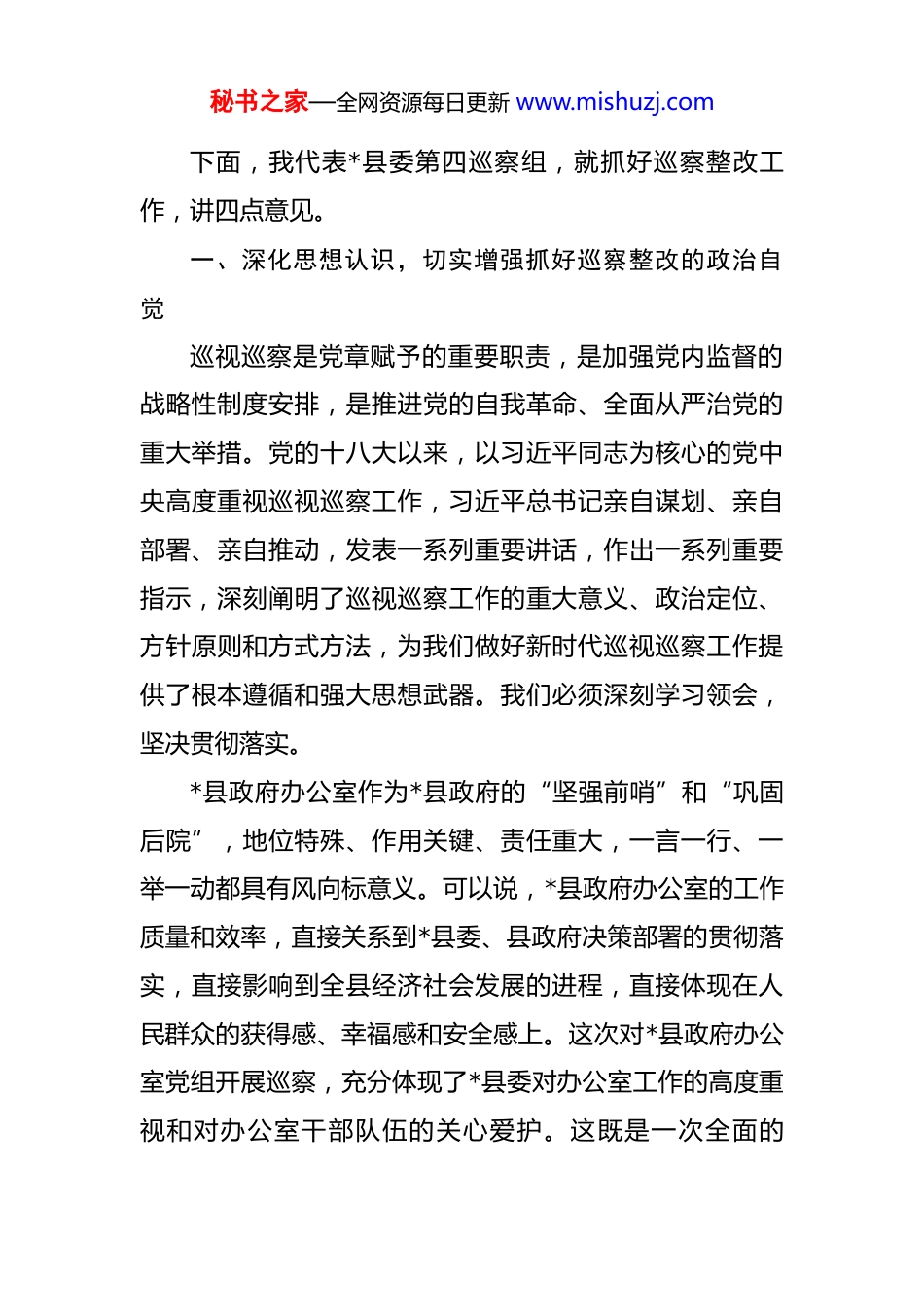 秘书之家—全网资源每日更新 www.mishuzj.com在 2025 年县委第四巡察组巡察县政府办公室党组情况反馈会议上的讲话 同志们:根据*县委关于巡察工作的统一部署,从 2025 年*月*日至*月*日,*县委第四巡察组对*县政府办公室党组进行了为期*天的常规巡察。在巡察期间,我们通过听取专题汇报、开展个别谈话、受理信访举报、调阅文件资料、走访下属单位等多种方式,深入了解情况,在*县政府办公室党组和全体干部职工的大力支持与积极配合下,顺利完成了本轮巡察任务。刚才,*同志代表巡察组,已经向大家全面反馈了巡察中发现的主要问题。在此之前,我们也已经按照要求,向*同志单独反馈了有关情况。今天我们召开这个反馈会议,主要目的就是开诚布公地指出问题、深入透彻地分析根源、明确具体地提出整改要求,这既是巡察工作的规定环节,更是我们共同履行管党治党政治责任的重要举措。希望*县政府办公室党组及全体党员干部,能够以闻过则喜的胸襟和敢于担当的精神,正确对待巡察反馈的意见,以最坚决的态度、最果断的措施,扎扎实实地抓好整改落实工作,切实做好巡察“后半篇文章”。秘书之家—全网资源每日更新 www.mishuzj.com下面,我代表*县委第四巡察组,就抓好巡察整改工作,讲四点意见。一、深化思想认识,切实增强抓好巡察整改的政治自觉巡视巡察是党章赋予的重要职责,是加强党内监督的战略性制度安排,是推进党的自我革命、全面从严治党的重大举措。党的十八大以来,以习近平同志为核心的党中央高度重视巡视巡察工作,习近平总书记亲自谋划、亲自部署、亲自推动,发表一系列重要讲话,作出一系列重要指示,深刻阐明了巡视巡察工作的重大意义、政治定位、方针原则和方式方法,为我们做好新时代巡视巡察工作提供了根本遵循和强大思想武器。我们必须深刻学习领会,坚决贯彻落实。*县政府办公室作为*县政府的“坚强前哨”和“巩固后院”,地位特殊、作用关键、责任重大,一言一行、一举一动都具有风向标意义。可以说,*县政府办公室的工作质量和效率,直接关系到*县委、县政府决策部署的贯彻落实,直接影响到全县经济社会发展的进程,直接体现在人民群众的获得感、幸福感和安全感上。这次对*县政府办公室党组开展巡察,充分体现了*县委对办公室工作的高度重视和对办公室干部队伍的关心爱护。这既是一次全面的秘书之家—全网资源每日更新 www.mishuzj.com“政治体检”,也是一次深刻的“党性会诊”,更是一次有力的“工作督导”。在巡察过程中,我们总的感到,近年来,*县政府办公室党组能够坚持以习近平新时代中国特色社会主义思想为指导,紧紧围绕全县中心工作,在服务发展、服务决策、服务落实等方面做了大量卓有成效的工作。特别是面对繁重复杂的工作任务和艰巨的改革发展稳定压力,办公室的同志们讲政治、顾大局、守纪律,加班加点、任劳任怨,为保障*县政府高效有序运转付出了辛勤努力,作出了重要贡献。对于这些成绩,巡察组是充分肯定的,*县委是高度认可的。但是,我们也要清醒地认识到,成绩不能掩盖问题,功劳不能抵消过失。巡察的本质是政治监督,是对被巡察党组织履行党的领导职能责任情况的全面审视。从这次巡察情况看,*县政府办公室党组在政治建设、思想建设、组织建设、作风建设、纪律建设以及夺取反腐败斗争压倒性胜利等方面,仍然存在一些不容忽视的短板和亟待解决的问题。刚才*同志反馈的问题,就是巡察组经过深入了解、反复核实、集体研究后形成的,是客观、真实、准确的。这些问题,从表面上看,可能是一些具体的工作失误或管理漏洞,但从根源上剖析,都反映出党组在管党治党方面还存在“宽松软”的现象,反映出部分党员干部的政治站位还不够高、规矩意识还不够秘书之家—全网资源每日更新 www.mishuzj.com强、担当精神还不够足。“不私,而天下自公。”巡察发现问题是为了解决问题,巡察的最终目的是推动改革、促进发展。*县政府办公室党组必须站在讲政治、讲大局、讲党性的高度,深刻认识巡察反馈意见的重要性和严肃性,把巡察整改作为当前和今后一个时期的一项重大政治任务来抓。要坚决摒弃“与己无关”的看客心态,克服“查过了就没事”的过关心...