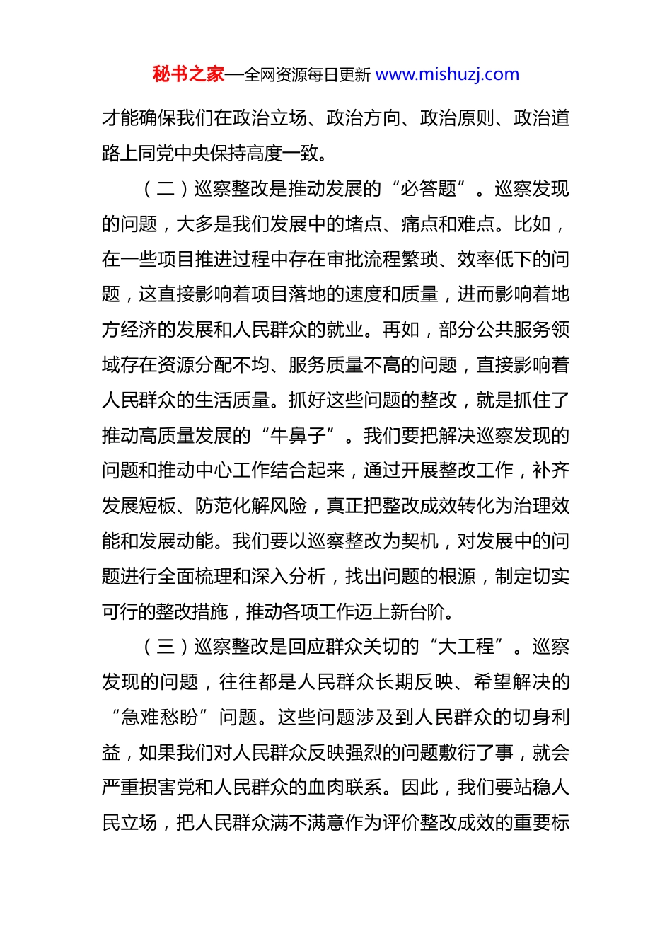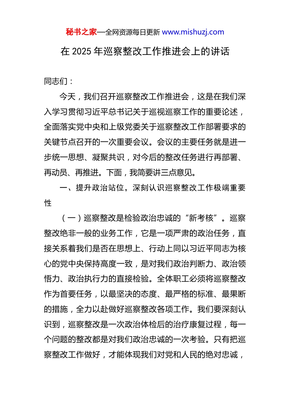 秘书之家—全网资源每日更新 www.mishuzj.com在 2025 年巡察整改工作推进会上的讲话 同志们:今天,我们召开巡察整改工作推进会,这是在我们深入学习贯彻习近平总书记关于巡视巡察工作的重要论述,全面落实党中央和上级党委关于巡察整改工作部署要求的关键节点召开的一次重要会议。会议的主要任务就是进一步统一思想、凝聚共识,对今后的整改任务进行再部署、再动员、再推进。下面,我简要讲三点意见。一、提升政治站位,深刻认识巡察整改工作极端重要性(一)巡察整改是检验政治忠诚的“新考核”。巡察整改绝非一般的业务工作,它是一项严肃的政治任务,直接关系着我们是否在思想上、行动上同以习近平同志为核心的党中央保持高度一致,是对我们政治判断力、政治领悟力、政治执行力的直接检验。全体职工必须将巡察整改作为首要任务,以最坚决的态度、最严格的标准、最果断的措施,全力以赴做好巡察整改各项工作。我们要深刻认识到,巡察整改是一次政治体检后的治疗康复过程,每一个问题的整改都是对我们政治忠诚的一次考验。只有把巡察整改工作做好,才能体现我们对党和人民的绝对忠诚,秘书之家—全网资源每日更新 www.mishuzj.com才能确保我们在政治立场、政治方向、政治原则、政治道路上同党中央保持高度一致。(二)巡察整改是推动发展的“必答题”。巡察发现的问题,大多是我们发展中的堵点、痛点和难点。比如,在一些项目推进过程中存在审批流程繁琐、效率低下的问题,这直接影响着项目落地的速度和质量,进而影响着地方经济的发展和人民群众的就业。再如,部分公共服务领域存在资源分配不均、服务质量不高的问题,直接影响着人民群众的生活质量。抓好这些问题的整改,就是抓住了推动高质量发展的“牛鼻子”。我们要把解决巡察发现的问题和推动中心工作结合起来,通过开展整改工作,补齐发展短板、防范化解风险,真正把整改成效转化为治理效能和发展动能。我们要以巡察整改为契机,对发展中的问题进行全面梳理和深入分析,找出问题的根源,制定切实可行的整改措施,推动各项工作迈上新台阶。(三)巡察整改是回应群众关切的“大工程”。巡察发现的问题,往往都是人民群众长期反映、希望解决的“急难愁盼”问题。这些问题涉及到人民群众的切身利益,如果我们对人民群众反映强烈的问题敷衍了事,就会严重损害党和人民群众的血肉联系。因此,我们要站稳人民立场,把人民群众满不满意作为评价整改成效的重要标秘书之家—全网资源每日更新 www.mishuzj.com准,切实解决好群众的操心事、烦心事、揪心事,增强人民群众的获得感。我们要深入群众,了解他们的需求和期望,把巡察整改工作做到群众的心坎上。对于群众反映的问题,要及时回应、认真解决,让群众看到我们整改的决心和成效,感受到党和政府的关怀和温暖。二、聚焦关键环节,以钉钉子的精神推动问题见底清零(一)全面推行“清单化管理”,确保责任落实无死角。各责任部门要进一步完善问题清单、任务清单、责任清单,明确牵头领导、主责部门、具体责任人、整改措施、完成时限、验收标准。这三张清单是我们推进巡察整改工作的路线图和施工图,必须做到清晰明确、责任到人。同时,要参考先进经验,探索制定巡察整改和成果运用责任清单,确保各项工作有力有序推进。我们要对每一个问题进行深入分析,找出问题的根源和解决办法,将整改任务分解到具体的部门和个人,明确每个人的职责和任务。要建立健全责任追究制度,对整改不力的部门和个人进行严肃问责,确保责任落实到位。(二)系统推行“闭环式管理”,确保整改成效可衡量。我们要引入科学的评估机制,对整改成效进行量化评估。首先,明确量化验收标准,建立一套科学的巡视整改秘书之家—全网资源每日更新 www.mishuzj.com评估考核办法,细化具体指标。这些指标要涵盖整改工作的各个方面,包括问题整改的完成情况、整改措施的执行情况、整改效果的评估等。其次,要加强跟踪问效,成立督导组,定期对各单位的整改进度进行核查,推动整改问题稳步进行。督导组要采取定期检查和不定期抽查相结合的方式,对整改工作进行全面监督和检查。要及时发现整改工作中存在的问题,...