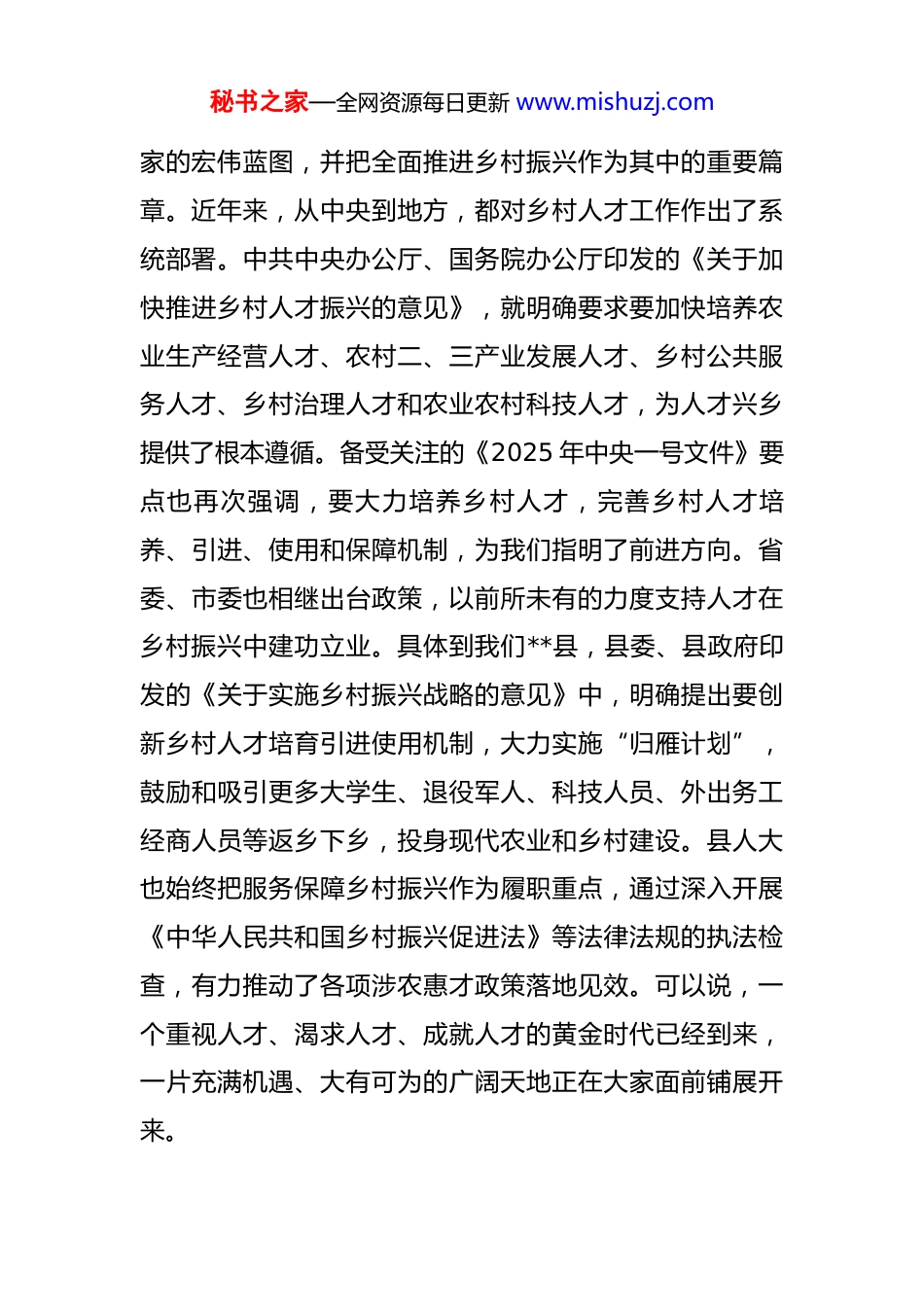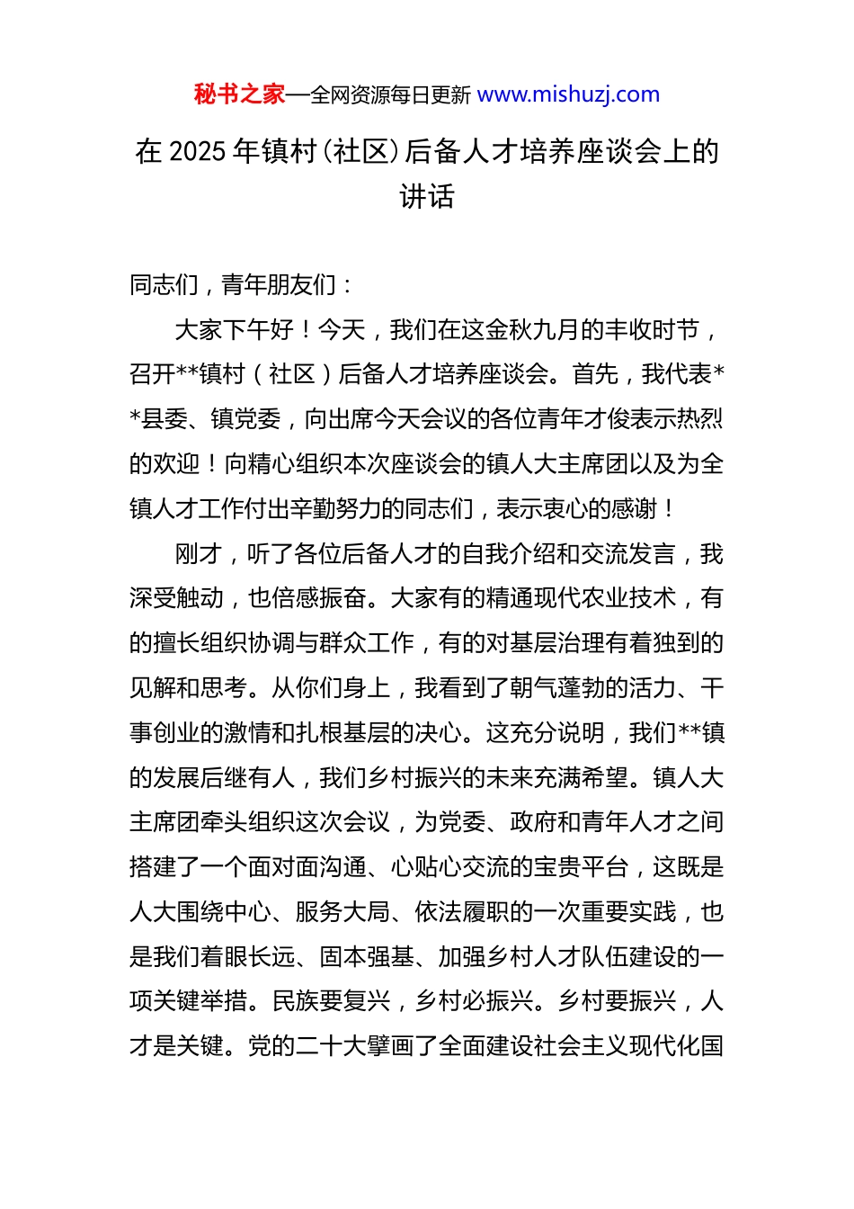 秘书之家—全网资源每日更新 www.mishuzj.com在 2025 年镇村(社区)后备人才培养座谈会上的讲话 同志们,青年朋友们:大家下午好!今天,我们在这金秋九月的丰收时节,召开**镇村(社区)后备人才培养座谈会。首先,我代表**县委、镇党委,向出席今天会议的各位青年才俊表示热烈的欢迎!向精心组织本次座谈会的镇人大主席团以及为全镇人才工作付出辛勤努力的同志们,表示衷心的感谢!刚才,听了各位后备人才的自我介绍和交流发言,我深受触动,也倍感振奋。大家有的精通现代农业技术,有的擅长组织协调与群众工作,有的对基层治理有着独到的见解和思考。从你们身上,我看到了朝气蓬勃的活力、干事创业的激情和扎根基层的决心。这充分说明,我们**镇的发展后继有人,我们乡村振兴的未来充满希望。镇人大主席团牵头组织这次会议,为党委、政府和青年人才之间搭建了一个面对面沟通、心贴心交流的宝贵平台,这既是人大围绕中心、服务大局、依法履职的一次重要实践,也是我们着眼长远、固本强基、加强乡村人才队伍建设的一项关键举措。民族要复兴,乡村必振兴。乡村要振兴,人才是关键。党的二十大擘画了全面建设社会主义现代化国秘书之家—全网资源每日更新 www.mishuzj.com家的宏伟蓝图,并把全面推进乡村振兴作为其中的重要篇章。近年来,从中央到地方,都对乡村人才工作作出了系统部署。中共中央办公厅、国务院办公厅印发的《关于加快推进乡村人才振兴的意见》,就明确要求要加快培养农业生产经营人才、农村二、三产业发展人才、乡村公共服务人才、乡村治理人才和农业农村科技人才,为人才兴乡提供了根本遵循。备受关注的《2025 年中央一号文件》要点也再次强调,要大力培养乡村人才,完善乡村人才培养、引进、使用和保障机制,为我们指明了前进方向。省委、市委也相继出台政策,以前所未有的力度支持人才在乡村振兴中建功立业。具体到我们**县,县委、县政府印发的《关于实施乡村振兴战略的意见》中,明确提出要创新乡村人才培育引进使用机制,大力实施“归雁计划”,鼓励和吸引更多大学生、退役军人、科技人员、外出务工经商人员等返乡下乡,投身现代农业和乡村建设。县人大也始终把服务保障乡村振兴作为履职重点,通过深入开展《中华人民共和国乡村振兴促进法》等法律法规的执法检查,有力推动了各项涉农惠才政策落地见效。可以说,一个重视人才、渴求人才、成就人才的黄金时代已经到来,一片充满机遇、大有可为的广阔天地正在大家面前铺展开来。秘书之家—全网资源每日更新 www.mishuzj.com作为村(社区)的后备力量,大家是推动这些宏伟蓝图和政策举措在基层落地生根的“金种子”和“生力军”。组织上把大家选拔出来,作为后备人才进行重点培养,这既是信任,更是沉甸甸的责任。刚才,**镇长结合自己的工作经历,对大家提出了“五个要”的殷切希望,讲得非常具体、非常深刻,我完全赞同。在此基础上,结合我们基层组织的架构职能和后备人才“为用而备、备而能用、备用结合”的使用原则,我再向大家提出四点希望和要求,与各位青年朋友共勉。第一,要常怀感恩之心,筑牢为民服务的思想根基。一个人只有懂得感恩,才能走得更远、飞得更高。大家能够从同龄人中脱颖而出,进入组织的培养视线,首先要感恩这个伟大的时代,是国家的发展和乡村振兴战略为大家提供了施展才华的舞台。其次要感恩组织的培养和信任,是党和人民为大家的成长进步创造了条件、搭建了平台。最后更要感恩家乡的父老乡亲,是这片水土养育了我们,是他们的期盼和支持,构成了我们干事创业最深厚的力量源泉。怀揣感恩之心,最终要落实到为民服务的具体行动上。我们要始终牢记“我是谁、为了谁、依靠谁”这个根本问题。村(社区)的工作,千头万绪,纷繁复杂,但归根结底就是为群众办实事、解难事、做好事。无论是化解秘书之家—全网资源每日更新 www.mishuzj.com邻里纠纷,还是推动产业发展;无论是落实惠民政策,还是改善人居环境,核心都是群众的利益。大家要像**镇长所说的那样,始终怀揣一颗“公心”,把群众的安危冷暖放在心上,把群众的急难愁盼抓在手上,把“人民至上”的理念刻在骨子里、融入血液...