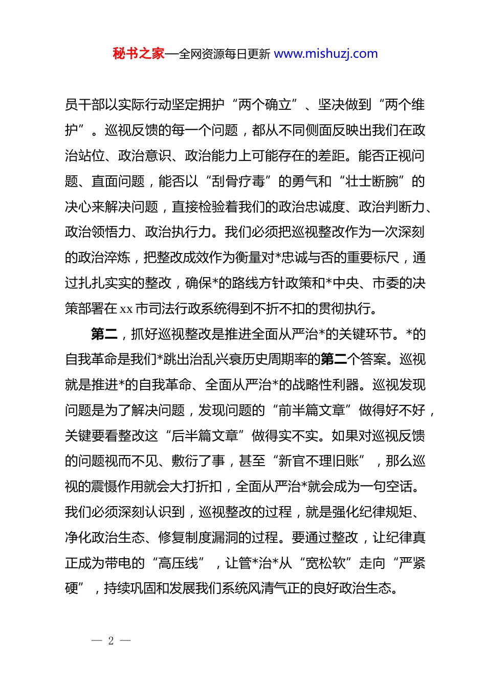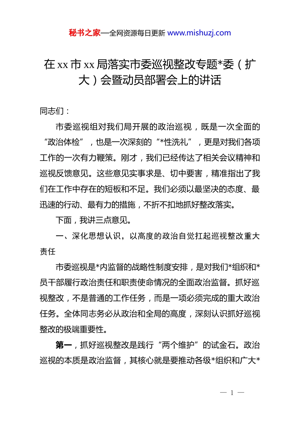 秘书之家—全网资源每日更新 www.mishuzj.com在 xx 市 xx 局落实市委巡视整改专题*委(扩大)会暨动员部署会上的讲话同志们:市委巡视组对我们局开展的政治巡视,既是一次全面的“政治体检”,也是一次深刻的“*性洗礼”,更是对我们各项工作的一次有力鞭策。刚才,我们已经传达了相关会议精神和巡视反馈意见。这些意见实事求是、切中要害,精准指出了我们在工作中存在的短板和不足。我们必须以最坚决的态度、最迅速的行动、最有力的措施,不折不扣地抓好整改落实。下面,我讲三点意见。一、深化思想认识,以高度的政治自觉扛起巡视整改重大责任市委巡视是*内监督的战略性制度安排,是对我们*组织和*员干部履行政治责任和职责使命情况的全面政治监督。抓好巡视整改,不是普通的工作任务,而是一项必须完成的重大政治任务。全体同志务必从政治和全局的高度,深刻认识抓好巡视整改的极端重要性。第一,抓好巡视整改是践行“两个维护”的试金石。政治巡视的本质是政治监督,其核心就是要推动各级*组织和广大*— 1 —秘书之家—全网资源每日更新 www.mishuzj.com员干部以实际行动坚定拥护“两个确立”、坚决做到“两个维护”。巡视反馈的每一个问题,都从不同侧面反映出我们在政治站位、政治意识、政治能力上可能存在的差距。能否正视问题、直面问题,能否以“刮骨疗毒”的勇气和“壮士断腕”的决心来解决问题,直接检验着我们的政治忠诚度、政治判断力、政治领悟力、政治执行力。我们必须把巡视整改作为一次深刻的政治淬炼,把整改成效作为衡量对*忠诚与否的重要标尺,通过扎扎实实的整改,确保*的路线方针政策和*中央、市委的决策部署在 xx 市司法行政系统得到不折不扣的贯彻执行。第二,抓好巡视整改是推进全面从严治*的关键环节。*的自我革命是我们*跳出治乱兴衰历史周期率的第二个答案。巡视就是推进*的自我革命、全面从严治*的战略性利器。巡视发现问题是为了解决问题,发现问题的“前半篇文章”做得好不好,关键要看整改这“后半篇文章”做得实不实。如果对巡视反馈的问题视而不见、敷衍了事,甚至“新官不理旧账”,那么巡视的震慑作用就会大打折扣,全面从严治*就会成为一句空话。我们必须深刻认识到,巡视整改的过程,就是强化纪律规矩、净化政治生态、修复制度漏洞的过程。要通过整改,让纪律真正成为带电的“高压线”,让管*治*从“宽松软”走向“严紧硬”,持续巩固和发展我们系统风清气正的良好政治生态。— 2 —秘书之家—全网资源每日更新 www.mishuzj.com第三,抓好巡视整改是推动司法行政工作高质量发展的强大动力。当前,我市正处在奋力推进现代化新 xx 建设的关键时期,对法治建设提出了新的更高要求。巡视反馈的问题,表面上看是具体业务或管理上的瑕疵,但根源上都与我们的工作理念、工作作风、发展方式密切相关,是制约司法行政事业高质量发展的堵点和痛点。我们不能就问题改问题,必须把巡视整改与贯彻落实***法治思想结合起来,与服务保障全市中心工作结合起来,与深化司法行政领域改革结合起来。要善于从政治巡视反馈的问题中,找准改革攻坚的突破口和制度创新的着力点,通过整改一个问题,带动解决一类问题,完善一批制度,从而将整改成果转化为提升依法治市水平、优化法治化营商环境、增强人民群众法治获得感的实际成效,为现代化新 xx 建设提供更加坚实的法治保障。二、聚焦核心问题,以刀刃向内的勇气抓好巡视反馈精准整改市委巡视组反馈的意见,聚焦六个方面,为我们精准“画像”,问题点得准、点得深、点得实。我们必须坚持问题导向,拿出“不贰过”的决心,聚焦反馈意见,逐条逐项对照检查,动真碰硬、精准发力,确保问题整改清仓见底、见到实效。(一)在贯彻落实上级决策部署上要见行见效。巡视反馈— 3 —秘书之家—全网资源每日更新 www.mishuzj.com指出我们在学懂弄通做实***法治思想、服务保障全市重大战略等方面还存在差距。对此,必须在“结合”与“转化”上狠下功夫。理论学习不能停留在读文件、记笔记的层面,要真正内化于心、外化于行。要紧密围绕市委市政府关于西部陆海新通道、成渝地区双城经济圈、数字 xx 等重...