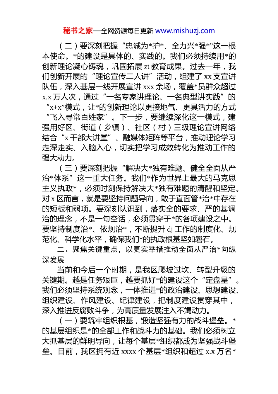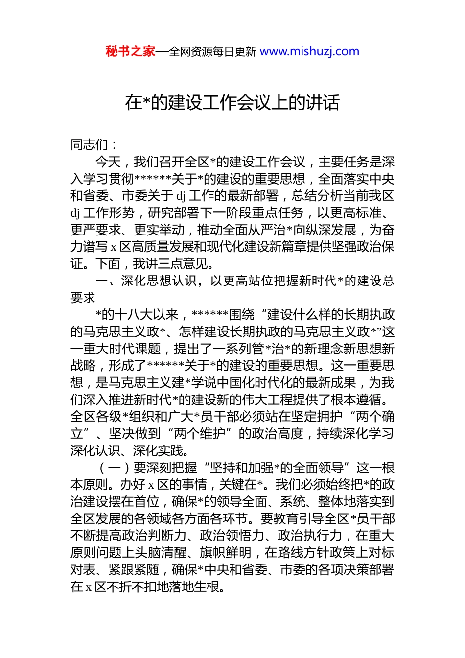 秘书之家—全网资源每日更新 www.mishuzj.com在*的建设工作会议上的讲话同志们:今天,我们召开全区*的建设工作会议,主要任务是深入学习贯彻******关于*的建设的重要思想,全面落实中央和省委、市委关于 dj 工作的最新部署,总结分析当前我区dj 工作形势,研究部署下一阶段重点任务,以更高标准、更严要求、更实举动,推动全面从严治*向纵深发展,为奋力谱写 x 区高质量发展和现代化建设新篇章提供坚强政治保证。下面,我讲三点意见。一、深化思想认识,以更高站位把握新时代*的建设总要求*的十八大以来,******围绕“建设什么样的长期执政的马克思主义政*、怎样建设长期执政的马克思主义政*”这一重大时代课题,提出了一系列管*治*的新理念新思想新战略,形成了******关于*的建设的重要思想。这一重要思想,是马克思主义建*学说中国化时代化的最新成果,为我们深入推进新时代*的建设新的伟大工程提供了根本遵循。全区各级*组织和广大*员干部必须站在坚定拥护“两个确立”、坚决做到“两个维护”的政治高度,持续深化学习深化认识、深化实践。(一)要深刻把握“坚持和加强*的全面领导”这一根本原则。办好 x 区的事情,关键在*。我们必须始终把*的政治建设摆在首位,确保*的领导全面、系统、整体地落实到全区发展的各领域各方面各环节。要教育引导全区*员干部不断提高政治判断力、政治领悟力、政治执行力,在重大原则问题上头脑清醒、旗帜鲜明,在路线方针政策上对标对表、紧跟紧随,确保*中央和省委、市委的各项决策部署在 x 区不折不扣地落地生根。秘书之家—全网资源每日更新 www.mishuzj.com(二)要深刻把握“忠诚为*护*、全力兴*强*”这一根本使命。*的建设是具体的、实践的。我们必须持续用*的创新理论凝心铸魂,巩固拓展 zt 教育成果。过去一年,我们创新开展的“理论宣传二人讲”活动,组建了 xx 支宣讲队伍,深入基层一线开展宣讲 xxx 余场,覆盖*员群众超过x.x 万人次,通过“一名专家讲理论、一名典型讲实践”的“x+x”模式,让*的创新理论以更接地气、更具活力的方式“飞入寻常百姓家”。下一步,要继续深化这一模式,建强用好区、街道(乡镇)、社区(村)三级理论宣讲网络结合“x 干部大讲堂”、融媒体矩阵等平台,推动理论学习走深走实、入脑入心,切实把学习成效转化为推动工作的强大动力。(三)要深刻把握“解决大*独有难题、健全全面从严治*体系”这一重大任务。我们*作为世界上最大的马克思主义执政*,必须时刻保持解决大*独有难题的清醒和坚定。对 x 区而言,就是要坚持问题导向,敢于直面管*治*中存在的短板和弱项。要深刻认识到,落实全的要求、严的基调治的理念,不是一句空话,必须贯穿于*的各项建设之中。要坚持制度治*、依规治*,不断提升 dj 工作的制度化、规范化、科学化水平,确保我们*的执政根基坚如磐石。二、聚焦关键重点,以更实举措推动全面从严治*向纵深发展当前和今后一个时期,是我区爬坡过坎、转型升级的关键期。越是任务艰巨,越要抓好*的建设这个“定盘星”。我们必须坚持系统观念,一体推进*的政治建设、思想建设、组织建设、作风建设、纪律建设,把制度建设贯穿其中,深入推进反腐败斗争,为高质量发展注入不竭动力。(一)要筑牢组织根基,锻造坚强有力的战斗堡垒。*的基层组织是*的全部工作和战斗力的基础。我们必须树立大抓基层的鲜明导向,让每个基层*组织都成为坚强战斗堡垒。目前,我区拥有近 xxxx 个基层*组织和超过 x.x 万名*秘书之家—全网资源每日更新 www.mishuzj.com员,这是一支宏大而重要的力量。要持续用力、久久为功一要持续优化组织设置。要巩固传统领域 dj,更要拓展新兴领域 dj,积极探索在产业链、项目组、商业楼宇、互联网企业等建立*组织的方式方法,消除“空白点”,实现*的组织和工作全覆盖。要深化区域化 dj,打破行政壁垒和行业界限,推广“治理发展型”“领域关联型”dj 联盟模式,推动组织共建、资源共享、事务共商、发展共促。二要持续建强骨干队伍。干部是决定性因素。要抓好基层*组织书记这个“领头雁”,去年我们举办了 xx 期各类培训班,累计培训*员干部超过 ...