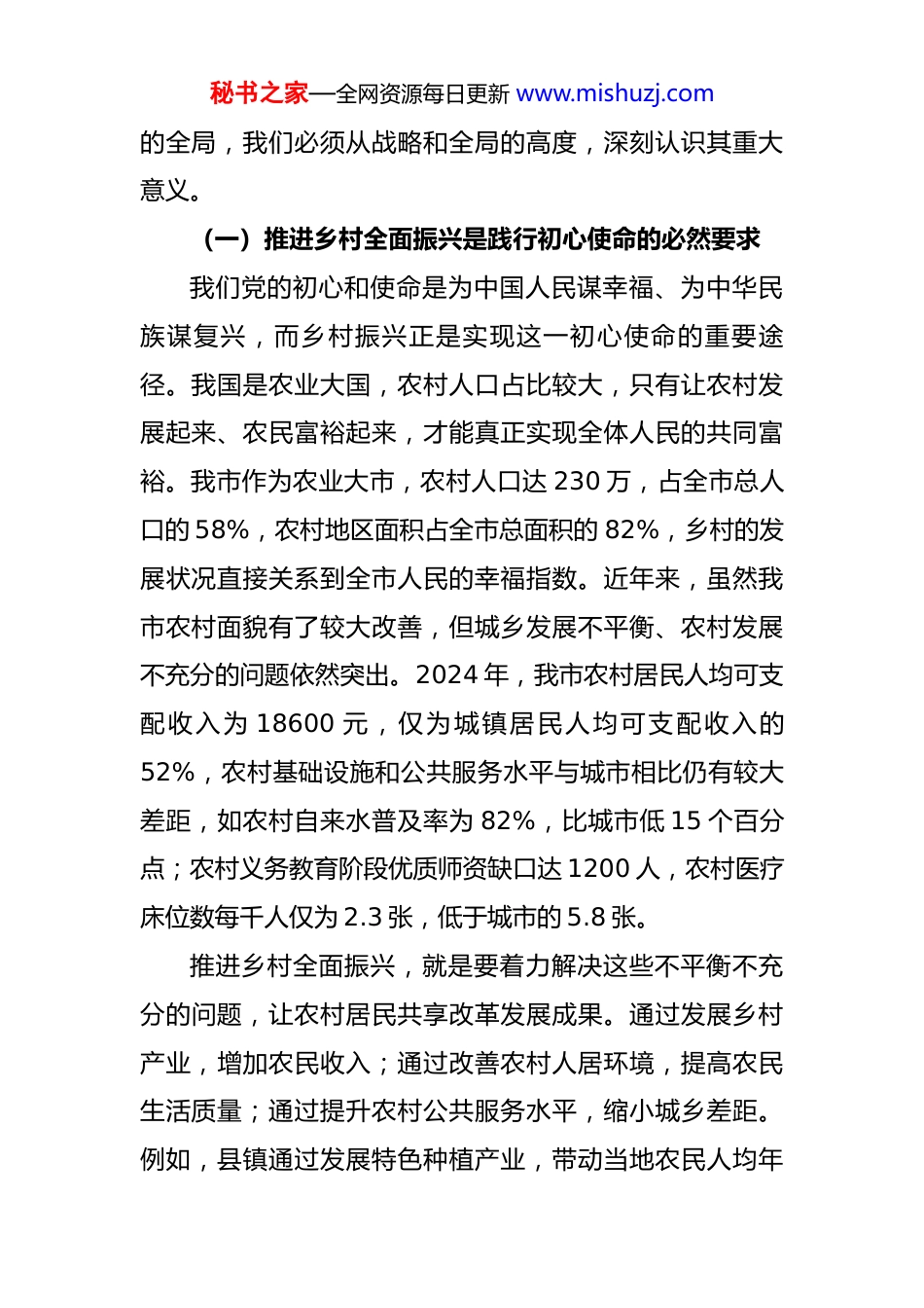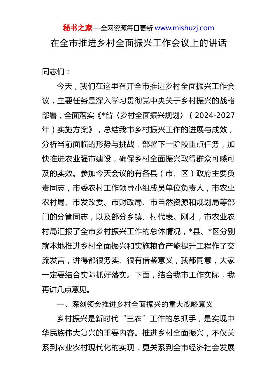 秘书之家—全网资源每日更新 www.mishuzj.com在全市推进乡村全面振兴工作会议上的讲话 同志们:今天,我们在这里召开全市推进乡村全面振兴工作会议,主要任务是深入学习贯彻党中央关于乡村振兴的战略部署,全面落实《*省〈乡村全面振兴规划〉(2024-2027年)实施方案》,总结我市乡村振兴工作的进展与成效,分析当前面临的形势与挑战,部署下一阶段重点任务,加快推进农业强市建设,确保乡村全面振兴取得群众可感可及的实效。参加今天会议的有各县(市、区)政府主要负责同志,市委农村工作领导小组成员单位负责人,市农业农村局、市发改委、市财政局、市自然资源和规划局等部门的分管同志,以及部分乡镇、村代表。刚才,市农业农村局汇报了全市乡村振兴工作的总体情况,*县、*区分别就本地推进乡村全面振兴和实施粮食产能提升工程作了交流发言,讲得都很务实、很有借鉴意义,我都同意,大家一定要结合实际抓好落实。下面,结合我市工作实际,我再讲几点意见。一、深刻领会推进乡村全面振兴的重大战略意义乡村振兴是新时代“三农”工作的总抓手,是实现中华民族伟大复兴的重要内容。推进乡村全面振兴,不仅关系到农业农村现代化的实现,更关系到全市经济社会发展秘书之家—全网资源每日更新 www.mishuzj.com的全局,我们必须从战略和全局的高度,深刻认识其重大意义。(一)推进乡村全面振兴是践行初心使命的必然要求我们党的初心和使命是为中国人民谋幸福、为中华民族谋复兴,而乡村振兴正是实现这一初心使命的重要途径。我国是农业大国,农村人口占比较大,只有让农村发展起来、农民富裕起来,才能真正实现全体人民的共同富裕。我市作为农业大市,农村人口达 230 万,占全市总人口的 58%,农村地区面积占全市总面积的 82%,乡村的发展状况直接关系到全市人民的幸福指数。近年来,虽然我市农村面貌有了较大改善,但城乡发展不平衡、农村发展不充分的问题依然突出。2024 年,我市农村居民人均可支配收入为 18600 元,仅为城镇居民人均可支配收入的52%,农村基础设施和公共服务水平与城市相比仍有较大差距,如农村自来水普及率为 82%,比城市低 15 个百分点;农村义务教育阶段优质师资缺口达 1200 人,农村医疗床位数每千人仅为 2.3 张,低于城市的 5.8 张。推进乡村全面振兴,就是要着力解决这些不平衡不充分的问题,让农村居民共享改革发展成果。通过发展乡村产业,增加农民收入;通过改善农村人居环境,提高农民生活质量;通过提升农村公共服务水平,缩小城乡差距。例如,县镇通过发展特色种植产业,带动当地农民人均年秘书之家—全网资源每日更新 www.mishuzj.com收入增加 3500 元,村民的住房条件、出行环境都得到了显著改善,幸福感和获得感明显增强。这充分说明,推进乡村全面振兴,是践行我们党初心使命的具体体现,是让广大农民过上美好生活的必然选择。(二)推进乡村全面振兴是构建新发展格局的重要支撑构建以国内大循环为主体、国内国际双循环相互促进的新发展格局,是当前我国经济发展的战略导向。乡村作为国内大循环的重要组成部分,有着巨大的发展潜力和广阔的市场空间,推进乡村全面振兴能够为构建新发展格局提供有力支撑。从需求端看,农村是一个巨大的消费市场,随着农民收入的增加和消费观念的转变,农村消费潜力将不断释放。2024 年,我市农村社会消费品零售总额达380 亿元,同比增长 12%,增速高于城市 2.5 个百分点,但人均消费支出仍仅为城市居民的 48%,提升空间巨大。通过完善农村基础设施、健全农村社会保障体系,能够进一步增强农民的消费能力和意愿,拉动内需增长。从供给端看,乡村是保障粮食和重要农产品供给的重要基地,是提供生态产品、文化产品的重要来源。我市是全省重要的粮食生产基地,粮食年产量稳定在 320 万吨以上,占全省粮食总产量的 8%;同时,我市特色农产品丰富,如*县的优质水果、*区的绿色蔬菜等,年产量达 150秘书之家—全网资源每日更新 www.mishuzj.com万吨,不仅满足了本地市场需求,还远销全国各地。推进乡村全面振兴,能够进一步提高农业综合生产能力,保障粮食和重要农产品安全供给;能够发...