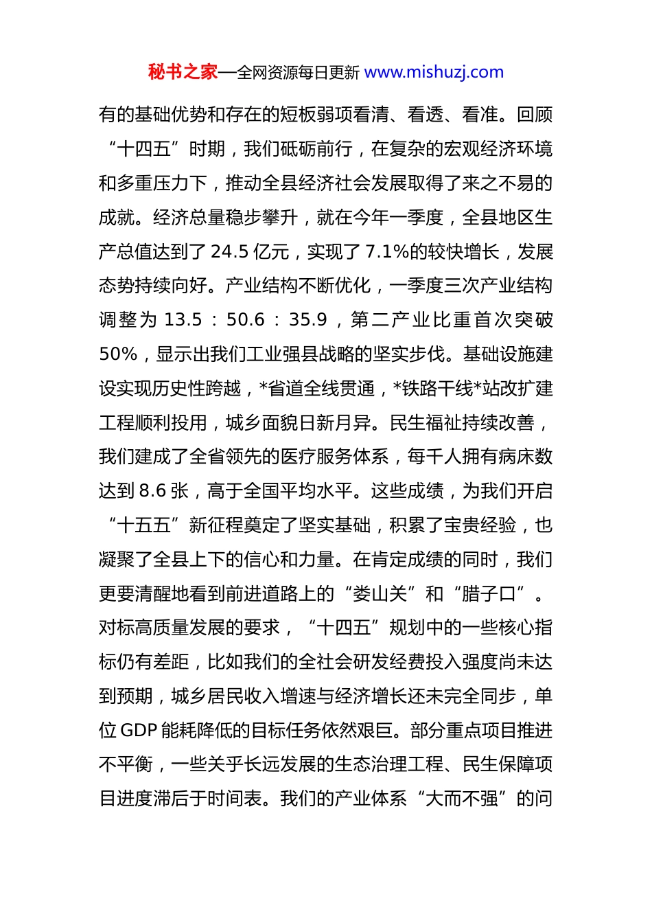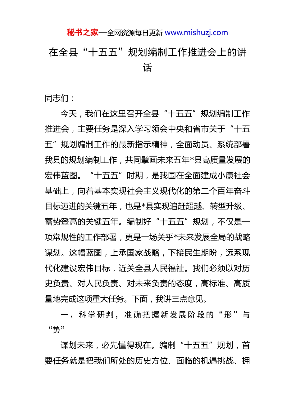 秘书之家—全网资源每日更新 www.mishuzj.com在全县“十五五”规划编制工作推进会上的讲话 同志们:今天,我们在这里召开全县“十五五”规划编制工作推进会,主要任务是深入学习领会中央和省市关于“十五五”规划编制工作的最新指示精神,全面动员、系统部署我县的规划编制工作,共同擘画未来五年*县高质量发展的宏伟蓝图。“十五五”时期,是我国在全面建成小康社会基础上,向着基本实现社会主义现代化的第二个百年奋斗目标迈进的关键五年,也是*县实现追赶超越、转型升级、蓄势登高的关键五年。编制好“十五五”规划,不仅是一项常规性的工作部署,更是一场关乎*未来发展全局的战略谋划。这幅蓝图,上承国家战略,下接民生期盼,远系现代化建设宏伟目标,近关全县人民福祉。我们必须以对历史负责、对人民负责、对未来负责的态度,高标准、高质量地完成这项重大任务。下面,我讲三点意见。一、科学研判,准确把握新发展阶段的“形”与“势”谋划未来,必先懂得现在。编制“十五五”规划,首要任务就是把我们所处的历史方位、面临的机遇挑战、拥秘书之家—全网资源每日更新 www.mishuzj.com有的基础优势和存在的短板弱项看清、看透、看准。回顾“十四五”时期,我们砥砺前行,在复杂的宏观经济环境和多重压力下,推动全县经济社会发展取得了来之不易的成就。经济总量稳步攀升,就在今年一季度,全县地区生产总值达到了 24.5 亿元,实现了 7.1%的较快增长,发展态势持续向好。产业结构不断优化,一季度三次产业结构调 整 为 13.5 : 50.6 : 35.9 , 第 二 产 业 比 重 首 次 突 破50%,显示出我们工业强县战略的坚实步伐。基础设施建设实现历史性跨越,*省道全线贯通,*铁路干线*站改扩建工程顺利投用,城乡面貌日新月异。民生福祉持续改善,我们建成了全省领先的医疗服务体系,每千人拥有病床数达到 8.6 张,高于全国平均水平。这些成绩,为我们开启“十五五”新征程奠定了坚实基础,积累了宝贵经验,也凝聚了全县上下的信心和力量。在肯定成绩的同时,我们更要清醒地看到前进道路上的“娄山关”和“腊子口”。对标高质量发展的要求,“十四五”规划中的一些核心指标仍有差距,比如我们的全社会研发经费投入强度尚未达到预期,城乡居民收入增速与经济增长还未完全同步,单位 GDP 能耗降低的目标任务依然艰巨。部分重点项目推进不平衡,一些关乎长远发展的生态治理工程、民生保障项目进度滞后于时间表。我们的产业体系“大而不强”的问秘书之家—全网资源每日更新 www.mishuzj.com题依然突出,龙头企业在核心技术突破上仍面临瓶颈。我县一家龙头矿业企业,在推进投资数亿元的数字化矿山改造项目中,就因关键技术标准和设备成熟度问题,不得不对原方案进行重大调整,将部分智能化建设资金转向更能产生即期效益的选矿工程。这个案例深刻地警示我们,谋划发展必须立足实际,既要志存高远,更要脚踏实地,任何脱离现实的冒进都可能付出沉重代价。展望“十五五”,我们面临的内外环境更趋复杂。从外部看,全球产业链重构、科技革命加速演进、区域竞争日趋激烈,为我们带来了前所未有的机遇和挑战。从内部看,国家构建新发展格局、推进西部大开发形成新格局、实施乡村振兴战略等,为我们释放了巨大的政策红利。特别是*铁路的加速建设,将彻底重塑*的交通地理格局,使我们从过去的交通末梢,一跃成为连接南北、贯通东西的区域性交通枢纽。机遇千载难逢,挑战也前所未有。我们能否抓住“窗口期”,乘势而上;能否应对“承压期”,化危为机,关键就在于我们能否科学编制和有效实施好“十五五”规划。二、精准施策,系统谋划高质量发展的“纲”与“目”编制一份高质量的规划,必须坚持系统观念,处理好秘书之家—全网资源每日更新 www.mishuzj.com一系列重大关系,确保规划的战略性、前瞻性、科学性和可操作性。具体来说,要牢牢把握好“五个统一”。第一,要贯穿高位对标与立足县情的统一。我们的规划,既要“顶天”,也要“立地”。“顶天”,就是要主动将*的发展置于全国、全省、全市的大棋局中去考量,确保我们的发展方向与国家战略同频共振。要把黄河流域...