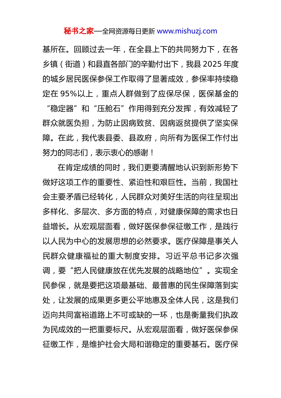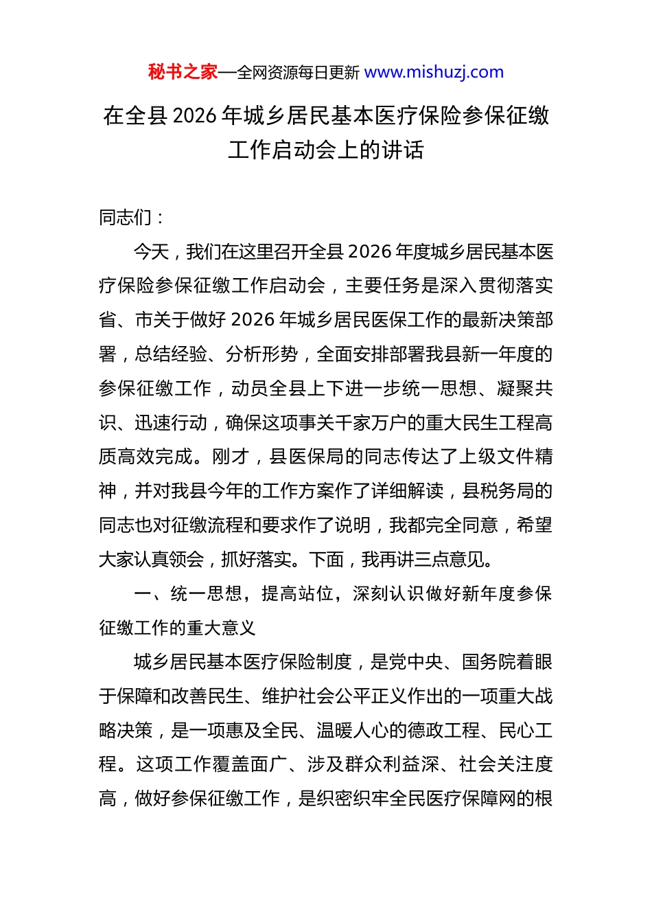秘书之家—全网资源每日更新 www.mishuzj.com在全县 2026 年城乡居民基本医疗保险参保征缴工作启动会上的讲话 同志们:今天,我们在这里召开全县 2026 年度城乡居民基本医疗保险参保征缴工作启动会,主要任务是深入贯彻落实省、市关于做好 2026 年城乡居民医保工作的最新决策部署,总结经验、分析形势,全面安排部署我县新一年度的参保征缴工作,动员全县上下进一步统一思想、凝聚共识、迅速行动,确保这项事关千家万户的重大民生工程高质高效完成。刚才,县医保局的同志传达了上级文件精神,并对我县今年的工作方案作了详细解读,县税务局的同志也对征缴流程和要求作了说明,我都完全同意,希望大家认真领会,抓好落实。下面,我再讲三点意见。一、统一思想,提高站位,深刻认识做好新年度参保征缴工作的重大意义城乡居民基本医疗保险制度,是党中央、国务院着眼于保障和改善民生、维护社会公平正义作出的一项重大战略决策,是一项惠及全民、温暖人心的德政工程、民心工程。这项工作覆盖面广、涉及群众利益深、社会关注度高,做好参保征缴工作,是织密织牢全民医疗保障网的根秘书之家—全网资源每日更新 www.mishuzj.com基所在。回顾过去一年,在全县上下的共同努力下,在各乡镇(街道)和县直各部门的辛勤付出下,我县 2025 年度的城乡居民医保参保工作取得了显著成效,参保率持续稳定在 95%以上,重点人群做到了应保尽保,医保基金的“稳定器”和“压舱石”作用得到充分发挥,有效减轻了群众就医负担,为防止因病致贫、因病返贫提供了坚实保障。在此,我代表县委、县政府,向所有为医保工作付出努力的同志们,表示衷心的感谢!在肯定成绩的同时,我们更要清醒地认识到新形势下做好这项工作的重要性、紧迫性和艰巨性。当前,我国社会主要矛盾已经转化,人民群众对美好生活的向往呈现出多样化、多层次、多方面的特点,对健康保障的需求也日益增长。从宏观层面看,做好医保参保征缴工作,是践行以人民为中心的发展思想的必然要求。医疗保障是事关人民群众健康福祉的重大制度安排。习近平总书记多次强调,要“把人民健康放在优先发展的战略地位”。实现全民参保,就是要把这项最基础、最普惠的民生保障落到实处,让发展的成果更多更公平地惠及全体人民,这是我们迈向共同富裕道路上不可或缺的一环,也是衡量我们执政为民成效的一把重要标尺。从宏观层面看,做好医保参保征缴工作,是维护社会大局和谐稳定的重要基石。医疗保秘书之家—全网资源每日更新 www.mishuzj.com险作为社会保障体系的重要组成部分,是社会风险的“减震器”。一个家庭,一旦有成员遭遇重大疾病,如果没有医保这张“安全网”,很可能瞬间陷入困境,甚至引发一系列社会问题。我们必须认识到,参保缴费不仅是个人的事,更是全社会共建共享、共担风险的社会责任。一个稳定、可持续的全民医保体系,能够有效化解社会矛盾,增强群众的安全感和幸福感,为我县的经济社会发展营造一个和谐稳定的良好环境。从微观层面看,做好医保参保征缴工作,是保障每一个家庭抵御风险的现实需要。近年来,随着医疗技术的进步,一些新的诊疗项目和药品纳入医保报销范围,群众的受益程度越来越高。2026 年度,个人缴费标准虽然调整为 400 元,但人均财政补助标准不低于 700 元,这意味着每位参保群众背后,都有超过千元的资金池作为保障。这笔账,我们不仅要自己算清楚,更要帮群众算清楚。400 元,可能只是一两件衣服的价钱,或是一两次在外聚餐的费用,但投入到医保中,换来的是一整年的健康保障,是面对疾病时的底气和尊严。这项工作做得越扎实,覆盖面越广,群众的受益就越大,因病致贫的风险就越小。因此,全县各级各部门必须从政治和全局的高度,深刻认识做好 2026 年度城乡居民医保参保征缴工作的极端重要性,切实增强责任感、使命感和紧迫感,把秘书之家—全网资源每日更新 www.mishuzj.com这项工作作为当前一项重大政治任务和民生实事,摆在突出位置,用心用情用力抓紧抓实抓好。二、聚焦重点,精准发力,高标准完成参保征缴各项目标任务今年的参保征缴工作,总体要求是“目标再提高、措施再精准、服务...