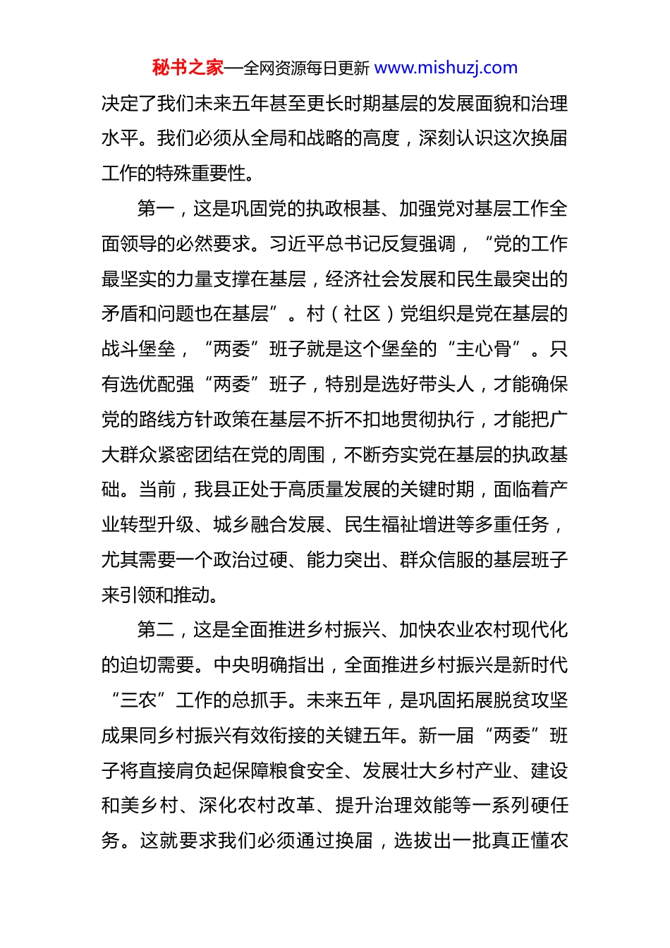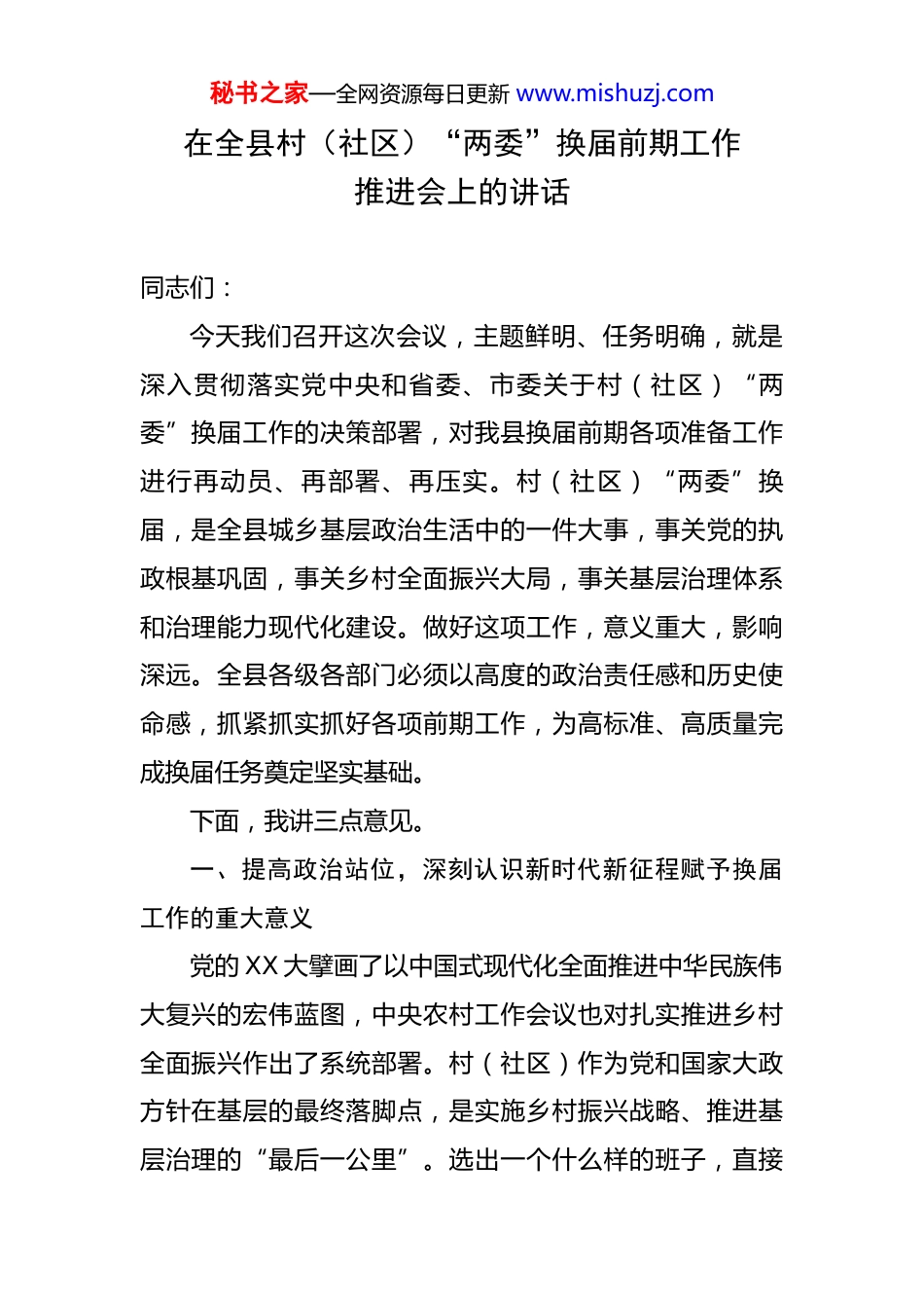 秘书之家—全网资源每日更新 www.mishuzj.com在全县村(社区)“两委”换届前期工作推进会上的讲话 同志们:今天我们召开这次会议,主题鲜明、任务明确,就是深入贯彻落实党中央和省委、市委关于村(社区)“两委”换届工作的决策部署,对我县换届前期各项准备工作进行再动员、再部署、再压实。村(社区)“两委”换届,是全县城乡基层政治生活中的一件大事,事关党的执政根基巩固,事关乡村全面振兴大局,事关基层治理体系和治理能力现代化建设。做好这项工作,意义重大,影响深远。全县各级各部门必须以高度的政治责任感和历史使命感,抓紧抓实抓好各项前期工作,为高标准、高质量完成换届任务奠定坚实基础。下面,我讲三点意见。一、提高政治站位,深刻认识新时代新征程赋予换届工作的重大意义党的 XX 大擘画了以中国式现代化全面推进中华民族伟大复兴的宏伟蓝图,中央农村工作会议也对扎实推进乡村全面振兴作出了系统部署。村(社区)作为党和国家大政方针在基层的最终落脚点,是实施乡村振兴战略、推进基层治理的“最后一公里”。选出一个什么样的班子,直接秘书之家—全网资源每日更新 www.mishuzj.com决定了我们未来五年甚至更长时期基层的发展面貌和治理水平。我们必须从全局和战略的高度,深刻认识这次换届工作的特殊重要性。第一,这是巩固党的执政根基、加强党对基层工作全面领导的必然要求。习近平总书记反复强调,“党的工作最坚实的力量支撑在基层,经济社会发展和民生最突出的矛盾和问题也在基层”。村(社区)党组织是党在基层的战斗堡垒,“两委”班子就是这个堡垒的“主心骨”。只有选优配强“两委”班子,特别是选好带头人,才能确保党的路线方针政策在基层不折不扣地贯彻执行,才能把广大群众紧密团结在党的周围,不断夯实党在基层的执政基础。当前,我县正处于高质量发展的关键时期,面临着产业转型升级、城乡融合发展、民生福祉增进等多重任务,尤其需要一个政治过硬、能力突出、群众信服的基层班子来引领和推动。第二,这是全面推进乡村振兴、加快农业农村现代化的迫切需要。中央明确指出,全面推进乡村振兴是新时代“三农”工作的总抓手。未来五年,是巩固拓展脱贫攻坚成果同乡村振兴有效衔接的关键五年。新一届“两委”班子将直接肩负起保障粮食安全、发展壮大乡村产业、建设和美乡村、深化农村改革、提升治理效能等一系列硬任务。这就要求我们必须通过换届,选拔出一批真正懂农秘书之家—全网资源每日更新 www.mishuzj.com业、爱农村、爱农民,善于发展经济、精于乡村治理、勇于改革创新的“领头雁”队伍。回顾过去,我县的基层工作取得了显著成效,但我们也要清醒地看到存在的短板和不足。根据我们前期的摸排调研,目前,我县村(社区)“两委”班子平均年龄为 44.2 岁,50 岁以上的同志占比仍然偏高(基于合理推断);大专及以上学历的成员占比仅为 28.5%(基于合理推断),与新时代新农村对干部队伍知识化、专业化的要求相比还有差距。班子结构老化、学历层次偏低、能力素质与发展要求不相适应等问题,在一定程度上制约了基层工作的开展。这次换届,正是我们优化队伍结构、提升整体功能的绝佳契机。第三,这是推进基层治理现代化、构建共建共治共享社会治理格局的实践路径。基层是社会治理的基础和重心。随着经济社会深刻变革,基层社会结构、利益格局和思想观念日趋复杂多元,对基层治理提出了新的更高要求。从化解邻里纠纷、调处社会矛盾,到组织公共服务、应对突发事件,再到弘扬文明新风、引领数字治理,都需要“两委”班子具备更强的群众工作能力、依法办事能力和风险化解能力。一个坚强有力的“两委”班子,能够有效整合各方资源,发动群众参与,形成治理合力,将矛盾化解在基层、问题解决在萌芽。反之,如果班子软弱涣散,就可能导致小事拖大、大事拖炸,影响社会和谐稳秘书之家—全网资源每日更新 www.mishuzj.com定。因此,抓好换届工作,就是抓住了基层治理的“牛鼻子”,是夯实平安 XX、法治 XX 建设根基的关键一环。二、聚焦关键环节,精准把握高标准推进换届工作的核心任务做好换届前期工作,千头万绪,但核心是“人”。...