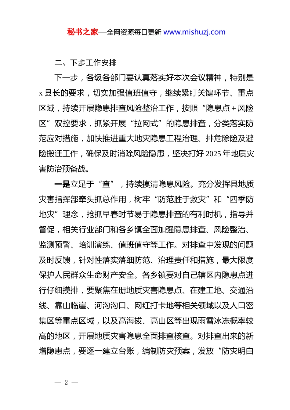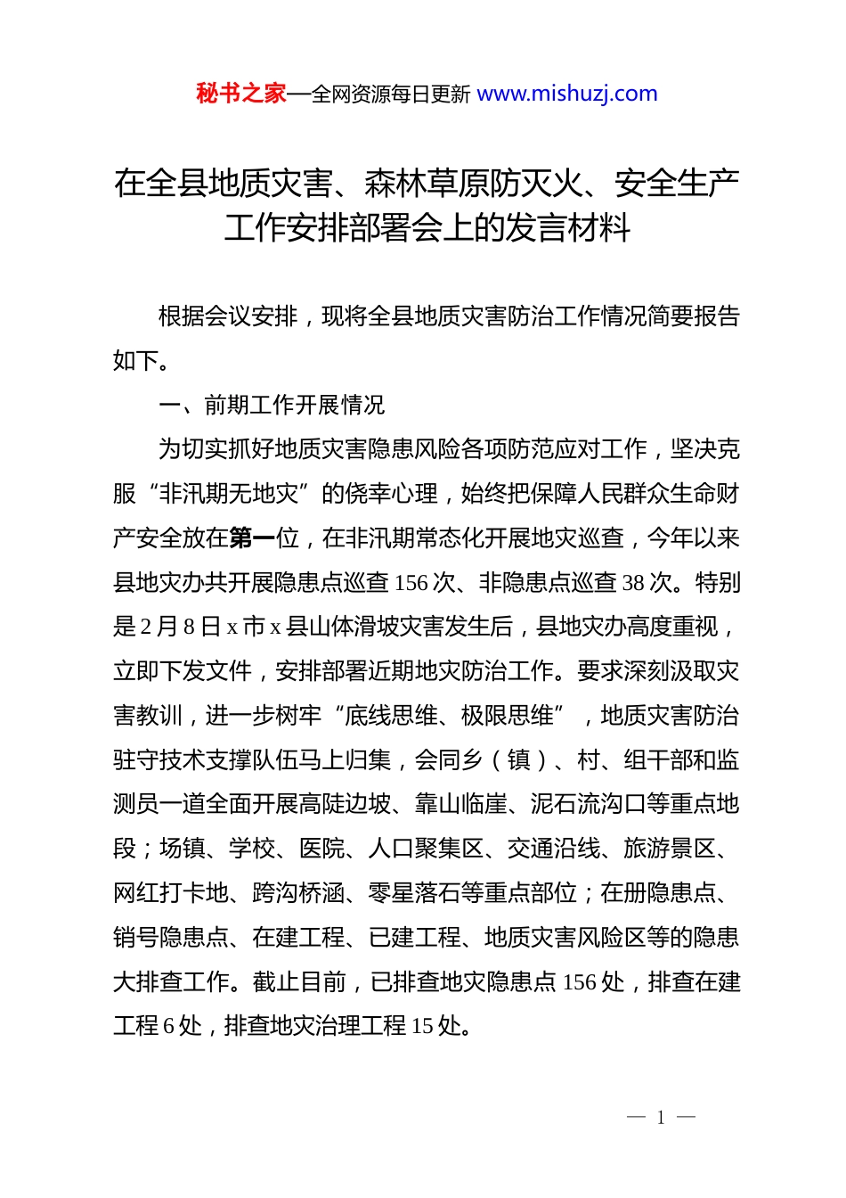 秘书之家—全网资源每日更新 www.mishuzj.com在全县地质灾害、森林草原防灭火、安全生产工作安排部署会上的发言材料根据会议安排,现将全县地质灾害防治工作情况简要报告如下。一、前期工作开展情况为切实抓好地质灾害隐患风险各项防范应对工作,坚决克服“非汛期无地灾”的侥幸心理,始终把保障人民群众生命财产安全放在第一位,在非汛期常态化开展地灾巡查,今年以来县地灾办共开展隐患点巡查 156 次、非隐患点巡查 38 次。特别是 2 月 8 日 x 市 x 县山体滑坡灾害发生后,县地灾办高度重视,立即下发文件,安排部署近期地灾防治工作。要求深刻汲取灾害教训,进一步树牢“底线思维、极限思维”,地质灾害防治驻守技术支撑队伍马上归集,会同乡(镇)、村、组干部和监测员一道全面开展高陡边坡、靠山临崖、泥石流沟口等重点地段;场镇、学校、医院、人口聚集区、交通沿线、旅游景区、网红打卡地、跨沟桥涵、零星落石等重点部位;在册隐患点、销号隐患点、在建工程、已建工程、地质灾害风险区等的隐患大排查工作。截止目前,已排查地灾隐患点 156 处,排查在建工程 6 处,排查地灾治理工程 15 处。— 1 —秘书之家—全网资源每日更新 www.mishuzj.com二、下步工作安排下一步,各级各部门要认真落实好本次会议精神,特别是x 县长的要求,切实加强值班值守,继续紧盯关键环节、重点区域,持续开展隐患排查风险整治工作,按照“隐患点+风险区”双控要求,抓紧开展“拉网式”的隐患排查,分类落实防范应对措施,加快推进重大地灾隐患工程治理、排危除险及避险搬迁工作,确保及时消除风险隐患,坚决打好 2025 年地质灾害防治预备战。一是立足于“查”,持续摸清隐患风险。充分发挥县地质灾害指挥部牵头抓总作用,树牢“防范胜于救灾”和“四季防地灾”理念,抢抓早春时节易于隐患排查的有利时机,指导并督促,相关行业部门和各乡镇全面加强隐患排查、风险整治、监测预警、培训演练、值班值守等工作。对排查中发现的问题及时反馈,针对性落实落细防范、治理责任和措施,最大限度保护人民群众生命财产安全。各乡镇要对自己辖区内隐患点进行仔细摸排,要聚焦在册地质灾害隐患点、在建工地、交通沿线、靠山临崖、河沟沟口、网红打卡地等相关领域以及人口密集区等重点区域,以及高海拔、高山区等出现雨雪冰冻概率较高的地区,开展地质灾害隐患全面排查核查。对排查出来的新增隐患点,要逐一建立台账,编制防灾预案,发放“防灾明白— 2 —秘书之家—全网资源每日更新 www.mishuzj.com卡”和“避灾明白卡”,落实责任人和监测人,明确预警信号、人员撤离路线、避险安置点、通讯联络等措施,并将新增隐患点情况报致县地灾办。县自然资源和规划局做好全县地质灾害预警预报工作,负责组织实施全县地质灾害防灾预案的编制,检查、督促各乡(镇)对防灾预案、防灾责任人及监测责任人的落实情况;协同各相关单位共同进行地质灾害防治;县交通运输局做好公路沿线及周边地质灾害防治工作,做好交通要道的监测,县水利局做好河道、水利设施及周边地质灾害防治和因洪水引发地质灾害的预防工作。县住房和城乡建设局做好市政设施及周边地质安全隐患防治工作。县应急管理局积极组织、检查、监督各类救灾物资的到位、使用情况,一旦发生灾情,立即赶赴灾区调查,上报灾情,并及时组织救灾,管理分配救灾款物,监督使用,确保灾区群众的正常生活和社会稳定。县教育和体育局做好学校及周边地质灾害防治工作。县发展和改革局做好工业企业等生产活动的地质灾害防治工作。其余指挥部各成员单位要认真履职尽责,深入分析问题漏洞,抓实抓细本行业领域地灾防治工作。二是着力于“治”,持续构建防灾体系。深化“人技结合”监测预警体系建设,扎实推进调查评价、监测预警、综合治理、能力建设“四大体系”建设。继续推行“一点两员”— 3 —秘书之家—全网资源每日更新 www.mishuzj.com“三有三通道”工作法,进一步健全完善“沟长+点长”责任制,优化 45 条沟设立工作,细化落实县级沟长 23 名、乡镇级沟长 59 名、村级沟长 273 人、点长 527 名责任。大力推进防汛防地...