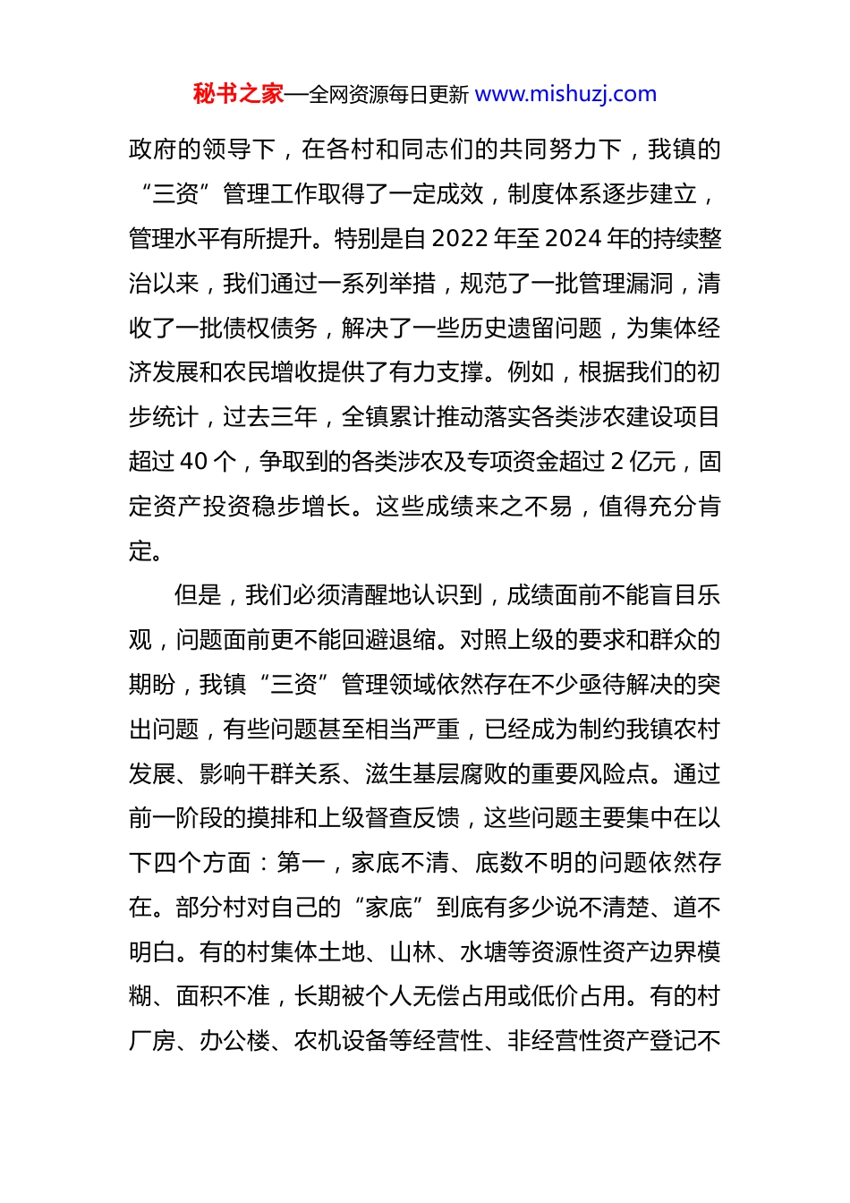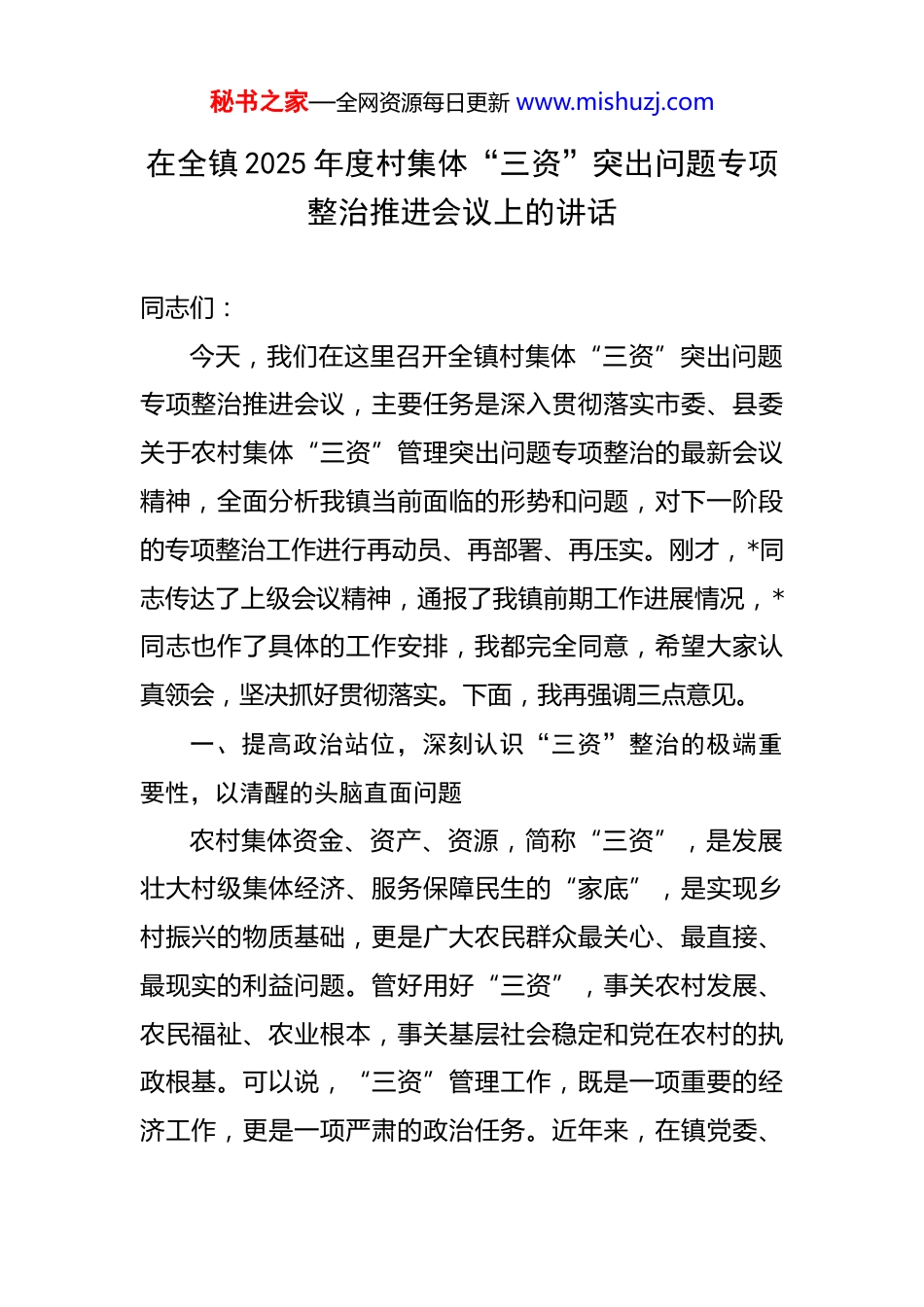 秘书之家—全网资源每日更新 www.mishuzj.com在全镇 2025 年度村集体“三资”突出问题专项整治推进会议上的讲话 同志们:今天,我们在这里召开全镇村集体“三资”突出问题专项整治推进会议,主要任务是深入贯彻落实市委、县委关于农村集体“三资”管理突出问题专项整治的最新会议精神,全面分析我镇当前面临的形势和问题,对下一阶段的专项整治工作进行再动员、再部署、再压实。刚才,*同志传达了上级会议精神,通报了我镇前期工作进展情况,*同志也作了具体的工作安排,我都完全同意,希望大家认真领会,坚决抓好贯彻落实。下面,我再强调三点意见。一、提高政治站位,深刻认识“三资”整治的极端重要性,以清醒的头脑直面问题农村集体资金、资产、资源,简称“三资”,是发展壮大村级集体经济、服务保障民生的“家底”,是实现乡村振兴的物质基础,更是广大农民群众最关心、最直接、最现实的利益问题。管好用好“三资”,事关农村发展、农民福祉、农业根本,事关基层社会稳定和党在农村的执政根基。可以说,“三资”管理工作,既是一项重要的经济工作,更是一项严肃的政治任务。近年来,在镇党委、秘书之家—全网资源每日更新 www.mishuzj.com政府的领导下,在各村和同志们的共同努力下,我镇的“三资”管理工作取得了一定成效,制度体系逐步建立,管理水平有所提升。特别是自 2022 年至 2024 年的持续整治以来,我们通过一系列举措,规范了一批管理漏洞,清收了一批债权债务,解决了一些历史遗留问题,为集体经济发展和农民增收提供了有力支撑。例如,根据我们的初步统计,过去三年,全镇累计推动落实各类涉农建设项目超过 40 个,争取到的各类涉农及专项资金超过 2 亿元,固定资产投资稳步增长。这些成绩来之不易,值得充分肯定。但是,我们必须清醒地认识到,成绩面前不能盲目乐观,问题面前更不能回避退缩。对照上级的要求和群众的期盼,我镇“三资”管理领域依然存在不少亟待解决的突出问题,有些问题甚至相当严重,已经成为制约我镇农村发展、影响干群关系、滋生基层腐败的重要风险点。通过前一阶段的摸排和上级督查反馈,这些问题主要集中在以下四个方面:第一,家底不清、底数不明的问题依然存在。部分村对自己的“家底”到底有多少说不清楚、道不明白。有的村集体土地、山林、水塘等资源性资产边界模糊、面积不准,长期被个人无偿占用或低价占用。有的村厂房、办公楼、农机设备等经营性、非经营性资产登记不秘书之家—全网资源每日更新 www.mishuzj.com全、权属不清,存在账实不符、账外有资的情况。还有的村集体资金存在“账外账”,甚至仍有现金坐收坐支的现象。这种“糊涂账”,不仅导致集体资产流失,更容易引发矛盾纠纷,为少数人的暗箱操作提供了空间。第二,管理不规范、制度不健全的问题尤为突出。这是当前“三资”管理乱象的核心症结。一些村的经济合同管理极其混乱,存在大量口头协议、阴阳合同、超长期限合同和显失公平的“人情合同”。据我们初步掌握,全镇范围内仍有超过 30 份集体经济合同存在条款不规范、要素不齐全、程序不合规等问题。一些村在重大资产处置、工程项目发包等决策上,没有严格执行“四议两公开”民主程序,村干部“一言堂”“一支笔”现象屡禁不止。财务管理制度形同虚设,大额资金使用审批不严,“白条”抵库、公款私存、违规列支等现象时有发生,给集体资金安全带来了巨大隐患。第三,监督不到位、公开不透明的问题亟须破解。监督是权力规范运行的根本保障。当前,我镇部分村的村务监督委员会作用发挥不充分,有的甚至成为“稻草人”,不敢监督、不愿监督、不会监督。村务、财务公开流于形式,有的村虽然设置了公示栏,但公开内容不及时、不全面、不具体,群众看不懂、难监督。比如,资金怎么花的,项目怎么建的,资源怎么包的,往往是一笔糊秘书之家—全网资源每日更新 www.mishuzj.com涂账。这种不透明的状态,严重损害了群众的知情权、参与权和监督权,是引发群众上访、侵蚀干群信任的直接导火索。第四,资产效益低、保值增值难的问题普遍存在。盘活存量资产是壮大集体经济的重要途径。但我镇部分村集体资产长期...