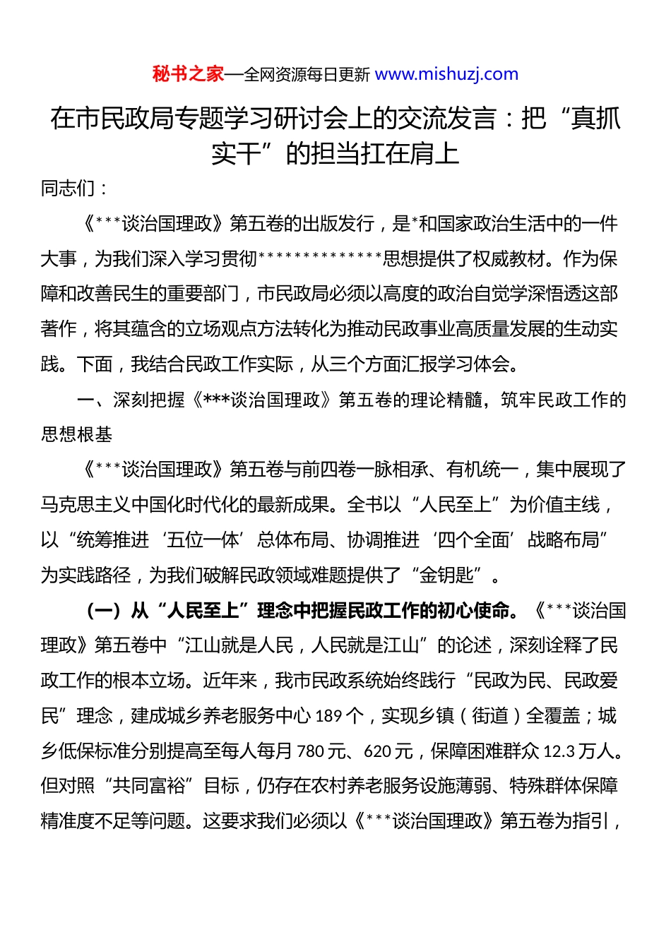 秘书之家—全网资源每日更新 www.mishuzj.com在市民政局专题学习研讨会上的交流发言:把“真抓实干”的担当扛在肩上同志们:《***谈治国理政》第五卷的出版发行,是*和国家政治生活中的一件大事,为我们深入学习贯彻**************思想提供了权威教材。作为保障和改善民生的重要部门,市民政局必须以高度的政治自觉学深悟透这部著作,将其蕴含的立场观点方法转化为推动民政事业高质量发展的生动实践。下面,我结合民政工作实际,从三个方面汇报学习体会。一、深刻把握《***谈治国理政》第五卷的理论精髓,筑牢民政工作的思想根基《***谈治国理政》第五卷与前四卷一脉相承、有机统一,集中展现了马克思主义中国化时代化的最新成果。全书以“人民至上”为价值主线,以“统筹推进‘五位一体’总体布局、协调推进‘四个全面’战略布局”为实践路径,为我们破解民政领域难题提供了“金钥匙”。(一)从“人民至上”理念中把握民政工作的初心使命。《***谈治国理政》第五卷中“江山就是人民,人民就是江山”的论述,深刻诠释了民政工作的根本立场。近年来,我市民政系统始终践行“民政为民、民政爱民”理念,建成城乡养老服务中心 189 个,实现乡镇(街道)全覆盖;城乡低保标准分别提高至每人每月 780 元、620 元,保障困难群众 12.3 万人。但对照“共同富裕”目标,仍存在农村养老服务设施薄弱、特殊群体保障精准度不足等问题。这要求我们必须以《***谈治国理政》第五卷为指引,秘书之家—全网资源每日更新 www.mishuzj.com始终把群众急难愁盼放在心上,用“绣花”功夫做好民生兜底保障。(二)从“系统观念”方法中提升民政治理效能。《***谈治国理政》第五卷强调“统筹发展和安全”“坚持系统观念”,为民政工作提供了科学方法论。当前,我市正面临人口老龄化加速、社会组织管理难度加大等挑战。我们必须运用系统思维统筹推进各项工作。在养老服务上,构建“居家社区机构相协调、医养康养相结合”的服务体系;在基层治理中,深化“dj 引领+社会组织+志愿服务”模式;在儿童福利领域,完善“监测预防、动态帮扶、应急处置”全链条机制。通过系统性改革,推动民政工作从“保基本”向“高品质”跨越。(三)从“守正创新”要求中激发民政事业活力。《***谈治国理政》第五卷指出“创新是引领发展的第一动力”。近年来,我市民政系统探索“互联网+民政服务”,实现低保、救助等 8 项业务“掌上办”,但智慧养老平台覆盖率仅为 65%,与群众期待仍有差距。我们要以理论创新带动实践突破,加快推进“数字民政”建设,开发特殊群体动态监测系统,推动惠民政策“精准滴灌”;同时深化社会组织管理制度改革,培育社区社会组织 500 家以上,打造基层治理“生力军”。二、锚定“国之大者”,推动理论学习与民政实践深度融合******强调“民政工作关系民生、连着民心”。我们要把学习《***谈治国理政》第五卷与贯彻***关于民生保障的重要论述结合起来,聚焦“三地一区”建设战略,找准民政工作服务大局的切入点。(一)以“弱有所扶”为重点,筑牢民生保障底线。《***谈治国理秘书之家—全网资源每日更新 www.mishuzj.com政》第五卷“让人民生活幸福是‘国之大者’”的论述,要求我们兜住兜牢困难群众基本生活底线。下一步要重点推进三项工作。精准救助提标扩面。建立困难群众动态监测机制,将支出型困难家庭纳入保障范围,2025年实现低保标准自然增长机制全覆盖;临时救助高效响应。推行“先行救助”模式,对急难型救助对象 24 小时内予以响应,全年救助困难群众不少于 3 万人次;慈善力量协同发力。搭建“慈善+社工+志愿服务”平台,开展“助老、助孤、助残”专项行动,募集慈善资金超 5000 万元。(二)以“老有颐养”为目标,构建养老服务新格局。针对我市老龄化特点,落实《***谈治国理政》第五卷“积极应对人口老龄化”要求,实施三大工程。社区养老提质增效。新建嵌入式养老服务站 30 个,实现城市社区全覆盖;推广“物业+养老”模式,为居家老人提供助餐、助浴等“六助”服务;机构养老转型发展。推动 80%公办养老机构转型为区域性照护中心,新增护理型床位 1200...