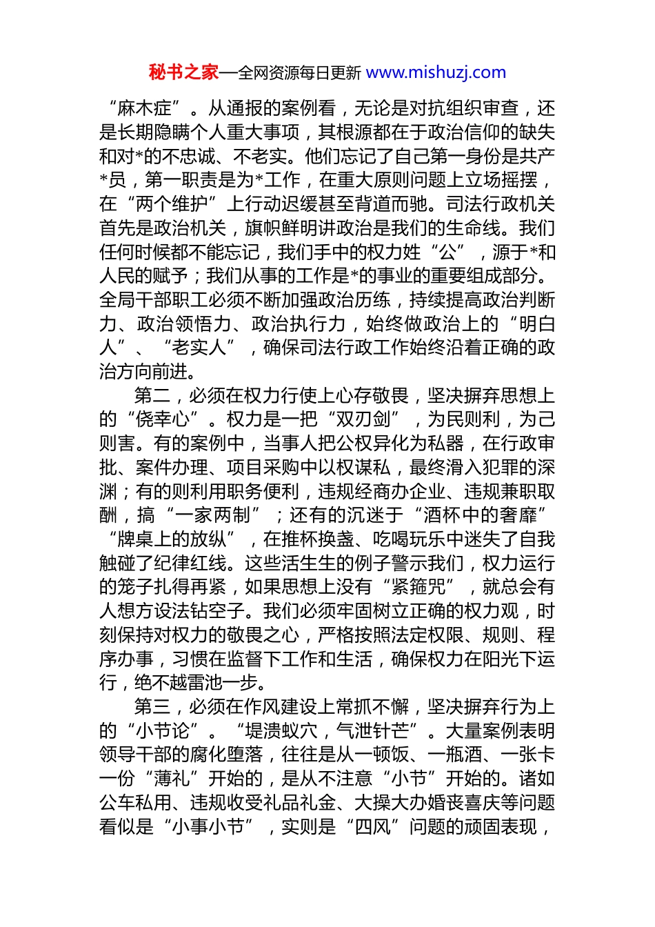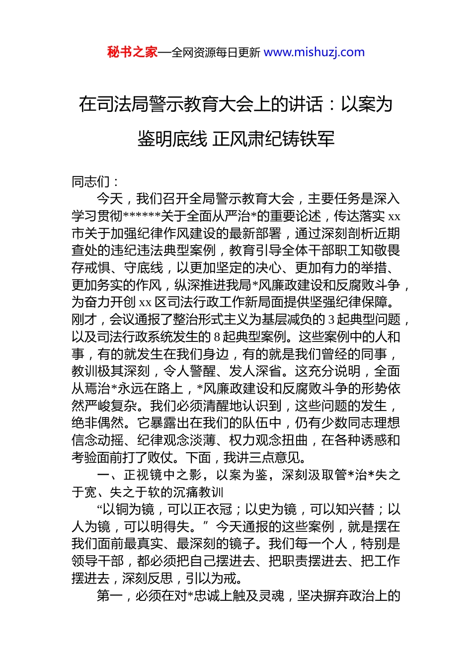 秘书之家—全网资源每日更新 www.mishuzj.com在司法局警示教育大会上的讲话:以案为鉴明底线 正风肃纪铸铁军同志们:今天,我们召开全局警示教育大会,主要任务是深入学习贯彻******关于全面从严治*的重要论述,传达落实 xx市关于加强纪律作风建设的最新部署,通过深刻剖析近期查处的违纪违法典型案例,教育引导全体干部职工知敬畏存戒惧、守底线,以更加坚定的决心、更加有力的举措、更加务实的作风,纵深推进我局*风廉政建设和反腐败斗争,为奋力开创 xx 区司法行政工作新局面提供坚强纪律保障。刚才,会议通报了整治形式主义为基层减负的 3 起典型问题,以及司法行政系统发生的 8 起典型案例。这些案例中的人和事,有的就发生在我们身边,有的就是我们曾经的同事,教训极其深刻,令人警醒、发人深省。这充分说明,全面从焉治*永远在路上,*风廉政建设和反腐败斗争的形势依然严峻复杂。我们必须清醒地认识到,这些问题的发生,绝非偶然。它暴露出在我们的队伍中,仍有少数同志理想信念动摇、纪律观念淡薄、权力观念扭曲,在各种诱惑和考验面前打了败仗。下面,我讲三点意见。一、正视镜中之影,以案为鉴,深刻汲取管*治*失之于宽、失之于软的沉痛教训“以铜为镜,可以正衣冠;以史为镜,可以知兴替;以人为镜,可以明得失。”今天通报的这些案例,就是摆在我们面前最真实、最深刻的镜子。我们每一个人,特别是领导干部,都必须把自己摆进去、把职责摆进去、把工作摆进去,深刻反思,引以为戒。第一,必须在对*忠诚上触及灵魂,坚决摒弃政治上的秘书之家—全网资源每日更新 www.mishuzj.com“麻木症”。从通报的案例看,无论是对抗组织审查,还是长期隐瞒个人重大事项,其根源都在于政治信仰的缺失和对*的不忠诚、不老实。他们忘记了自己第一身份是共产*员,第一职责是为*工作,在重大原则问题上立场摇摆,在“两个维护”上行动迟缓甚至背道而驰。司法行政机关首先是政治机关,旗帜鲜明讲政治是我们的生命线。我们任何时候都不能忘记,我们手中的权力姓“公”,源于*和人民的赋予;我们从事的工作是*的事业的重要组成部分。全局干部职工必须不断加强政治历练,持续提高政治判断力、政治领悟力、政治执行力,始终做政治上的“明白人”、“老实人”,确保司法行政工作始终沿着正确的政治方向前进。第二,必须在权力行使上心存敬畏,坚决摒弃思想上的“侥幸心”。权力是一把“双刃剑”,为民则利,为己则害。有的案例中,当事人把公权异化为私器,在行政审批、案件办理、项目采购中以权谋私,最终滑入犯罪的深渊;有的则利用职务便利,违规经商办企业、违规兼职取酬,搞“一家两制”;还有的沉迷于“酒杯中的奢靡”“牌桌上的放纵”,在推杯换盏、吃喝玩乐中迷失了自我触碰了纪律红线。这些活生生的例子警示我们,权力运行的笼子扎得再紧,如果思想上没有“紧箍咒”,就总会有人想方设法钻空子。我们必须牢固树立正确的权力观,时刻保持对权力的敬畏之心,严格按照法定权限、规则、程序办事,习惯在监督下工作和生活,确保权力在阳光下运行,绝不越雷池一步。第三,必须在作风建设上常抓不懈,坚决摒弃行为上的“小节论”。“堤溃蚁穴,气泄针芒”。大量案例表明领导干部的腐化堕落,往往是从一顿饭、一瓶酒、一张卡一份“薄礼”开始的,是从不注意“小节”开始的。诸如公车私用、违规收受礼品礼金、大操大办婚丧喜庆等问题看似是“小事小节”,实则是“四风”问题的顽固表现,秘书之家—全网资源每日更新 www.mishuzj.com是腐败滋生的重要温床。我们必须深刻认识到,作风问题无小事,小节不守,大节必失。要持续深化对纪律规定的学习理解,对“四风”隐形变异新动向时刻保持高度警惕坚决远离形形色色的“小圈子”,警惕饱含目的的“小意思”,管住消磨意志的“小爱好”,真正做到稳住心神、管住行为、守住清白,让清正廉洁的风气内化于心、外化于行。二、绷紧纪律之弦,以纪为尺,坚定不移把全面从严治*要求落到实处纪律是管*治*的“戒尺”,也是*员干部约束自身行为的标准和遵循。面对新形势新任务,我们必须把纪律建设摆在更加突出的位置,用铁的纪律锻造铁的队伍。一...