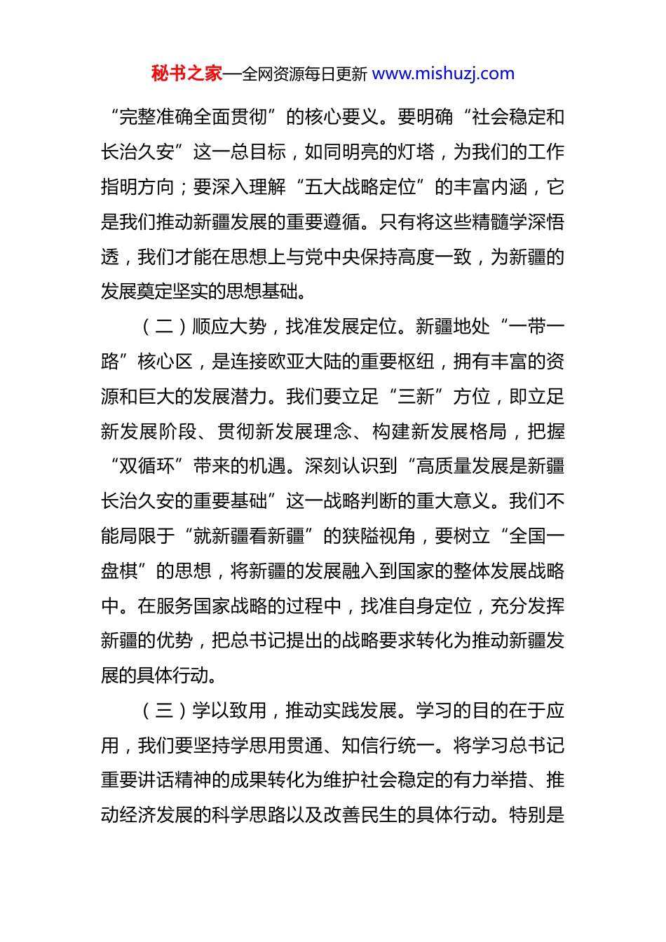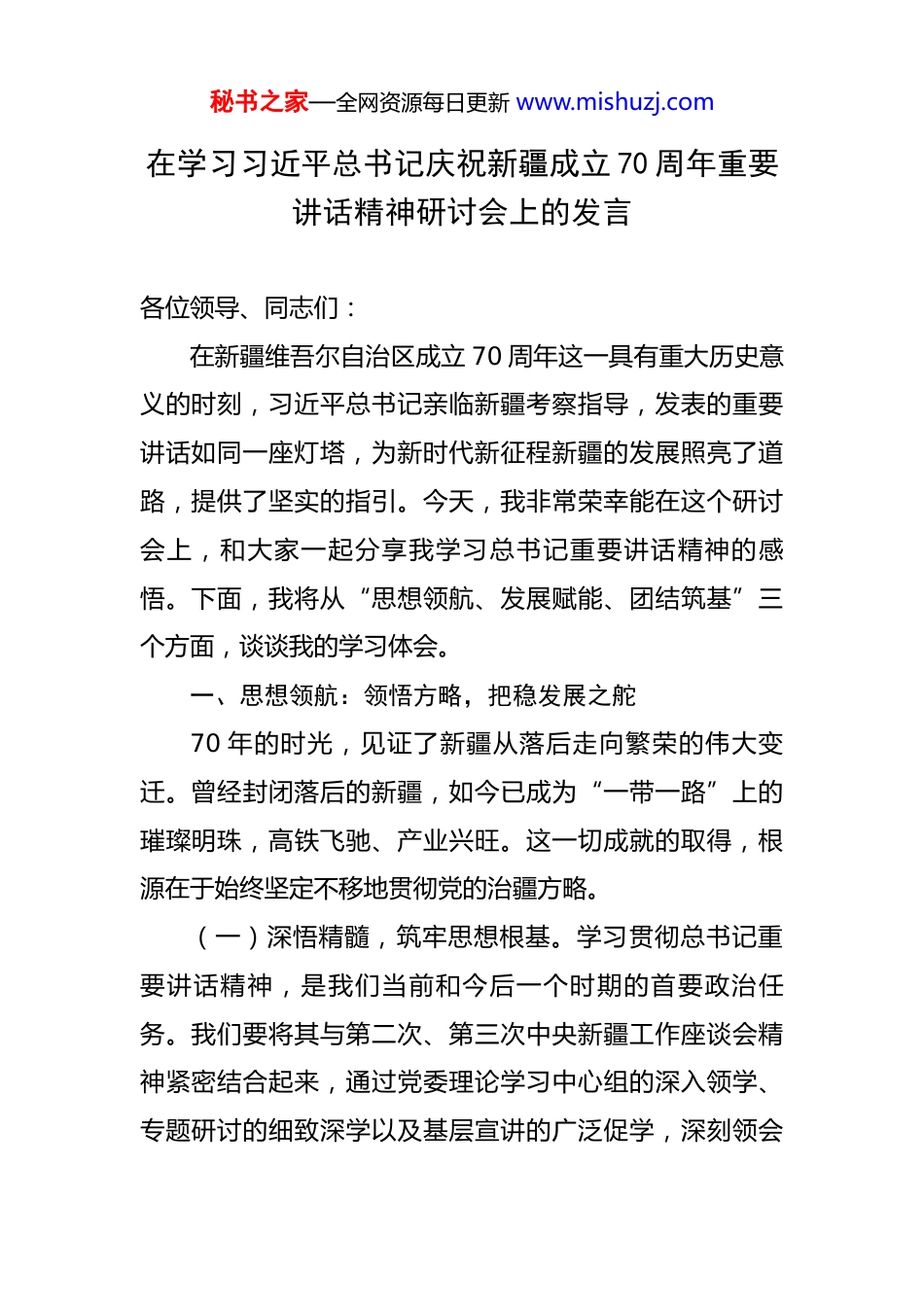 秘书之家—全网资源每日更新 www.mishuzj.com在学习习近平总书记庆祝新疆成立 70 周年重要讲话精神研讨会上的发言 各位领导、同志们:在新疆维吾尔自治区成立 70 周年这一具有重大历史意义的时刻,习近平总书记亲临新疆考察指导,发表的重要讲话如同一座灯塔,为新时代新征程新疆的发展照亮了道路,提供了坚实的指引。今天,我非常荣幸能在这个研讨会上,和大家一起分享我学习总书记重要讲话精神的感悟。下面,我将从“思想领航、发展赋能、团结筑基”三个方面,谈谈我的学习体会。一、思想领航:领悟方略,把稳发展之舵70 年的时光,见证了新疆从落后走向繁荣的伟大变迁。曾经封闭落后的新疆,如今已成为“一带一路”上的璀璨明珠,高铁飞驰、产业兴旺。这一切成就的取得,根源在于始终坚定不移地贯彻党的治疆方略。(一)深悟精髓,筑牢思想根基。学习贯彻总书记重要讲话精神,是我们当前和今后一个时期的首要政治任务。我们要将其与第二次、第三次中央新疆工作座谈会精神紧密结合起来,通过党委理论学习中心组的深入领学、专题研讨的细致深学以及基层宣讲的广泛促学,深刻领会秘书之家—全网资源每日更新 www.mishuzj.com“完整准确全面贯彻”的核心要义。要明确“社会稳定和长治久安”这一总目标,如同明亮的灯塔,为我们的工作指明方向;要深入理解“五大战略定位”的丰富内涵,它是我们推动新疆发展的重要遵循。只有将这些精髓学深悟透,我们才能在思想上与党中央保持高度一致,为新疆的发展奠定坚实的思想基础。(二)顺应大势,找准发展定位。新疆地处“一带一路”核心区,是连接欧亚大陆的重要枢纽,拥有丰富的资源和巨大的发展潜力。我们要立足“三新”方位,即立足新发展阶段、贯彻新发展理念、构建新发展格局,把握“双循环”带来的机遇。深刻认识到“高质量发展是新疆长治久安的重要基础”这一战略判断的重大意义。我们不能局限于“就新疆看新疆”的狭隘视角,要树立“全国一盘棋”的思想,将新疆的发展融入到国家的整体发展战略中。在服务国家战略的过程中,找准自身定位,充分发挥新疆的优势,把总书记提出的战略要求转化为推动新疆发展的具体行动。(三)学以致用,推动实践发展。学习的目的在于应用,我们要坚持学思用贯通、知信行统一。将学习总书记重要讲话精神的成果转化为维护社会稳定的有力举措、推动经济发展的科学思路以及改善民生的具体行动。特别是秘书之家—全网资源每日更新 www.mishuzj.com要紧扣“让各族群众共享发展成果”的要求,把学习的课堂延伸到田间地头、社区车间。在解决群众“急难愁盼”问题的过程中,检验我们的学习成效,让党的创新理论在新疆大地落地生根、开花结果,真正惠及各族人民群众。二、发展赋能:聚焦要务,激发前进动力当下,新疆正处于政策机遇叠加的“黄金期”、优势逐步释放的“窗口期”和发展动能转换的“关键期”。总书记强调,要立足新疆的资源禀赋和产业基础,积极探索符合新疆特点的高质量发展道路。这为我们指明了发展的方向和路径。(一)突出特色,壮大产业实力。新疆具有独特的资源优势,我们要坚持“特”字当头。充分发挥“一黑一白”的传统优势,“一黑”指的是石油、煤炭等黑色能源资源,“一白”指的是棉花等白色产业。做优“粮、棉、果、畜”四大产业集群,推动棉花全产业链升级,提高棉花产业的附加值;打造全国优质畜产品生产基地,提升畜牧业的现代化水平。同时,坚持“新”字为要,加快煤炭清洁高效利用,积极推进风光电基地建设,培育壮大新能源、新材料等战略性新兴产业,为新疆的经济发展注入新的活力。此外,坚持“融”字发力,深化“旅游+”模式,挖掘“西域文化”“丝路文化”的深厚内涵,丰富旅游产秘书之家—全网资源每日更新 www.mishuzj.com品供给,让“新疆是个好地方”的品牌更加响亮,吸引更多的游客前来,带动相关产业的发展。(二)深化改革,扩大对外开放。新疆作为“一带一路”核心区,开放是其最大的优势。我们要深化“放管服”改革,打造市场化、法治化、国际化的营商环境,让各类市场主体,包括国企、民企和外企,都能在新疆这片土地上安心投资、放心发展。加快丝绸之路...