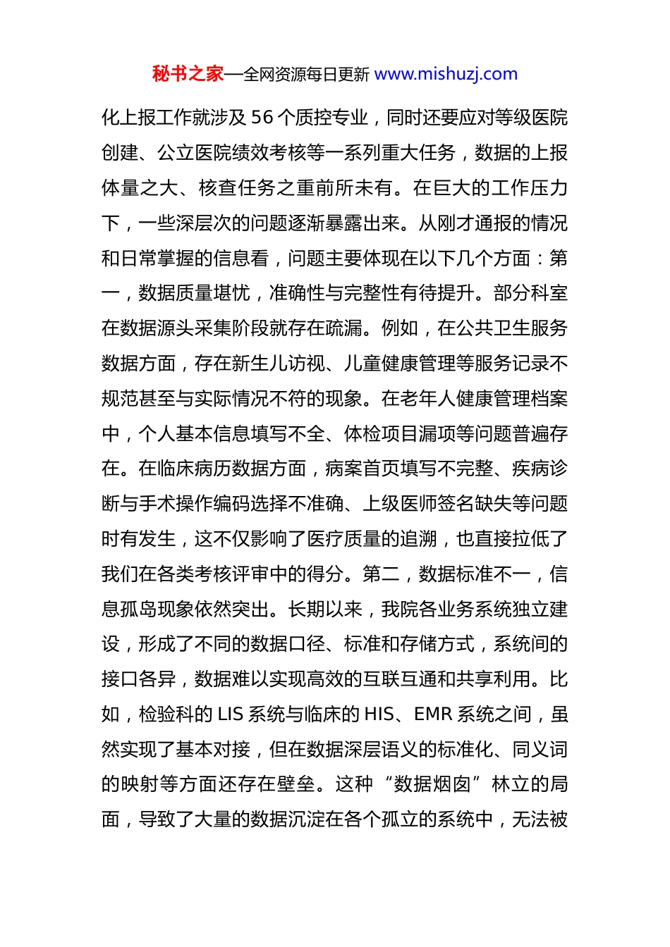 秘书之家—全网资源每日更新 www.mishuzj.com在医院 2025 年数据管理工作会议上的讲话 同志们:今天,我们在这里召开全院数据管理工作会议,主要任务是深入分析当前我院数据管理工作面临的新形势与新挑战,全面部署下一阶段的重点工作,动员全院上下进一步统一思想、凝聚共识、强化执行,以高水平的数据治理能力,为医院高质量发展注入强劲动力。刚才,*同志通报了近期数据上报工作中存在的主要问题,提出了初步的规范要求;相关部门的负责同志也结合各自工作实际,进行了深入的讨论和表态,讲得都很好,我都同意。下面,我再讲几点意见。一、统一思想,认清形势,深刻认识数据管理工作的严峻性与紧迫性近年来,在全院干部职工的共同努力下,我院的信息化建设取得了长足进步,为临床诊疗、运营管理、科研教学等各项工作提供了有力支撑,取得了一定的成绩。但是,我们必须清醒地认识到,与新时代智慧医院建设的要求相比,与人民群众日益增长的健康需求相比,我院的数据管理工作仍然存在诸多不容忽视的短板和瓶颈。我们面临的挑战是现实而严峻的。当前,我院仅常态秘书之家—全网资源每日更新 www.mishuzj.com化上报工作就涉及 56 个质控专业,同时还要应对等级医院创建、公立医院绩效考核等一系列重大任务,数据的上报体量之大、核查任务之重前所未有。在巨大的工作压力下,一些深层次的问题逐渐暴露出来。从刚才通报的情况和日常掌握的信息看,问题主要体现在以下几个方面:第一,数据质量堪忧,准确性与完整性有待提升。部分科室在数据源头采集阶段就存在疏漏。例如,在公共卫生服务数据方面,存在新生儿访视、儿童健康管理等服务记录不规范甚至与实际情况不符的现象。在老年人健康管理档案中,个人基本信息填写不全、体检项目漏项等问题普遍存在。在临床病历数据方面,病案首页填写不完整、疾病诊断与手术操作编码选择不准确、上级医师签名缺失等问题时有发生,这不仅影响了医疗质量的追溯,也直接拉低了我们在各类考核评审中的得分。第二,数据标准不一,信息孤岛现象依然突出。长期以来,我院各业务系统独立建设,形成了不同的数据口径、标准和存储方式,系统间的接口各异,数据难以实现高效的互联互通和共享利用。比如,检验科的 LIS 系统与临床的 HIS、EMR 系统之间,虽然实现了基本对接,但在数据深层语义的标准化、同义词的映射等方面还存在壁垒。这种“数据烟囱”林立的局面,导致了大量的数据沉淀在各个孤立的系统中,无法被秘书之家—全网资源每日更新 www.mishuzj.com有效整合、挖掘和利用,数据价值大打折扣。第三,管理流程缺失,协同机制尚未形成合力。目前,我院的数据管理仍然停留在“头痛医头、脚痛医脚”的被动响应阶段,缺乏一个全流程、闭环式的管理体系。数据的采集、审核、上报、反馈等环节权责不清,跨部门协同不畅。经常出现的情况是,信息科为了完成上报任务,疲于在各个业务科室之间沟通协调、催要数据;而业务科室则认为这是信息科的“分外之事”,配合度不高,导致数据报送的及时性和准确性大打折扣。这种“全院一盘棋”思想的缺失,严重制约了我院数据管理工作的整体效能。同志们,数据是医院的核心战略资产,是驱动精细化管理和高质量发展的“石油”和“引擎”。上述这些问题,看似是技术问题、流程问题,但根源上是思想认识问题、管理理念问题。如果不能从根本上扭转局面,我们不仅会在日趋激烈的的区域医疗竞争中落后,更无法完成党和人民赋予我们的守护生命健康的神圣使命。因此,我们必须以壮士断腕的决心和刮骨疗毒的勇气,全面加强数据管理工作,这既是应对当前挑战的迫切需要,也是赢得未来发展主动权的战略抉择。二、明确责任,厘清边界,构建科学高效的数据治理组织体系秘书之家—全网资源每日更新 www.mishuzj.com善治者,必先治其本。数据治理是一项复杂的系统工程,必须建立一个强有力、高效率的组织领导体系作为根本保障。过去那种职责不清、多头管理、无人负责的混乱局面必须彻底终结。接下来,我们要着力构建一个“院级主导、中心主建、科室主责”的三级联动数据治理新模式。第一,成立医院数据管理委员会,强化顶层设...