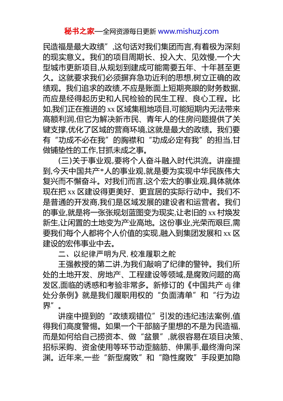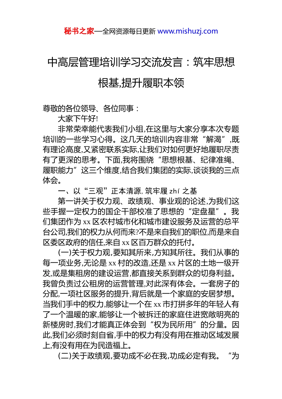 秘书之家—全网资源每日更新 www.mishuzj.com中高层管理培训学习交流发言:筑牢思想根基,提升履职本领尊敬的各位领导、各位同事:大家下午好!非常荣幸能代表我们小组,在这里与大家分享本次专题培训的一些学习心得。这几天的培训内容非常“解渴”,既有理论高度,又紧密联系实际,让我们对如何更好地履职尽责有了更深的思考。下面,我将围绕“思想根基、纪律准绳、履职能力”这三个维度,结合我们集团的实际,谈谈我的三点体会。一、以“三观”正本清源,筑牢履 zhí 之基第一讲关于权力观、政绩观、事业观的论述,为我们这些手握一定权力的国企干部校准了思想的“定盘星”。我们集团作为 xx 区农村城市化和城市建设服务及运营的总平台公司,我们的权力从何而来?不是来自我们的职位,而是来自区委区政府的信任,来自 xx 区百万群众的托付。(一)关于权力观,要知其所来,方知其所往。我们从事的每一项业务,无论是 xx 村的改造,还是 xx 片区的土地一级开发,或是集租房的建设运营,都直接关系到群众的切身利益。我曾负责过公租房的运营管理,对此深有体会。一套房子的分配,一项社区服务的提升,背后就是一个家庭的安居梦想。当我们手中的权力,能够让一个在 xx 市打拼多年的年轻人有了一个温暖的家,能够让一个被拆迁的家庭住进宽敞明亮的新楼房时,我们才能真正体会到“权为民所用”的分量。因此,我们必须时刻自省,手中的权力有没有用在推动区域发展上,有没有用在为民造福上。(二)关于政绩观,要功成不必在我,功成必定有我。“为秘书之家—全网资源每日更新 www.mishuzj.com民造福是最大政绩”,这句话对我们集团而言,有着极为深刻的现实意义。我们的项目周期长、投入大、见效慢,一个大型城市更新项目,从规划到建成可能需要五年、十年甚至更久。这就要求我们必须摒弃急功近利的思想,树立正确的政绩观。我们追求的政绩,不应是账面上短期亮眼的财务数据,而应是经得起历史和人民检验的民生工程、良心工程。比如,我们正在推进的 xx 区域集租地项目,可能短期内无法带来高额利润,但它为解决新市民、青年人的住房问题提供了关键支撑,优化了区域的营商环境,这就是最大的政绩。我们要有“功成不必在我”的胸襟和“功成必定有我”的担当,甘做铺垫性的工作,甘抓未成之事。(三)关于事业观,要将个人奋斗融入时代洪流。讲座提到,今天中国共产*人的事业观,就是要为实现中华民族伟大复兴而不懈奋斗。对我们而言,这个宏大的事业观,具体就体现在把 xx 区建设得更美好、更宜居的实际行动中。我们不是普通的开发商,我们是区域发展的建设者和运营者。我们的事业,就是将一张张规划蓝图变为现实,让老旧的 xx 村焕发新生,让闲置的土地变为产业高地。这份事业,光荣而艰巨,需要我们每个人都将个人价值的实现,融入到集团发展和 xx 区建设的宏伟事业中去。二、以纪律严明为尺,校准履职之舵王强教授的第二讲,为我们敲响了纪律的警钟。我们所处的土地开发、房地产、工程建设等领域,是腐败问题的高发区,面临的诱惑和考验非常多。新修订的《中国共产 dj 律处分条例》就是我们履职用权的“负面清单”和“行为边界”。讲座中提到的“政绩观错位”引发的违纪违法案例,值得我们高度警惕。如果一个干部脑子里想的不是为民造福,而是如何给自己捞资本、做“盆景”,就很容易在项目决策、招标采购、资金使用等环节动歪脑筋、伸黑手,最终滑向深渊。近年来,一些“新型腐败”和“隐性腐败”手段更加隐秘书之家—全网资源每日更新 www.mishuzj.com蔽,这要求我们必须不断增强政治判断力、政治领悟力、政治执行力,不仅要管住自己的手,还要管住自己的心和嘴。特别是网络言行失范问题,在今天这个信息时代尤为突出。作为集团的中高层管理人员,我们的一言一行都备受关注,代表着集团的形象。在社交媒体上发布不当言论,或是在工作群里口无遮拦,看似是小事,却可能违反政治纪律和政治规矩,甚至引发舆情危机,给集团带来难以估量的损失。我们必须时刻牢记自己的身份,线上线下都严守纪律,做到言有所戒、行有所止。三、以媒介素养为器,提升履职之能第三讲《突发事件应对与领导干部媒体素养修炼》,这是我们当前履职能力中一块亟待补强的“短板”...