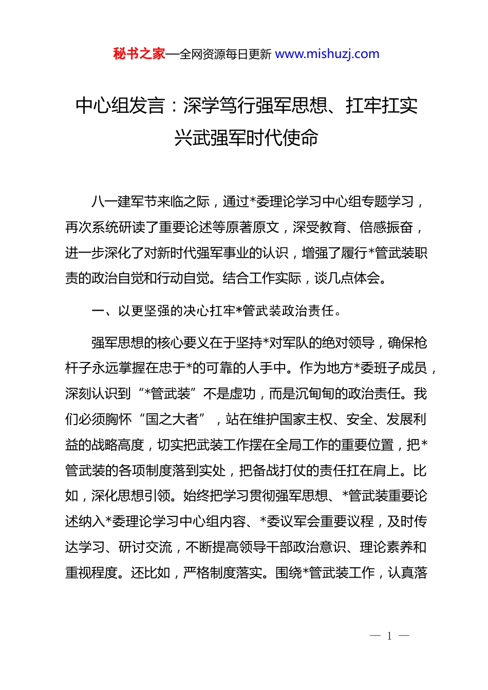 秘书之家—全网资源每日更新 www.mishuzj.com中心组发言:深学笃行强军思想、扛牢扛实兴武强军时代使命八一建军节来临之际,通过*委理论学习中心组专题学习,再次系统研读了重要论述等原著原文,深受教育、倍感振奋,进一步深化了对新时代强军事业的认识,增强了履行*管武装职责的政治自觉和行动自觉。结合工作实际,谈几点体会。一、以更坚强的决心扛牢*管武装政治责任。强军思想的核心要义在于坚持*对军队的绝对领导,确保枪杆子永远掌握在忠于*的可靠的人手中。作为地方*委班子成员,深刻认识到“*管武装”不是虚功,而是沉甸甸的政治责任。我们必须胸怀“国之大者”,站在维护国家主权、安全、发展利益的战略高度,切实把武装工作摆在全局工作的重要位置,把*管武装的各项制度落到实处,把备战打仗的责任扛在肩上。比如,深化思想引领。始终把学习贯彻强军思想、*管武装重要论述纳入*委理论学习中心组内容、*委议军会重要议程,及时传达学习、研讨交流,不断提高领导干部政治意识、理论素养和重视程度。还比如,严格制度落实。围绕*管武装工作,认真落— 1 —秘书之家—全网资源每日更新 www.mishuzj.com实双重领导、双向兼职、*委议军、*管武装述职等一系列完备完善的制度机制,有效推进各项工作落实。再比如,抓好考核评价,对*管武装制度等工作情况督办,以项目化、清单化方式推动落地落实,确保*管武装工作只能加强,不能削弱。二、以更高的水平全力支持和服务国防后备力量建设。懂武装才能爱武装、抓武装。围绕研战知战,我们要进一步学习国防后备力量建设、国防动员等专业知识,在学习中提升战略思维和军事思维,结合实际助力提升备战打赢能力。比如,提高国防动员建设水平。坚持把国防动员和后备力量建设纳入经济社会发展总体规划,国防动员能力着眼多领域、优质化、精准性、灵敏性等,适应信息化、网格化等形势,积极推进智慧动员,提高动员行动效率,切实服务好部队备战打仗。还比如,抓好后备力量建设,加强民兵组织建设,组织军地联训联演,在实战化练兵用兵中,不断提升民兵完成急难险重任务能力,这也是提升后备力量支援保障、快速反应能力。再比如,抓好地方卫生健康工作,织密织牢公共卫生防护网,持续加强医疗机构服务能力和医务人员队伍建设,增强基层医疗服务、医疗卫生应急处置能力。三、以更大的情怀巩固军政军民团结。— 2 —秘书之家—全网资源每日更新 www.mishuzj.com我们有“军民团结如一人,试看天下谁能敌”的优良传统和独特优势,军队爱人民,人民拥护军队,这种血肉联系是任何敌人无法撼动的力量。我们要深耕双拥共建沃土,更加深切体会“军队打胜仗,人民是靠山”的深刻内涵,做好新时代双拥工作。比如,主动了解驻军部队战备训练、工作生活中遇到的困难,全心全意为部队官兵办实事、解难事、做好事,让广大官兵不为后路担心、不为后院分心、不为后代忧心,自觉当好拥军强军的“后勤部”和“服务队”,全力保障军人军属合法权益。还比如,持续擦亮“双拥模范城”金字招牌,创新双拥载体,拓展双拥领域,在全社会大力营造尊崇军人的浓厚氛围,让“一人参军、全家光荣”“军人优先”“军人荣光”成为社会风尚,不断巩固和发展“同呼吸、共命运、心连心”的军政军民关系,为强军兴军打下坚实的群众社会基础。四、以更强的忧患意识加强全民国防教育。当今世界并不太平,国际形势风云变幻,传统安全威胁与新型安全风险交织叠加,国家安全的综合性、复杂性、多变性显著增强。承平日久、居安忘危,是最大的风险隐患。部分干部群众忧患意识也有所弱化,存在履行国防职责主动性不足、落实*管武装工作制度不严等问题。推进*管武装工作落实,必— 3 —秘书之家—全网资源每日更新 www.mishuzj.com须深化全民国防教育,增强全民国防观念。比如,深入发掘用好红色资源,创新教育形式、丰富教育内容、拓展教育载体,传承革命精神,激发爱国热情,积极打造富有我地特色的国防教育品牌。还比如,突出学生、预备役民兵等重点对象,讲好强军故事,传播强军声音,不断提高对西方意识形态渗透侵蚀的辨识和抵抗力,进一步增强忧患意识、危机意识,真正关心...