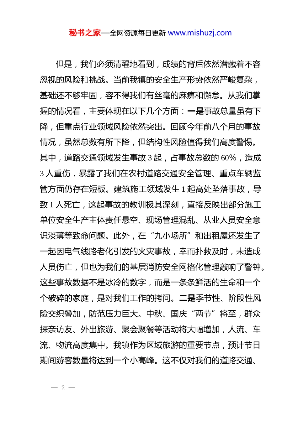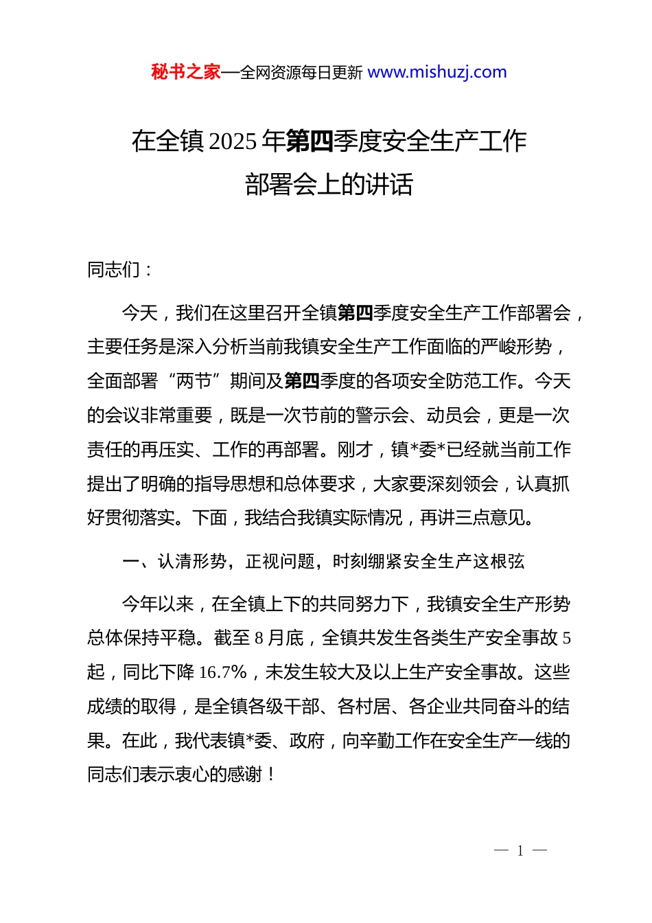 秘书之家—全网资源每日更新 www.mishuzj.com在全镇 2025 年第四季度安全生产工作部署会上的讲话同志们:今天,我们在这里召开全镇第四季度安全生产工作部署会,主要任务是深入分析当前我镇安全生产工作面临的严峻形势,全面部署“两节”期间及第四季度的各项安全防范工作。今天的会议非常重要,既是一次节前的警示会、动员会,更是一次责任的再压实、工作的再部署。刚才,镇*委*已经就当前工作提出了明确的指导思想和总体要求,大家要深刻领会,认真抓好贯彻落实。下面,我结合我镇实际情况,再讲三点意见。一、认清形势,正视问题,时刻绷紧安全生产这根弦今年以来,在全镇上下的共同努力下,我镇安全生产形势总体保持平稳。截至 8 月底,全镇共发生各类生产安全事故 5起,同比下降 16.7%,未发生较大及以上生产安全事故。这些成绩的取得,是全镇各级干部、各村居、各企业共同奋斗的结果。在此,我代表镇*委、政府,向辛勤工作在安全生产一线的同志们表示衷心的感谢!— 1 —秘书之家—全网资源每日更新 www.mishuzj.com但是,我们必须清醒地看到,成绩的背后依然潜藏着不容忽视的风险和挑战。当前我镇的安全生产形势依然严峻复杂,基础还不够牢固,容不得我们有丝毫的麻痹和懈怠。从我们掌握的情况看,主要体现在以下几个方面:一是事故总量虽有下降,但重点行业领域风险依然突出。回顾今年前八个月的事故情况,虽然总数有所下降,但结构性风险值得我们高度警惕。其中,道路交通领域发生事故 3 起,占事故总数的 60%,造成3 人重伤,暴露了我们在农村道路交通安全管理、重点车辆监管方面仍存在短板。建筑施工领域发生 1 起高处坠落事故,导致 1 人死亡,这起事故的教训极其深刻,直接反映出部分施工单位安全生产主体责任悬空、现场管理混乱、从业人员安全意识淡薄等致命问题。此外,在“九小场所”和出租屋还发生了一起因电气线路老化引发的火灾事故,幸而扑救及时,未造成人员伤亡,但也为我们的基层消防安全网格化管理敲响了警钟。这些事故数据不是冰冷的数字,而是一条条鲜活的生命和一个个破碎的家庭,是对我们工作的拷问。二是季节性、阶段性风险交织叠加,防范压力巨大。中秋、国庆“两节”将至,群众探亲访友、外出旅游、聚会聚餐等活动将大幅增加,人流、车流、物流高度集中。我镇作为区域旅游的重要节点,预计节日期间游客数量将达到一个小高峰。这不仅对我们的道路交通、— 2 —秘书之家—全网资源每日更新 www.mishuzj.com旅游景点、餐饮住宿等领域的安全保障能力提出了更高要求,也使得消防安全、食品安全等风险急剧攀升。同时,第四季度是各类生产经营活动的高峰期,也是完成全年经济指标的冲刺期。一些企业为了赶工期、抢进度,很可能出现超能力、超强度、超定员生产的“三超”现象,违章指挥、违规作业、违反劳动纪律的“三违”行为也易发多发,这些都极大地增加了安全生产的不可控因素。三是安全生产责任体系中仍存在“中梗阻”现象。从日常督查和事故调查来看,一些部门的监管责任、一些企业的主体责任落实还不到位。有的部门满足于“以会议落实会议、以文件落实文件”,安全检查“走过场”,隐患整改“打折扣”,没有真正沉下去、严起来。有的企业负责人安全生产意识淡薄,重生产、轻安全,安全投入不足,安全培训流于形式,隐患排查治理制度形同虚设。特别是部分小微企业、个体工商户,安全管理基础薄弱,从业人员安全技能缺失,成为安全监管的难点和事故多发的“重灾区”。这些问题,归根结底是思想上的麻痹松懈和责任上的虚化悬空,是安全生产的最大隐患。同志们,安全生产没有“过去时”,只有“进行时”。我们必须深刻认识到当前工作的极端重要性和紧迫性,坚决克服麻痹思想和侥幸心理,以“时时放心不下”的责任感和“睁眼睡觉”的警觉性,把安全生产这根弦绷得紧而又紧,— 3 —秘书之家—全网资源每日更新 www.mishuzj.com把各项工作抓得实而又实,决不能让我们的工作失误导致群众生命财产的损失。二、聚焦重点,精准施策,坚决筑牢安全生产防护网做好“两节”和第四季度的安全生产工作,必须坚持问题导向、目标导向、结果导...