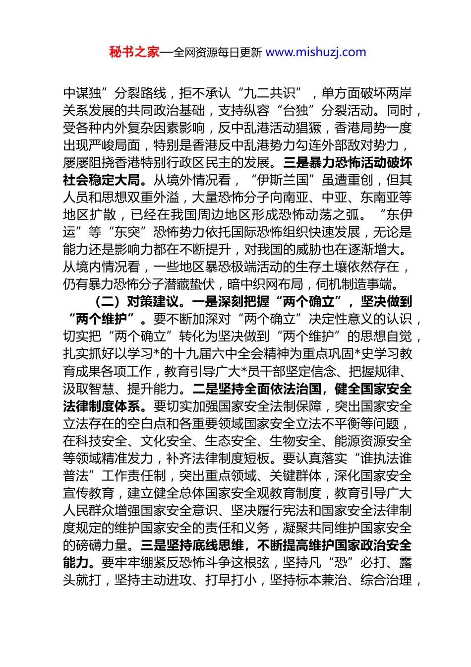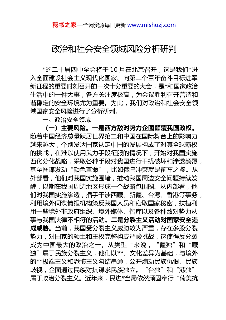 秘书之家—全网资源每日更新 www.mishuzj.com政治和社会安全领域风险分析研判*的二十届四中全会将于 10 月在北京召开,这是我们*进入全面建设社会主义现代化国家、向第二个百年奋斗目标进军新征程的重要时刻召开的一次十分重要的大会,是*和国家政治生活中的一件大事,各方关注度极高,为会议胜利召开营造和谐稳定的安全环境尤为重要。为此,我们对政治和社会安全领域国家安全风险进行了分析研判。一、政治安全领域(一)主要风险。一是西方敌对势力企图颠覆我国政权。随着中国经济总量跃居世界第二和中国在国际舞台上的影响力越来越大,个别发达国家认定中国的发展构成了对其全球霸权的挑战,在难以使用武力手段征服的情况下,开始对我国实施西化分化战略,采取各种手段对我国进行干扰破坏和渗透颠覆,甚至图谋发动“颜色革命”,比如俄乌冲突就是前车之鉴。从外部看,他们对我国实施围堵,推动我国周边安全问题持续发酵,以期在我国周边地区形成一个战略包围圈。从内部看,他们对我国实施渗透,插手干涉西藏、新疆、台湾、香港等事务,利用境外间谍情报机构策反我国人员和窃取国家秘密,扶植利用一些境外非政府组织、境外媒体、智库以及各种敌对势力从事与我国法律不相符的活动。二是分裂主义活动对国家安全造成威胁。当前,我国受分裂主义威胁较为严重,存在多股分裂势力,对国家的领土和主权完整构成严峻挑战,这使得反分裂成为中国最大的政治之一。从类型上来说,“疆独”和“藏独”属于民族分裂主义,他们以**、文化差异为基础,与境外的**极端主义和恐怖主义勾结串通,公开煽动民族仇恨、民族歧视,企图通过民族对抗谋求民族独立。“台独”和“港独”属于政治分裂主义。近年来,民进*当局依然顽固奉行“倚美抗秘书之家—全网资源每日更新 www.mishuzj.com中谋独”分裂路线,拒不承认“九二共识”,单方面破坏两岸关系发展的共同政治基础,支持纵容“台独”分裂活动。同时,受各种内外复杂因素影响,反中乱港活动猖獗,香港局势一度出现严峻局面,特别是香港反中乱港势力勾连外部敌对势力,屡屡阻挠香港特别行政区民主的发展。三是暴力恐怖活动破坏社会稳定大局。从境外情况看,“伊斯兰国”虽遭重创,但其人员和思想双重外溢,大量恐怖分子向南亚、中亚、东南亚等地区扩散,已经在我国周边地区形成恐怖动荡之弧。“东伊运”等“东突”恐怖势力依托国际恐怖组织快速发展,无论是能力还是影响力都在不断提升,对我国的威胁也在逐渐增大。从境内情况看,一些地区暴恐极端活动的生存土壤依然存在,仍有暴力恐怖分子潜藏蛰伏,暗中织网布局,伺机制造事端。(二)对策建议。一是深刻把握“两个确立”,坚决做到“两个维护”。要不断加深对“两个确立”决定性意义的认识,切实把“两个确立”转化为坚决做到“两个维护”的思想自觉,扎实抓好以学习*的十九届六中全会精神为重点巩固*史学习教育成果各项工作,教育引导广大*员干部坚定信念、把握规律、汲取智慧、提升能力。二是坚持全面依法治国,健全国家安全法律制度体系。要切实加强国家安全法制保障,突出国家安全立法存在的空白点和各重要领域国家安全立法不平衡等问题,在科技安全、文化安全、生态安全、生物安全、能源资源安全等领域精准发力,补齐法律制度短板。要认真落实“谁执法谁普法”工作责任制,突出重点领域、关键群体,深化国家安全宣传教育,建立健全总体国家安全观教育制度,教育引导广大人民群众增强国家安全意识、坚决履行宪法和国家安全法律制度规定的维护国家安全的责任和义务,凝聚共同维护国家安全的磅礴力量。三是坚持底线思维,不断提高维护国家政治安全能力。要牢牢绷紧反恐怖斗争这根弦,坚持凡“恐”必打、露头就打,坚持主动进攻、打早打小,坚持标本兼治、综合治理,秘书之家—全网资源每日更新 www.mishuzj.com扎实抓好反恐防恐各项措施的落实,全面深化反恐怖斗争,不断巩固我国反恐怖斗争的良好态势。要加强专业情报机构和群众性信息队伍建设,建立便捷的组织机制,及时掌握外部势力渗透、勾连、利用和策反情报,提前预警,及时反制。要着力防范各类风险挑战内外联动叠加共振,严密防范各种...