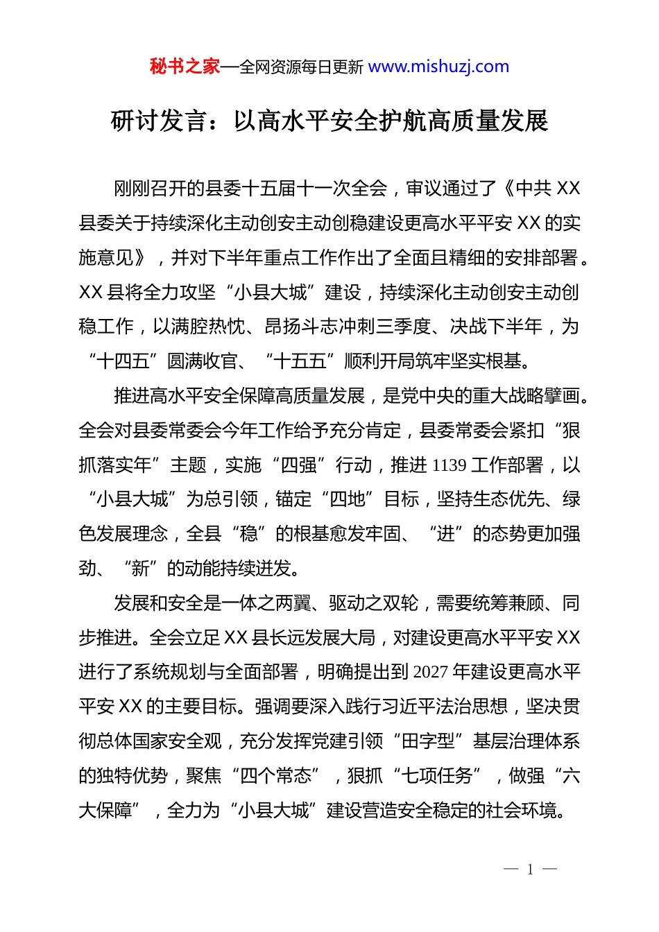 秘书之家—全网资源每日更新 www.mishuzj.com研讨发言:以高水平安全护航高质量发展刚刚召开的县委十五届十一次全会,审议通过了《中共 XX县委关于持续深化主动创安主动创稳建设更高水平平安 XX 的实施意见》,并对下半年重点工作作出了全面且精细的安排部署。XX 县将全力攻坚“小县大城”建设,持续深化主动创安主动创稳工作,以满腔热忱、昂扬斗志冲刺三季度、决战下半年,为“十四五”圆满收官、“十五五”顺利开局筑牢坚实根基。推进高水平安全保障高质量发展,是党中央的重大战略擘画。全会对县委常委会今年工作给予充分肯定,县委常委会紧扣“狠抓落实年”主题,实施“四强”行动,推进 1139 工作部署,以“小县大城”为总引领,锚定“四地”目标,坚持生态优先、绿色发展理念,全县“稳”的根基愈发牢固、“进”的态势更加强劲、“新”的动能持续迸发。发展和安全是一体之两翼、驱动之双轮,需要统筹兼顾、同步推进。全会立足 XX 县长远发展大局,对建设更高水平平安 XX进行了系统规划与全面部署,明确提出到 2027 年建设更高水平平安 XX 的主要目标。强调要深入践行习近平法治思想,坚决贯彻总体国家安全观,充分发挥党建引领“田字型”基层治理体系的独特优势,聚焦“四个常态”,狠抓“七项任务”,做强“六大保障”,全力为“小县大城”建设营造安全稳定的社会环境。— 1 —秘书之家—全网资源每日更新 www.mishuzj.com产业兴则县域兴,产业强则县域强。XX 聚焦“四个重点”引领绿色发展。狠抓产业培育,推动都市农业延链、先进制造业聚链、现代服务业强链,构建现代产业体系;狠抓项目建设,推进“百项千亿工程”,实施高科技项目,夯实发展“基本盘”;狠抓生态保护,推进“三北”工程等项目,争创国家“两山”实践创新基地;狠抓城乡融合,实施“三大攻坚行动”,促进城乡共同繁荣。蓄势“四个动力”赋能绿色发展,深化改革开放,实施“小切口”改革,培育外贸企业;突出科技创新,与高校、企业携手合作,转化科技成果;加强主体培育,实施“四转”工程,壮大企业规模;做强特色园区,优化管理服务,探索“零碳园区”建设。抓实“四个保障”护航绿色发展,强化能源、资金、人才、土地等要素供给;强化民生保障,实施教育卫生、养老托幼工程计划;强化平安保障,提升社会治安防控和公共安全治理水平;强化党建保障,统筹各领域党建,正风肃纪反腐。行至半山需努力,中流击水再出发。全县人民将更加紧密地团结在以习近平同志为核心的党中央周围,坚定信心、锐意进取,开拓创新、笃定实干,以高水平安全护航高质量发展,齐心协力谱写中国式现代化 XX 实践的崭新篇章!— 2 —