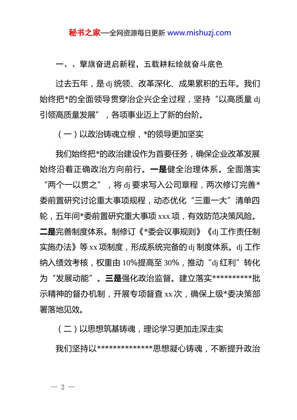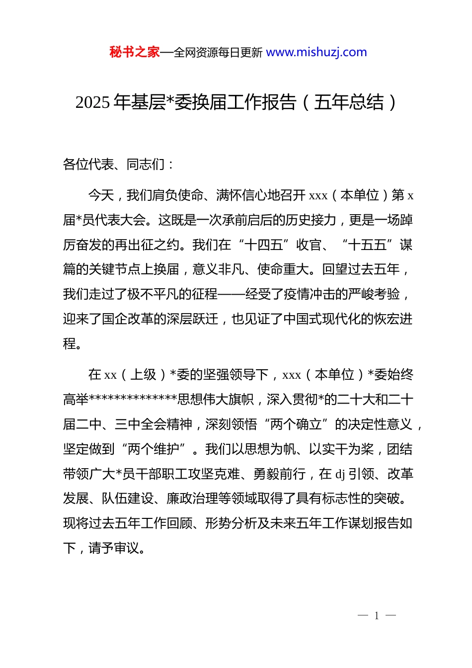 秘书之家—全网资源每日更新 www.mishuzj.com2025 年基层*委换届工作报告(五年总结)各位代表、同志们:今天,我们肩负使命、满怀信心地召开 xxx(本单位)第 x届*员代表大会。这既是一次承前启后的历史接力,更是一场踔厉奋发的再出征之约。我们在“十四五”收官、“十五五”谋篇的关键节点上换届,意义非凡、使命重大。回望过去五年,我们走过了极不平凡的征程——经受了疫情冲击的严峻考验,迎来了国企改革的深层跃迁,也见证了中国式现代化的恢宏进程。在 xx(上级)*委的坚强领导下,xxx(本单位)*委始终高举**************思想伟大旗帜,深入贯彻*的二十大和二十届二中、三中全会精神,深刻领悟“两个确立”的决定性意义,坚定做到“两个维护”。我们以思想为帆、以实干为桨,团结带领广大*员干部职工攻坚克难、勇毅前行,在 dj 引领、改革发展、队伍建设、廉政治理等领域取得了具有标志性的突破。现将过去五年工作回顾、形势分析及未来五年工作谋划报告如下,请予审议。— 1 —秘书之家—全网资源每日更新 www.mishuzj.com一、、擎旗奋进启新程,五载耕耘绘就奋斗底色过去五年,是 dj 统领、改革深化、成果累积的五年。我们始终把*的全面领导贯穿治企兴企全过程,坚持“以高质量 dj引领高质量发展”,各项事业迈上了新的台阶。(一)以政治铸魂立根,*的领导更加坚实我们始终把*的政治建设作为首要任务,确保企业改革发展始终沿着正确政治方向前行。一是健全治理体系。全面落实“两个一以贯之”,将 dj 要求写入公司章程,两次修订完善*委前置研究讨论重大事项规程,动态优化“三重一大”清单四轮,五年间*委前置研究重大事项 xxx 项,有效防范决策风险。二是完善制度体系。制修订《*委会议事规则》《dj 工作责任制实施办法》等 xx 项制度,形成系统完备的 dj 制度体系。dj 工作纳入绩效考核,权重由 10%提高至 30%,推动“dj 红利”转化为“发展动能”。三是强化政治监督。建立落实**********批示精神的督办机制,开展专项督查 xx 次,确保上级*委决策部署落地见效。(二)以思想筑基铸魂,理论学习更加走深走实我们坚持以**************思想凝心铸魂,不断提升政治— 2 —秘书之家—全网资源每日更新 www.mishuzj.com定力与理论修养。一是严格落实“第一议题”制度。*委理论学习中心组集中学习 xx 次、专题研讨 xx 次、专项调研 xx 次,学习《***谈治国理政》等权威著作,确保理论武装入脑入心。二是持续深化 zt 教育。先后开展*史学习教育、zt 教育、dj 学习教育、⑧项规定精神学习教育,举办读书班 xx 期、*课 xx 场,实现学习、整改、提升“三个全覆盖”。打造“xx 理论宣讲”品牌,培育基层宣讲骨干 xx 名,开展“强国复兴有我”“我为群众办实事”等活动,凝聚奋进力量。三是坚守意识形态阵地。完善意识形态工作责任制,强化官网、公众号等阵地监管,开展专项检查 xx 次,牢牢掌握意识形态主动权。(三)以组织筑堡垒垒基,基层 dj 更加坚强有力我们坚持大抓基层导向,推动组织体系全覆盖、功能更强化。一是推进标准化建设。制定*支部年度重点任务清单,实施“*支部提质增效行动”,创建标准化*支部 xx 个,xx 个被评为先进基层*组织。二是创新 dj 载体。借鉴 xxxx 集团“四坚持四强化”经验,设立“攻坚克难*小组”,建立*员先锋岗 xx 个、*员责任区 xx 个;开展“一支部一品牌”活动,培育“xxdj”等品牌 xx 个,xx 案例入选上级优秀案例。三是壮大*员队伍。五年发展新*员 xx 名、培养积极分子 xx 名,实施“三培一推”机— 3 —秘书之家—全网资源每日更新 www.mishuzj.com制,xx 名*员走上中层岗位。四是深化联建共建。与 xx 家单位联合开展*日活动 xx 次,共建成果助力中标 xx 项目,形成互促共赢新格局。(四)以正风肃纪立威,廉政建设更加严实有力我们以“严”的主基调常抓不懈,推动纪律建设与作风建设同频共振。一是厚植廉洁文化。累计组织学习 xxxx 次,参观教育基地 xx 次,召开警示大会 xx 次,通报典型案例 xx 起。二是织密监督体系。形成*委全面监督、纪...
