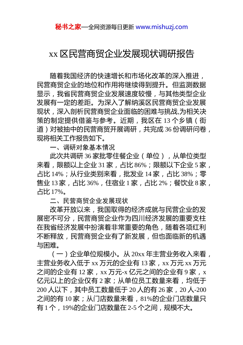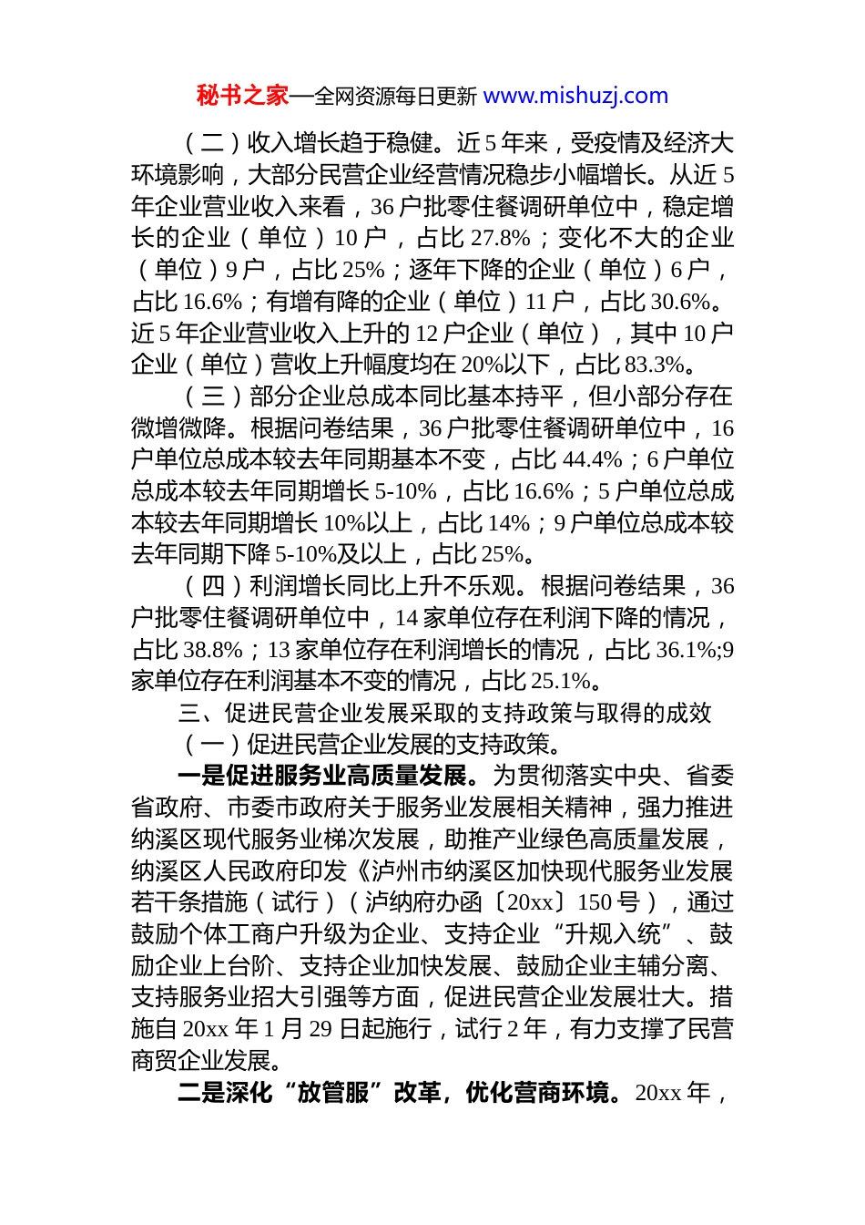 秘书之家—全网资源每日更新 www.mishuzj.comxx 区民营商贸企业发展现状调研报告随着我国经济的快速增长和市场化改革的深入推进,民营商贸企业的地位和作用将继续得到提升。但监测数据显示,我省民营商贸企业发展速度较慢,与其他类型企业发展有一定的差距。为深入了解纳溪区民营商贸企业发展现状,深入剖析民营商贸企业面临的困难与挑战,为相关决策的制定提供借鉴与参考。近期,我区在 13 个乡镇(街道)对被抽中的民营商贸开展调研,共完成 36 份调研问卷,现将相关工作报告如下。一、调研对象基本情况此次共调研 36 家批零住餐企业(单位),从单位类型来看,限额以上企业 31 家,占比 86%;限额以下企业 5 家,占比 14%;从行业类别来看,批发业 14 家,占比 38%;零售业 13 家,占比 36%,住宿业 1 家,占比 2%;餐饮业 8 家,占比 17%。二、民营商贸企业发展现状改革开放以来,我国取得的经济成就与民营企业的发展密不可分,民营商贸企业作为四川经济发展的重要支柱在我省经济发展中扮演着非常重要的角色,随着各项红利不断释放,民营商贸企业有了新发展,但也面临新的机遇与困难。(一)企业单位规模小。从 20xx 年主营业务收入来看,主营业务收入低于 xx 万元的企业有 13 家,xx 万元 xx 万元之间的企业有 12 家,xx 万元-x 亿元之间的企业有 9 家,x亿元以上的企业仅有 2 家;从单位员工数量来看,均低于200 人以下,其中员工数量低于 20 人的有 26 家,20 人-200之间的有 10 家;从门店数量来看,81%的企业门店数量只有 1 个,19%的企业门店数量在 2-5 个之间,规模不大。秘书之家—全网资源每日更新 www.mishuzj.com(二)收入增长趋于稳健。近 5 年来,受疫情及经济大环境影响,大部分民营企业经营情况稳步小幅增长。从近 5年企业营业收入来看,36 户批零住餐调研单位中,稳定增长的企业(单位)10 户,占比 27.8%;变化不大的企业(单位)9 户,占比 25%;逐年下降的企业(单位)6 户,占比 16.6%;有增有降的企业(单位)11 户,占比 30.6%。近 5 年企业营业收入上升的 12 户企业(单位),其中 10 户企业(单位)营收上升幅度均在 20%以下,占比 83.3%。(三)部分企业总成本同比基本持平,但小部分存在微增微降。根据问卷结果,36 户批零住餐调研单位中,16户单位总成本较去年同期基本不变,占比 44.4%;6 户单位总成本较去年同期增长 5-10%,占比 16.6%;5 户单位总成本较去年同期增长 10%以上,占比 14%;9 户单位总成本较去年同期下降 5-10%及以上,占比 25%。(四)利润增长同比上升不乐观。根据问卷结果,36户批零住餐调研单位中,14 家单位存在利润下降的情况,占比 38.8%;13 家单位存在利润增长的情况,占比 36.1%;9家单位存在利润基本不变的情况,占比 25.1%。三、促进民营企业发展采取的支持政策与取得的成效(一)促进民营企业发展的支持政策。一是促进服务业高质量发展。为贯彻落实中央、省委省政府、市委市政府关于服务业发展相关精神,强力推进纳溪区现代服务业梯次发展,助推产业绿色高质量发展,纳溪区人民政府印发《泸州市纳溪区加快现代服务业发展若干条措施(试行)(泸纳府办函〔20xx〕150 号),通过鼓励个体工商户升级为企业、支持企业“升规入统”、鼓励企业上台阶、支持企业加快发展、鼓励企业主辅分离、支持服务业招大引强等方面,促进民营企业发展壮大。措施自 20xx 年 1 月 29 日起施行,试行 2 年,有力支撑了民营商贸企业发展。二是深化“放管服”改革,优化营商环境。20xx 年,秘书之家—全网资源每日更新 www.mishuzj.com为持续深化改革,优化营商环境,激发市场活力,提振市场信心。纳溪区人民政府印发《泸州市纳溪区深化“放管服”改革优化营商环境 20xx 年工作要点》(泸纳府办函〔20xx〕63 号),聚焦市场主体健康发展,大力开展营商环境提升行动,营造公平竞争的市场环境,加强政府诚信建设。三是为企业纾困解难。纳溪区工商联持续激发市场活力和社会创造力,帮助企业解决生产经营困难,促进企业健康有序发展,...