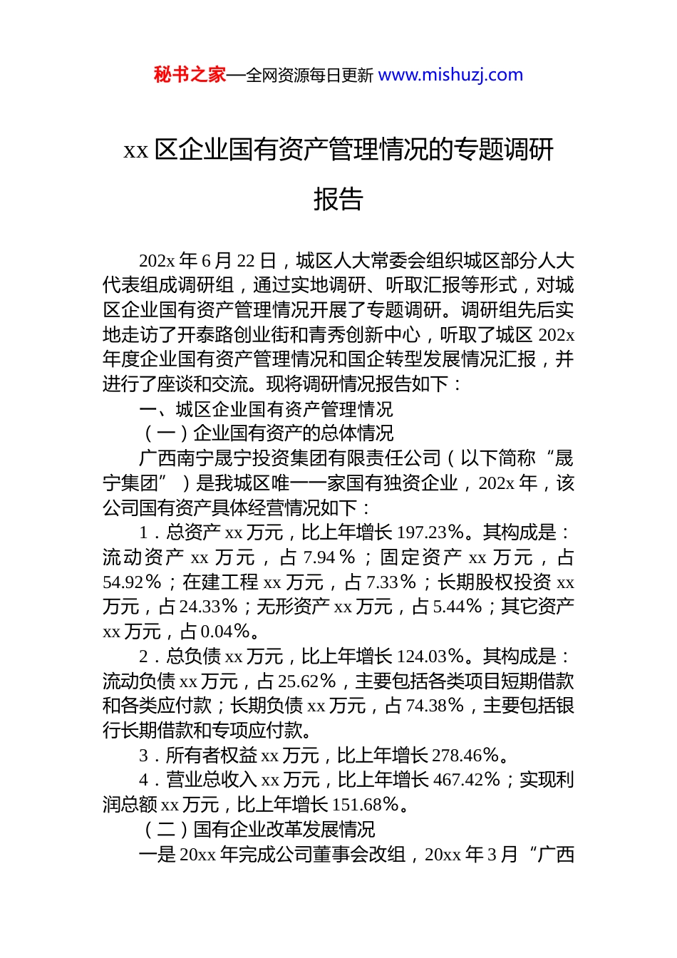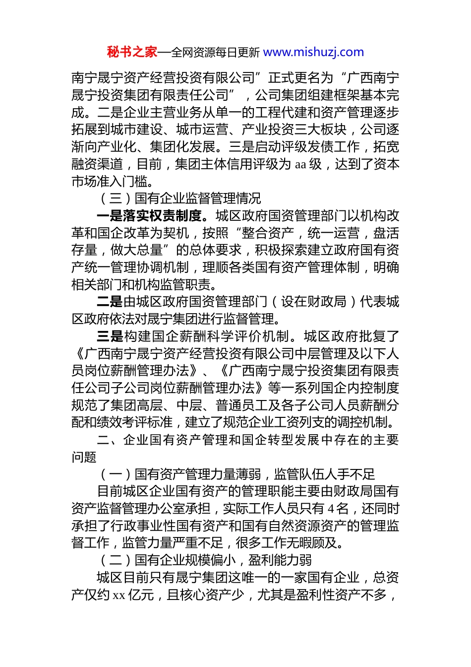 秘书之家—全网资源每日更新 www.mishuzj.comxx 区企业国有资产管理情况的专题调研报告202x 年 6 月 22 日,城区人大常委会组织城区部分人大代表组成调研组,通过实地调研、听取汇报等形式,对城区企业国有资产管理情况开展了专题调研。调研组先后实地走访了开泰路创业街和青秀创新中心,听取了城区 202x年度企业国有资产管理情况和国企转型发展情况汇报,并进行了座谈和交流。现将调研情况报告如下:一、城区企业国有资产管理情况(一)企业国有资产的总体情况广西南宁晟宁投资集团有限责任公司(以下简称“晟宁集团”)是我城区唯一一家国有独资企业,202x 年,该公司国有资产具体经营情况如下:1.总资产 xx 万元,比上年增长 197.23%。其构成是:流 动 资 产 xx 万 元 , 占 7.94 % ; 固 定 资 产 xx 万 元 , 占54.92%;在建工程 xx 万元,占 7.33%;长期股权投资 xx万元,占 24.33%;无形资产 xx 万元,占 5.44%;其它资产xx 万元,占 0.04%。2.总负债 xx 万元,比上年增长 124.03%。其构成是:流动负债 xx 万元,占 25.62%,主要包括各类项目短期借款和各类应付款;长期负债 xx 万元,占 74.38%,主要包括银行长期借款和专项应付款。3.所有者权益 xx 万元,比上年增长 278.46%。4.营业总收入 xx 万元,比上年增长 467.42%;实现利润总额 xx 万元,比上年增长 151.68%。(二)国有企业改革发展情况一是 20xx 年完成公司董事会改组,20xx 年 3 月“广西秘书之家—全网资源每日更新 www.mishuzj.com南宁晟宁资产经营投资有限公司”正式更名为“广西南宁晟宁投资集团有限责任公司”,公司集团组建框架基本完成。二是企业主营业务从单一的工程代建和资产管理逐步拓展到城市建设、城市运营、产业投资三大板块,公司逐渐向产业化、集团化发展。三是启动评级发债工作,拓宽融资渠道,目前,集团主体信用评级为 aa 级,达到了资本市场准入门槛。(三)国有企业监督管理情况一是落实权责制度。城区政府国资管理部门以机构改革和国企改革为契机,按照“整合资产,统一运营,盘活存量,做大总量”的总体要求,积极探索建立政府国有资产统一管理协调机制,理顺各类国有资产管理体制,明确相关部门和机构监管职责。二是由城区政府国资管理部门(设在财政局)代表城区政府依法对晟宁集团进行监督管理。三是构建国企薪酬科学评价机制。城区政府批复了《广西南宁晟宁资产经营投资有限公司中层管理及以下人员岗位薪酬管理办法》、《广西南宁晟宁投资集团有限责任公司子公司岗位薪酬管理办法》等一系列国企内控制度规范了集团高层、中层、普通员工及各子公司人员薪酬分配和绩效考评标准,建立了规范企业工资列支的调控机制。二、企业国有资产管理和国企转型发展中存在的主要问题(一)国有资产管理力量薄弱,监管队伍人手不足目前城区企业国有资产的管理职能主要由财政局国有资产监督管理办公室承担,实际工作人员只有 4 名,还同时承担了行政事业性国有资产和国有自然资源资产的管理监督工作,监管力量严重不足,很多工作无暇顾及。(二)国有企业规模偏小,盈利能力弱城区目前只有晟宁集团这唯一的一家国有企业,总资产仅约 xx 亿元,且核心资产少,尤其是盈利性资产不多,秘书之家—全网资源每日更新 www.mishuzj.com质量不高,20xx 年营业总收入虽然有 xx 亿元,但利润总额仅 xx 万元。(三)自有项目资金缺口大,投融资能力弱随着晟宁集团业务逐步拓展,资金缺口较大,如自有项目中的青秀区乡村风貌提升项目配套资金、多氟多厂房建设资金等多个项目,目前缺口约 5.7 亿元,融资需求不断加大,但晟宁集团融资过于依赖银行贷款,融资渠道受到限制。目前,晟宁集团主体信用评级为 aa,刚达到资本市场准入门槛,还不满足直接融资的条件。(四)上级委派机制不明确,企业监事会尚未完善由于南宁市国资监管企业监事会委派机制因机构改革尚不明确,城区国资监管机构委派监事会方式无参考做法晟宁集团监事会尚未完善。三、几点建议针对存在问题,调研组提出以下建议:(一)健全企业国有资产...