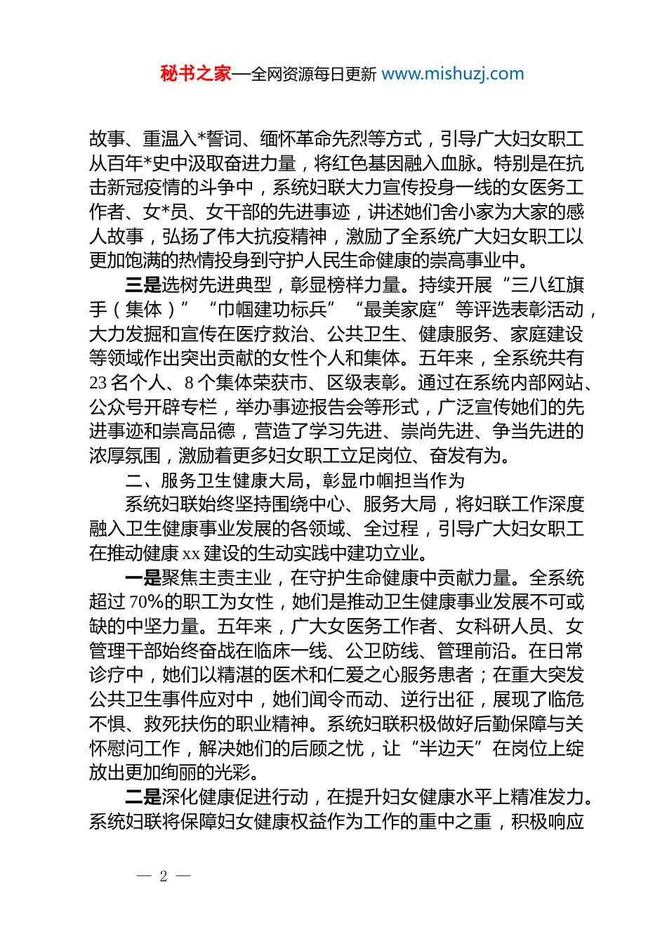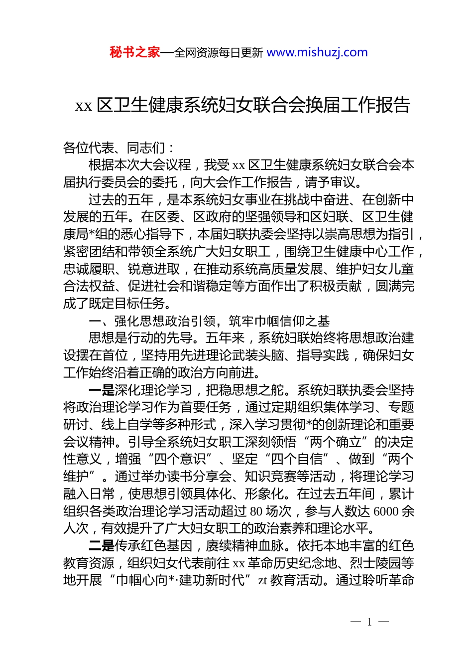 秘书之家—全网资源每日更新 www.mishuzj.comxx 区卫生健康系统妇女联合会换届工作报告各位代表、同志们:根据本次大会议程,我受 xx 区卫生健康系统妇女联合会本届执行委员会的委托,向大会作工作报告,请予审议。过去的五年,是本系统妇女事业在挑战中奋进、在创新中发展的五年。在区委、区政府的坚强领导和区妇联、区卫生健康局*组的悉心指导下,本届妇联执委会坚持以崇高思想为指引,紧密团结和带领全系统广大妇女职工,围绕卫生健康中心工作,忠诚履职、锐意进取,在推动系统高质量发展、维护妇女儿童合法权益、促进社会和谐稳定等方面作出了积极贡献,圆满完成了既定目标任务。一、强化思想政治引领,筑牢巾帼信仰之基思想是行动的先导。五年来,系统妇联始终将思想政治建设摆在首位,坚持用先进理论武装头脑、指导实践,确保妇女工作始终沿着正确的政治方向前进。一是深化理论学习,把稳思想之舵。系统妇联执委会坚持将政治理论学习作为首要任务,通过定期组织集体学习、专题研讨、线上自学等多种形式,深入学习贯彻*的创新理论和重要会议精神。引导全系统妇女职工深刻领悟“两个确立”的决定性意义,增强“四个意识”、坚定“四个自信”、做到“两个维护”。通过举办读书分享会、知识竞赛等活动,将理论学习融入日常,使思想引领具体化、形象化。在过去五年间,累计组织各类政治理论学习活动超过 80 场次,参与人数达 6000 余人次,有效提升了广大妇女职工的政治素养和理论水平。二是传承红色基因,赓续精神血脉。依托本地丰富的红色教育资源,组织妇女代表前往 xx 革命历史纪念地、烈士陵园等地开展“巾帼心向*·建功新时代”zt 教育活动。通过聆听革命— 1 —秘书之家—全网资源每日更新 www.mishuzj.com故事、重温入*誓词、缅怀革命先烈等方式,引导广大妇女职工从百年*史中汲取奋进力量,将红色基因融入血脉。特别是在抗击新冠疫情的斗争中,系统妇联大力宣传投身一线的女医务工作者、女*员、女干部的先进事迹,讲述她们舍小家为大家的感人故事,弘扬了伟大抗疫精神,激励了全系统广大妇女职工以更加饱满的热情投身到守护人民生命健康的崇高事业中。三是选树先进典型,彰显榜样力量。持续开展“三八红旗手(集体)”“巾帼建功标兵”“最美家庭”等评选表彰活动,大力发掘和宣传在医疗救治、公共卫生、健康服务、家庭建设等领域作出突出贡献的女性个人和集体。五年来,全系统共有23 名个人、8 个集体荣获市、区级表彰。通过在系统内部网站、公众号开辟专栏,举办事迹报告会等形式,广泛宣传她们的先进事迹和崇高品德,营造了学习先进、崇尚先进、争当先进的浓厚氛围,激励着更多妇女职工立足岗位、奋发有为。二、服务卫生健康大局,彰显巾帼担当作为系统妇联始终坚持围绕中心、服务大局,将妇联工作深度融入卫生健康事业发展的各领域、全过程,引导广大妇女职工在推动健康 xx 建设的生动实践中建功立业。一是聚焦主责主业,在守护生命健康中贡献力量。全系统超过 70%的职工为女性,她们是推动卫生健康事业发展不可或缺的中坚力量。五年来,广大女医务工作者、女科研人员、女管理干部始终奋战在临床一线、公卫防线、管理前沿。在日常诊疗中,她们以精湛的医术和仁爱之心服务患者;在重大突发公共卫生事件应对中,她们闻令而动、逆行出征,展现了临危不惧、救死扶伤的职业精神。系统妇联积极做好后勤保障与关怀慰问工作,解决她们的后顾之忧,让“半边天”在岗位上绽放出更加绚丽的光彩。二是深化健康促进行动,在提升妇女健康水平上精准发力。系统妇联将保障妇女健康权益作为工作的重中之重,积极响应— 2 —秘书之家—全网资源每日更新 www.mishuzj.com《xx 区整体提升卫生健康水平攻坚行动计划》的要求联合相关业务科室,大力实施妇女健康促进项目。首先,持续推进“两癌”免费筛查项目。作为该项工作的责任单位之一妇联组织积极宣传发动,提高适龄妇女对宫颈癌和乳腺癌筛查的知晓率和参与度。据不完全统计,2020 年至2025 年,在妇联组织的广泛动员下,系统内各医疗机构累计为超过 4.5 万名 xx 区城乡适龄妇女提供了免费筛查服务,对筛...