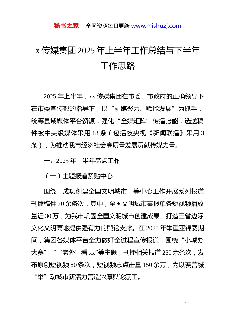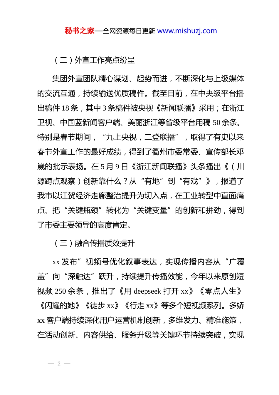 秘书之家—全网资源每日更新 www.mishuzj.comx 传媒集团 2025 年上半年工作总结与下半年工作思路2025 年上半年,xx 传媒集团在市委、市政府的正确领导下,在市委宣传部的指导下,以“融媒聚力、赋能发展”为抓手,统筹县域媒体平台资源,强化“全媒矩阵”传播势能,选送稿件被中央级媒体采用 18 条(包括被央视《新闻联播》采用 3条),为推动我市经济社会高质量发展贡献传媒力量。一、2025 年上半年亮点工作(一)主题报道紧贴中心围绕“成功创建全国文明城市”等中心工作开展系列报道刊播稿件 70 余条次,其中,全国文明城市喜报单条短视频播放量近 30 万,为我市巩固全国文明城市创建成果、打造三省边际文化文明高地提供强有力的舆论支撑。在 2025 年举重亚锦赛期间,集团各媒体平台全力做好全过程宣传报道,围绕“小城办大赛”“‘老外’看 xx”等主题,刊播相关报道 250 余条次,发布原创短视频 80 条次,短视频总点击量 150 余万,为以赛营城、“举”动城市新活力营造浓厚舆论氛围。— 1 —秘书之家—全网资源每日更新 www.mishuzj.com(二)外宣工作亮点纷呈集团外宣团队精心谋划、起势而进,不断深化与上级媒体的交流互通,持续输送优质稿件。截至目前,在中央级平台播出稿件 18 条,其中 3 条稿件被央视《新闻联播》采用;在浙江卫视、中国蓝新闻客户端、美丽浙江等省级平台用稿 50 余条。特别是春节期间,“九上央视,二登联播”,取得了有史以来春节外宣工作的最好成绩,得到了衢州市委常委、宣传部长邓崴的批示表扬。在 5 月 9 日《浙江新闻联播》头条播出《(川源蹲点观察)创新靠什么?从“有地”到“有戏”》,报道了我市以江贺经济走廊整治提升为切入点,在工业转型中直面痛点、把“关键瓶颈”转化为“关键变量”的创新和拼劲,得到了市委主要领导的高度肯定。(三)融合传播质效提升xx 发布”视频号优化叙事表达,实现传播内容从“广覆盖”向“深触达”跃升,持续提升传播效能,今年以来原创短视频 250 余条,推出了《用 deepseek 打开 xx》《零点人生》《闪耀的她》《徒步 xx》《行走 xx》等多个短视频系列。多娇xx 客户端持续深化用户运营机制创新,多维发力、精准施策,在活动创新、内容供给、服务升级等关键环节持续突破,实现— 2 —秘书之家—全网资源每日更新 www.mishuzj.com平台日活用户数维持在 4000-5000 之间,客户端指数保持在全省区县前列。用户时长指标位列全省县市级客户端第二名,在全省新闻例会上得到省委宣传部副部长点名表扬,信息专报得到衢州市委常委、宣传部长邓葳批示,顺利承办衢州市深化媒体融合暨 2025 年度外宣工作推进会。(四)安全播出稳扎稳打以隐患排查整改、技术迭代升级、项目改造建设为具体抓手,不断夯实集团各技术平台的软硬件基础;积极开展安全播出、防恐防爆、消防逃生等应急演练,不断提升安全保障人员的应急处置能力。上半年,集团各项安全保障工作平稳有序,特别是安全播出工作,在技术保障团队的坚实守护下,各技术系统安全平稳运行,未发生安全播出事故,圆满完成了春节、全国两会等重要保障期、重要时间节点、重要时段的广播电视安全保障工作。(五)队伍建设管育并举以锻造“传媒铁军”为目标,聚焦 dj 引领,将学习教育、干部培养与业务发展深度融合。通过部门集中学习、支部“三会一课”,构建常态— 3 —秘书之家—全网资源每日更新 www.mishuzj.com化理论学习机制。创新实施年轻干部“全周期”管理,建立“八小时外”行为监督机制,通过定期家访、全覆盖谈心谈话,促年轻干部队伍“焕活力”。充分发挥“8090”青媒宣讲团先锋作用,深入基层一线开展“媒体融合实践”“新闻为民服务”等特色宣讲,以“青言青语”传递*的声音,在基层实践中锤炼脚力、眼力、脑力、笔力。(六)学习教育走深走实始终将贯彻落实中央八项规定精神作为一项严肃的政治任务和长期的基础性工作来抓。创新构建“领导班子领学+多维载体促学”机制,组织全体干部职工深入学习中央八项规定精神及中央关于作风建设的最新部署要求,持续筑牢全员理想信念根基。紧扣春节、五一等重...